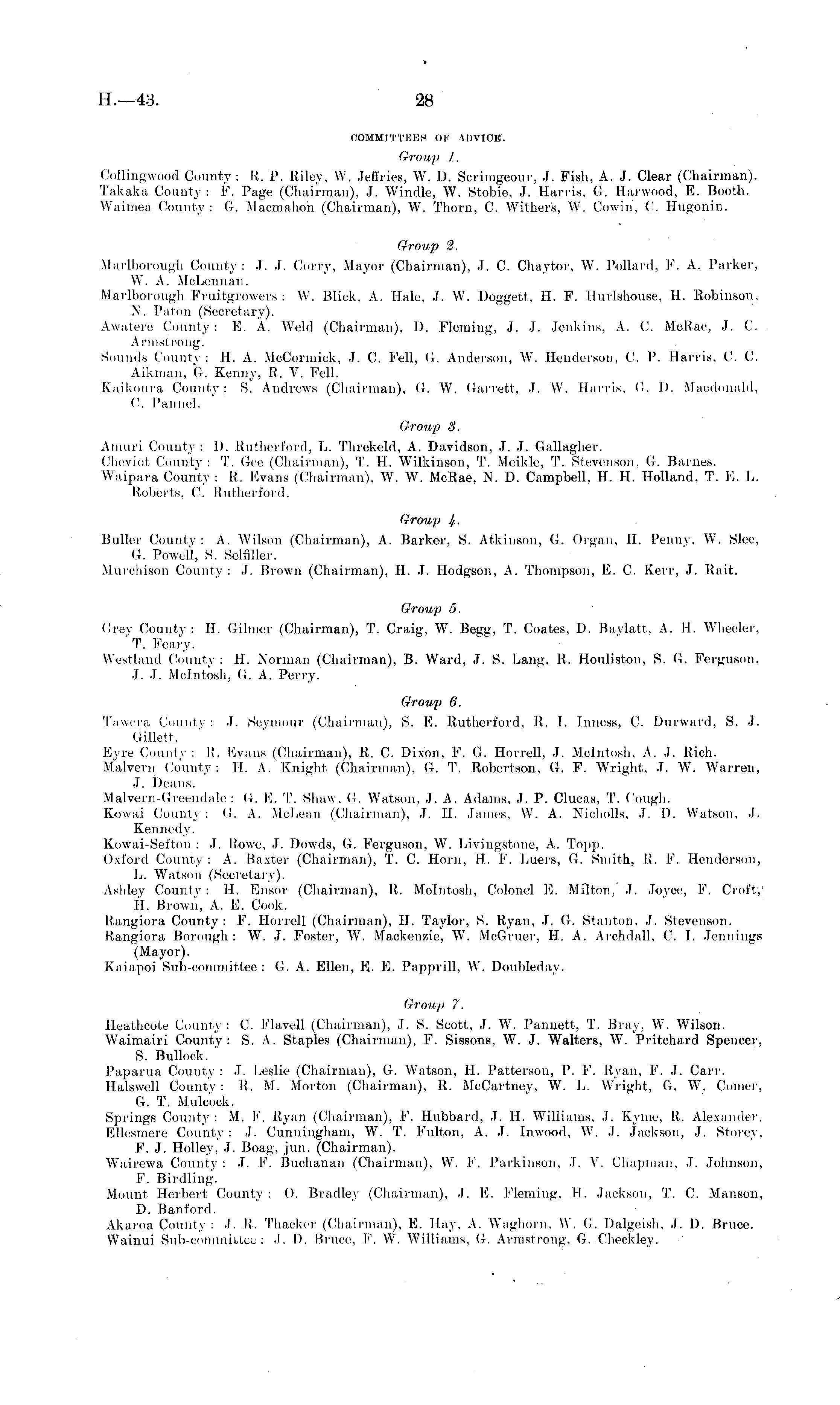 COMMITTEES OF ADVICE. Group 1. Collingwood County: R. P. Riley, W. Jeffries, W. D. Scrimgeour, J. Fish, A. J. Clear (Chairman). Takaka County: F. Page (Chairman), J. Windle, W. Stobie, J. Harris, G, Harwood, E. Booth. Waimea County: G. Macmahoh (Chairman), W. Thorn, C. Withers, W. Cowin, V,. Hugonin. Group 2. Marlborough County: .I. ,l. Corry, Mayor (Chairman), .!. C. Chaytor, W. Pollard, E. A. Parker. W. A. McLennan. Marlborough Fruitgrowers : W. Blick, A. Hale, J. W. Doggett, H. F. I.lurlshouse, H. Robinson, N. Paton (Secretary). Awatere County: E. A. Weld (Chairman), D. Fleming, J, J. Jenkins, A. ('. MoPae, ,1. C. Armstrong. Sounds County: H. A. McCorniick, J. C. Fell, G. Anderson, W. Henderson, (.'. I. Harris. C. C. Aikman, G. Kenny, R. V. Fell. Kaikoura County: S, Andrews (Chairman), G. W. Garrett, .1. W. Harris, G. I). Maedonald, C. Pannel. Group 8. Amuri County: I). Rutherford, L. Threkeld, A. Davidson, J. J. Gallagher. Cheviot County: T. Gee (Chairman), T. H. Wilkinson, T. Meikle, T. Stevenson, G. Barnes. Waipara County : R. Evans (Chairman), W. W. Mcßae, N. D. Campbell, 11. IT. Holland, T. E. L. Roberts, C. Rutherford. Group J/.. Buller County: A. Wilson (Chairman), A. Barker, S. Atkinson, G. Organ, 11. Penny, W. Slee, G. Powell, S. Sclfiller. Murchison County : J. Brown (Chairman), H. J. Hodgson, A. Thompson, E. C. Kerr, J. Rait. Group 5. Grey County : H. Gilmer (Chairman), T. Craig, W. Begg, T. Coates, I). Baylatt, A. 11. Wheeler, T. Feary. Westland County: H. Norman (Chairman), B. Ward, J. S. Lang, R. Iloulistoii, S. G. Ferguson, J. J. Mcintosh, G. A. Perry. Group 6. Tawera County: J. Seymour (Chairman), S. E. Rutherford, R. I. Tnncss, ('. Durward, S. J. Gillett. Eyre County: R. Evans (Chairman), R. C. Dixon, F. G. Horrell, J. Mcintosh. A, J. Rich. Malvern County: 11. A. Knight, (Chairman), G. T. Robertson, G. F. Wright, J. W. Warren, J. Deans. Malvern-Greendale : G. E. T. Shaw, G. Watson, J. A. Adams, J. P. Clucas, T. Cough. Kowai County: (!. A. McLean (Chairman), J. 11. James, W. A. Nioholls, .1. D. Watson, .1. Kennedy. Kowai-Sefton : J, Rowe, J. Dowds, G. Ferguson, W. Livingstone, A. Topp. Oxford County: A. Baxter (Chairman), T. C. Horn, IT. F. Luers, G. Smith, li. E. Henderson, L. Watson (Secretary). Ashley County: H. Elisor (Chairman), It. Mcintosh, Colonel E. Milton, .1. Joyce, I l '. Croft, H. Brown, A. E. Cook. Rangiora County: F. Horrell (Chairman), H. Taylor, S. Ryan. J. G. Stanton, J. Stevenson. Rangiora, Borough: W. J. Foster, W. Mackenzie, W. McGruer, H. A. Arehdall, C. I. Jennings (Mayor). Kaiapoi Sub-committee: G. A. Ellen, E. E. Papprill, W. Doubleday. Group 7. Heathcole County: C. Flavell (Chairman), J. S. Scott, J. W. Pannett, T. Bray, W. Wilson. Waimairi County: S. A. Staples (Chairman), E. Sissons, W. J. Walters, W. Pritchard Spencer, S. Bullock. ' Paparua County: J. Leslie (Chairman), G. Watson, H. Patterson, P. F. Ryan, E. .1. Carr. Halswell County : R. M. Morton (Chairman), R. McCartney, W. L. Wright, G. W. Comer, G. T. Mulcock. Springs Count}': M. E. Ryan (Chairman), F. Hubbard, J. H. Williams, J. Kyme, P. Alexander, Ellesmere County: J. Cunningham, W. T. Fulton, A. J. Inwood, W. .1. Jackson, J. Storey, F. J. Holley, J. Boag, jun. (Chairman). Wairewa County: J. E. Buchanan (Chairman), W. E. Parkinson, J. V. Chapman, J. Johnson, F. Birdliug. Mount Herbert County: 0. Bradley (Chairman), .1. E. Fleming, H. Jackson, T. 0. Manson, D. Banford. Akaroa County : .1. P. Thacker (Chairman), E. Hay, A. Waghorn, W. G. Dalgeish, J. I). Bruce. Wainui Sub-eommiUec : .1. I). Bruce, F. W. Williams, G. Armstrong, G. Check ley.
