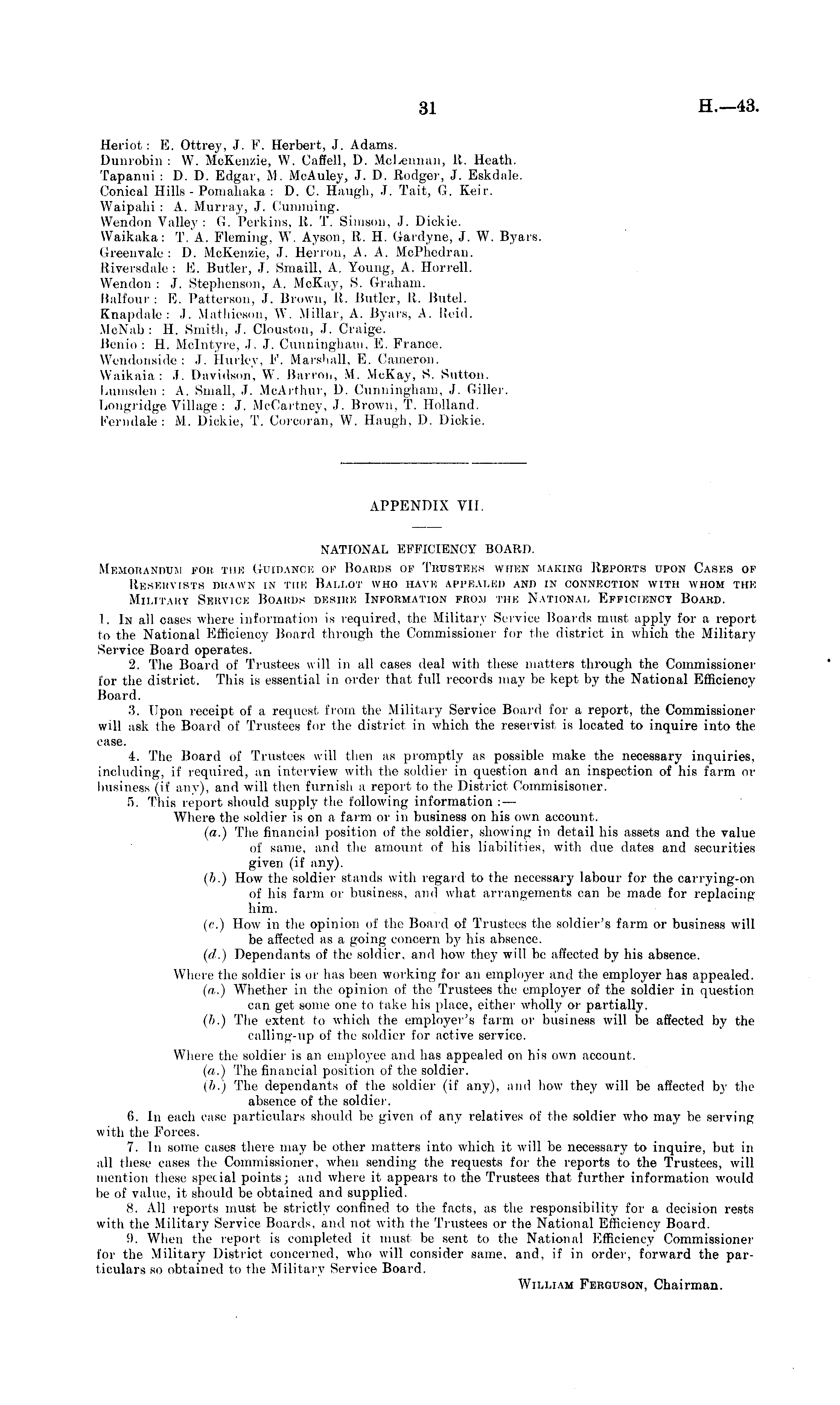 APPENDIX VII. NATIONAL EFFICIENCY BOARD. Memorandum for the Guidance of Boards of Trustees when making Reports upon Cases of Reservists drawn in the Ballot who have appealed and in connection with whom the Military Service Boards desire Information from the National Efficiency Board. 1. In all cases where information is required, the Military Service Boards must apply for a report to the National Efficiency Board through the Commissioner for the district in which the Military Service Board operates. 2. 'Hie Board of Trustees will in all cases deal with these matters through the Commissioner for the district. This is essential in order that full records may be kept by the National Efficiency Board. .'?. Upon receipt of a request from the Military Service Board for a report, the Commissioner will ask the Board of Trustees for the district in which the reservist is located to inquire into the case. 4. The Board of Trustees will then as promptly as possible make the necessary inquiries, including, if required, an interview with the soldier in question and an inspection of his farm or business (if any), and will then furnish a report to the District Coumrisisoner. 5. This report should supply the following information : — Where the soldier is on a farm or in business on his own account. (a.) The financial position of the soldier, showing in detail his assets and the value of same, and the amount of his liabilities, with due dates and securities given (if any). (b.) How the soldier stands with regard to the necessary labour for the carrying-on of his farm or business, and what arrangements can be made for replacing him. (c.) How in the opinion of the Board of Trustees the soldier's farm or business will be affected as a going concern by his absence. (d.) Dependants of the soldier, and how they will be affected by his absence. Where the soldier is or has been working for an employer and the employer has appealed. (a.) Whether in the opinion of the Trustees the employer of the soldier in question can get. some one to take his place, either wholly or partially, (ft.) The extent to which the employer's farm or business will be affected by the calling-up of the soldier for active service. Where the soldier is an employee and has appealed on his own account. (a.) The financial position of the soldier. (b.) The dependants of the soldier (if any), and how they will be affected by the absence of the soldier, (i. In each case particulars should be given of any relatives of the soldier who may be serving with the Forces. 7. In some cases there may be other matters into which it will be necessary to inquire, but in all these cases the Commissioner, when sending the requests for the reports to the Trustees, will mention these special points; and where it appears to the Trustees that further information would be of value, it should be obtained and supplied. 8. All reports must be strictly confined to the facts, as the responsibility for a decision rests with the Military Service Boards, and not with the Trustees or the National Efficiency Board. 9. When the report is completed it must be sent to the National Efficiency Commissioner for the Military District concerned, who will consider same, and, if in order, forward the particulars so obtained to the Military Service Board. William Ferguson, Chairman.
