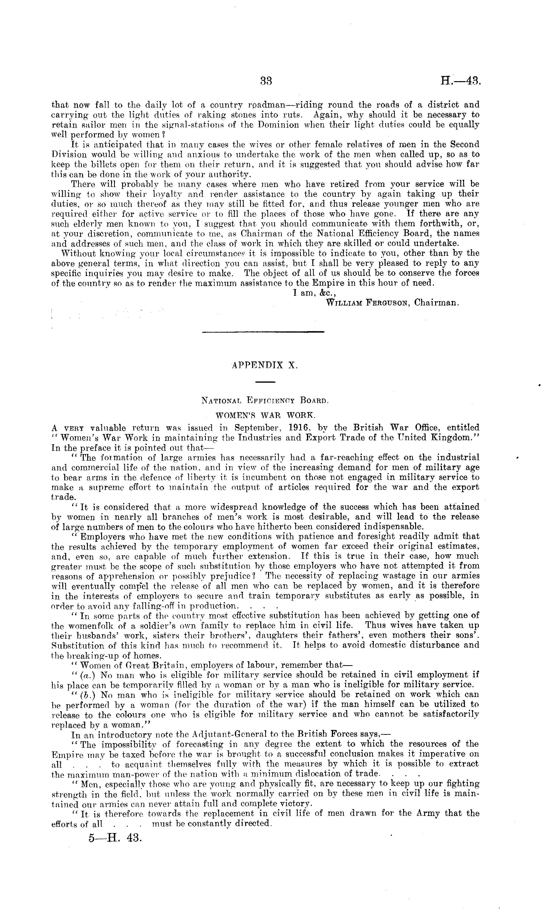 APPENDIX X. National Efficiency Board. WOMEN'S WAR WORK. A very valuable return was issued in September, 1916. by the British War Office, entitled "Women's War Work in maintaining the Industries and Export Trade of the United Kingdom." In the preface it is pointed out that— " The formation of large armies has necessarily had a far-reaching effect on the industrial and commercial life of the nation, and in view of the increasing demand for men of military age to bear arms in the defence of liberty it is incumbent on those not engaged in military service to make a supreme effort, to maintain the output, of articles required for the war and the export, trade. "It is considered that a more widespread knowledge of the success which has been attained by women in nearly all branches of men's work is most desirable, and will lead to the release of large numbers of men to the colours who have hitherto been considered indispensable. " Employers who have met the new conditions with patience and foresight readily admit that, the results achieved by the temporary employment of women far exceed their original estimates, and, even so, are capable of much further extension. If this is true in their case, how much greater must be the scope of such substitution by those employers who have not attempted it from reasons of apprehension or possibly prejudice? The necessity of replacing wastage in our armies will eventually compel the release of all men who can be replaced by women, and it is therefore in the interests of employers to secure and train temporary substitutes as early as possible, in order to avoid any falling-off in production. " In some parts of the country most effective substitution has been achieved by getting one of the womenfolk of a soldier's own family to replace him in civil life. Thus wives have taken up their husbands' work, sisters their brothers', daughters their fathers', even mothers their sons'. Substitution of this kind lias much to recommend it. Tt helps to avoid domestic disturbance and the breaking-up of homes. " Women of Great Britain, employers of labour, remember that— " (a.) No man who is eligible for military service should be retained in civil employment if his place can be temporarily filled by a woman or by a man who is ineligible for military service. " (b.) No man who is ineligible for military service should be retained on work which can be performed by a woman (for the duration of the war) if the man himself can be utilized to release to the colours one who is eligible for military service and who cannot be satisfactorily replaced by a woman." In an'introductory note the Adjutant-General to the British Forces says,— "The impossibility of forecasting in any degree the extent to which the resources of the Empire may be taxed before the war is brought to a successful conclusion makes it imperative on all . to acquaint themselves fully with the measures by which it is possible to extract the maximum man-power of the nation with a minimum dislocation of trade. " Men, especially those who are young and physically fit, are necessary to keep up our fightingstrength in the field, but unless the work normally carried on by these men in civil life is maintained our armies can never attain full and complete victory. " It is therefore towards the replacement in civil life of men drawn for the Army that the efforts of all . . must be constantly directed.