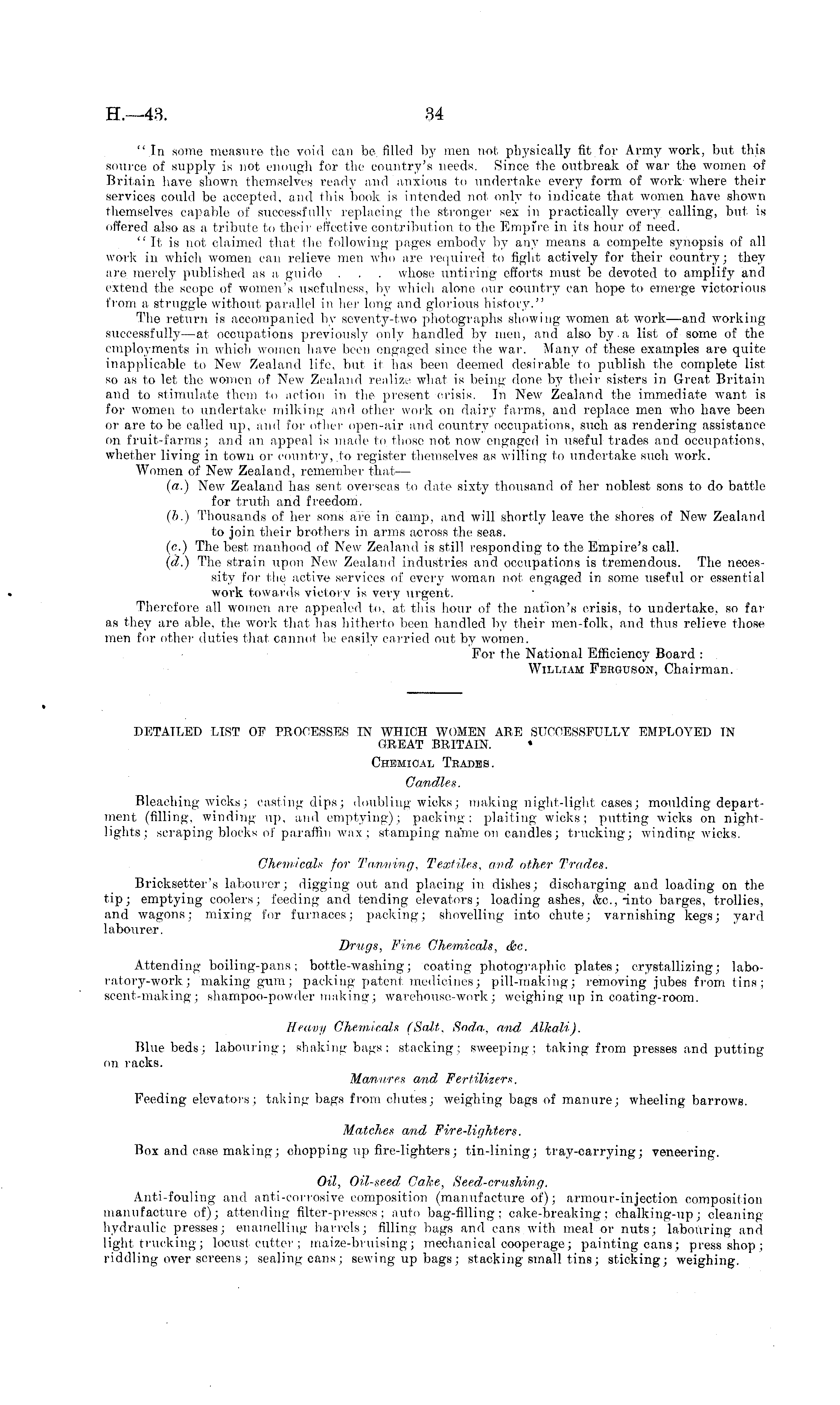 DETAILED LIST OP PROCESSES IN WHICH WOMEN ARE SUCCESSFULLY EMPLOYED TN OREAT BRITAIN. Chemical Trades. Candles. Bleaching, wicks j easting dips; doubling wicks; making night-light cases; moulding department (filling, winding up, and emptying); packing: plaiting wicks; putting wicks on nightlights; scraping blocks of paraffin wax; stamping name on candles; trucking; winding wicks. Chemicals for Tanning, Textiles, and, other Trades. Bricksetter's labourer; digging out and placing in dishes; discharging and loading on the tip; emptying coolers; feeding and tending elevators; loading ashes, &c,-into barges, trollies, and wagons; mixing for furnaces; [lacking; shovelling into chute; varnishing kegs; yard, labourer. Drugs, Fine Chemicals, &c. Attending boiling-pans; bottle-washing; coating photographic, plates; crystallizing; labo-ratory-work; making gum; packing patent medicines; pill-making; removing jubes from tins; scent-making; shampoo-powder making; warehouse-work; weighing up in coating-room. Heavy Chemicals (Salt, Soda, and, Alkali). Blue beds; labouring; shaking bags; stacking: sweeping: taking from presses and putting on racks. Manures and Fertilizers. Feeding elevators ; taking bags from chutes; weighing bags of manure; wheeling barrows. Matches and Fire-lighters. Box and case making; chopping up fire-lighters; tin-lining; tray-carrying; veneering. Oil, Oil-seed Cake, Seed-crushing. Anti-fouling and anti-corrosive composition (manufacture of); armour-injection composition manufacture of); attending filter-presses; auto bag-filling: cake-breaking; chalking-up; cleaning hydraulic presses; enamelling barrels; filling bags and cans with meal or nuts; labouring and light trucking; locust cutter; maize-bruising; mechanical cooperage; painting cans; press shop; riddling over screens; sealing cans; sewing up bags; stacking small tins; sticking; weighing.