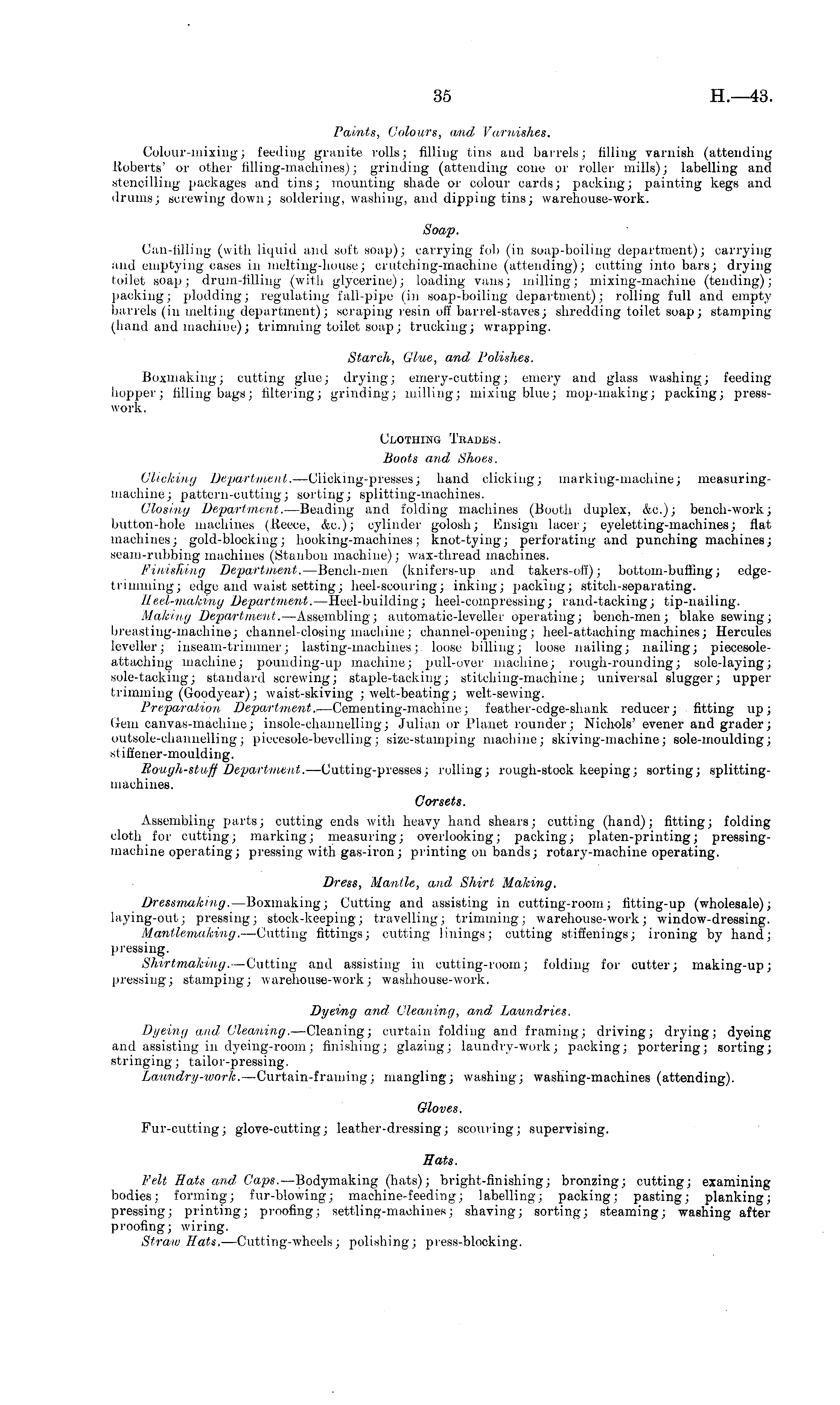 Paints, Colours, and Varnishes. Colour-mixing; feeding granite rolls; filling tins and barrels; filling varnish (attending Roberts' or other filling-machines); grinding (attending cone or roller mills); labelling and stencilling packages and tins; mounting shade or colour cards; packing; painting kegs and drums; screwing down; soldering, washing, and dipping tins; warehouse-work. Soap. Can-filling (with liquid and soft soap); carrying fob (in soap-boiling department); carrying and emptying cases in melting-house; crutching-machine (attending); cutting into bars; drying toilet soap; drum-filling (with glycerine); loading vans; milling; mixing-machine (tending); packing; plodding; regulating fall-pipe (in soap-boiling department); rolling full and empty barrels (in melting department); scraping resin off barrel-staves; shredding toilet soap; stamping (hand and machine); trimming toilet soap; trucking; wrapping. Starch, Glue, and Polishes. Boxmaking; cutting glue; drying; emery-cutting; emery and glass washing; feeding hopper; filling bags; filtering; grinding; milling; mixing blue; mop-making; packing; presswork. Clothing Trades. Boots and Shoes. Clicking Department. —Clieking-presses; hand clicking; marking-machine; measuring machine; pattern-cutting; sorting; splitting-machines. Closing Department. —Beading and folding machines (Booth duplex, &.c); bench-work; button-hole machines (Iteece, &c); cylinder golosh; Ensign lacer; eyeletting-macliines; flat machines; gold-blocking; booking-machines; knot-tying; perforating and punching machines; seam-rubbing machines (Staiibon machine); wax-thread machines. Finishing Department. —Bench-men (knifers-up and takers-off); bottom-buffing; edgetrimming; edge and waist setting; heel-scouring; inking; packing; stitch-separating. Heel-making Department. —Heel-building; heel-compressing; rand-tacking; tip-nailing. Making Department. —Assembling; automatic-leveller operating; bench-men; blako sewing; breastiiig-maohine; channel-closing machine; channel-opening; heel-attaching machines; Hercules leveller; inseam-trimmer; lasting-machines; loose billing; loose nailing; nailing; piecesoleattachiug machine; pounding-up machine; pull-over machine; rough-rounding; solo-laying; sole-tacking; standard screwing; staple-tacking; stitehiiig-machine; universal slugger; upper trimming (Goodycar); waist-skiving ; welt-beating; welt-sewing. Preparation Department.: —Cementing-machine; feather-cdge-shaiik reducer; fitting up; Gem canvas-machine; insole-channelling; Julian or Planet rounder; Nichols' evener and grader; outsole-chanuelling; piecesole-bevelling; size-stamping machine; skiving-machine; sole-moulding; stiffener-moulding. Rough-stuff Department. —Cutting-presses; rolling; rough-stock keeping; sorting; splittingmachines. Corsets. Assembling parts; cutting ends with heavy hand shears; cutting (hand); fitting; folding cloth for cutting; marking; measuring; overlooking; packing; platen-printing; pressingmachine operating; pressing with gas-iron; printing on bands; rotary-machine operating. Dress, Mantle, and Shirt Making. Dressmaking. —Boxmaking; Cutting and assisting in cutting-room; fitting-up (wholesale); laying-out; pressing; stock-keeping; travelling; trimming; warehouse-work; window-dressing. Mantlemaking. —Cutting fittings; cutting linings; cutting stiffenings; ironing by hand; pressing. Shirtmaking. —Cutting and assisting in cutting-room; folding for cutter; making-up; pressing; stamping; warehouse-work; washhouse-work. Dyeing and Cleaning, and Laundries. Dyeing and Cleaning. —Cleaning; curtain folding and framing; driving; drying; dyeing and assisting in dyeing-room; finishing; glazing; laundry-work; packing; portering; sorting; stringing; tailor-pressing. Laundry-work. —Curtain-framing; mangling; washing; washing-machines (attending). Gloves. Fur-cutting; glove-cutting; leather-dressing; scouring; supervising. Hats. Felt Hats and Caps.— Bodymaking (hats); bright-finishing; bronzing; cutting; examining bodies; forming; fur-blowing; machine-feeding; labelling; packing; pasting; planking; pressing; printing; proofing; settling-machines; shaving; sorting; steaming; washing after proofing; wiring. Straw Hats, —Cutting-wheels; polishing; press-blocking.