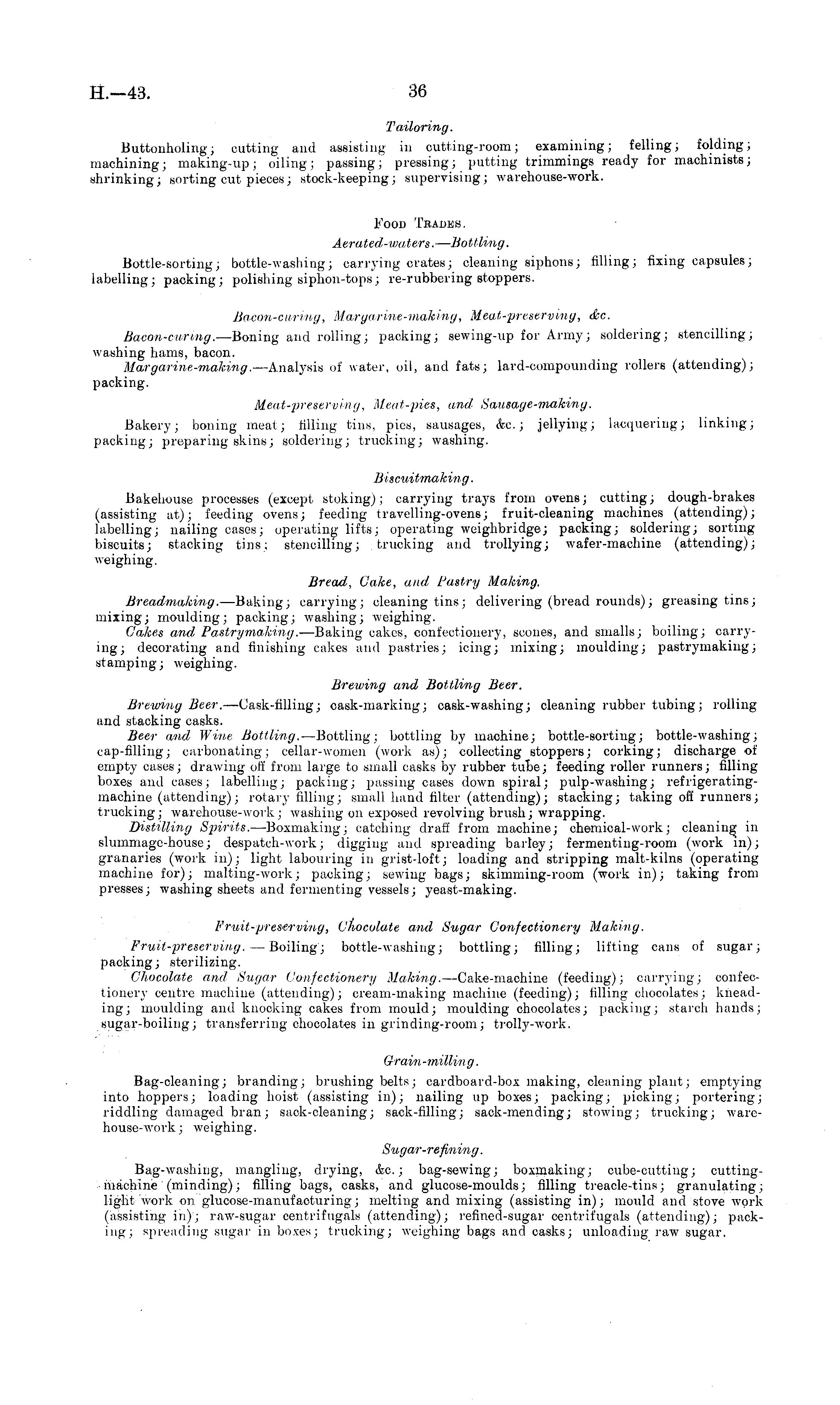 Tailoring. Buttonholing; cutting and assisting m cutting-room; examining; felling; folding, machining; making-up; oiling; passing; pressing; putting trimmings ready for machinists; shrinking; sorting cut, pieces; stock-keeping; supervising; warehouse-work. Food Trades. Aerated-waters. — Bottling. Bottle-sorting; bottle-washing; carrying crates; cleaning siphons; filling; fixing capsules; labelling; packing; polishing siphon-tops; re-rubbering stoppers. Bacon-curing, Margarine-making, Meat-preserving, &c. Bacon-curing. —Boning and rolling; packing; sewing-up for Army; soldering; stencilling; washing hams, bacon. Margarine-making. —Analysis of water, oil, and fats; lard-compounding rollers (attending); packing. Meat-preserving, Meat-pies, and Sausage-making. Bakery; boning meat; filling tins, pies, sausages, &c; jellying; lacquering; linking; packing; preparing skins; soldering; trucking; washing. Biscuitmaking. Bakehouse processes (except stoking); carrying trays from ovens; cutting; dough-brakes (assisting at); feeding ovens; feeding travelling-ovens; fruit-cleaning machines (attending); labelling; nailing cases; operating lifts; operating weighbridge; packing; soldering; sortingbiscuits; stacking tins; stencilling; trucking and trollying; wafer-machine (attending); weighing. Bread, Cake, and Pastry Making. Breadmaking. —Baking; carrying; cleaning tins; delivering (bread rounds); greasing tins; mixing; moulding; packing; washing; weighing. Cakes and, Pastrymaking. —Baking cakes, confectionery, scones, and smalls; boiling; carrying; decorating and finishing cakes and pastries; icing; mixing; moulding; pastrymaking; stamping; weighing. Brewing and Bottling Beer. Brewing Beer.— Cask-filling; cask-marking; cask-washing; cleaning rubber tubing; rolling and stacking casks. Beer and Wine Bottling. —Bottling; bottling by machine; bottle-sorting; bottle-washing; cap-filling; carbonating; cellar-women (work as); collecting stoppers; corking; discharge of empty cases; drawing off from large to small casks by rubber tube; feeding roller runners; filling boxes and eases; labelling; packing; passing cases down spiral; pulp-washing; refrigeratingmachine (attending); rotary filling; small hand filter (attending); stacking; taking off runners; trucking; warehouse-work; washing on exposed revolving brush; wrapping. Distilling Spirits. —Boxmaking; catching draff from machine; chemical-work; cleaning in slummage-house; despatch-work; digging ami spreading barley; fermeuting-room (work m); granaries (work in); light labouring in grist-loft; loading and stripping malt-kilns (operating machine for); malting-work; packing; sewing bags; skimming-room (work in); taking from presses; washing sheets and fermenting vessels; yeast-making. Fruit-preserving, Chocolate and Sugar Confectionery Making. Fruit-preserving, — Boiling; bottle-washing; bottling; filling; lifting cans of sugar; packing; sterilizing. Chocolate and Sugar Confectionery Making. —Cake-machine (feeding); carrying; confectionery centre machine (attending); cream-making machine (feeding); filling chocolates; kneading; moulding and knocking cakes from mould; moulding chocolates; packing; starch hands; sugar-boiling; transferring chocolates in grinding-room; trolly-work. Grain-milling. Bag-cleaning; branding; brushing belts; cardboard-box making, cleaning plant; emptying into hoppers; loading hoist (assisting in); nailing up boxes; packing; picking; portering; riddling damaged bran; sack-cleaning; sack-filling; sack-mending; stowing; trucking; ware-house-work; weighing. Sugar-refining. Bag-washing, mangling, drying, &c.; bag-sewing; boxmaking; cube-cutting; cutting- - machine (minding); filling bags, casks, and glucose-moulds; filling treacle-tins; granulating; light work on glucose-manufacturing; melting and mixing (assisting in); mould and stove work (assisting in); raw-sugar centrifugals (attending); refined-sugar centrifugals (attending); packing; spreading sugar in boxes; trucking; weighing bags and casks; unloading raw sugar.