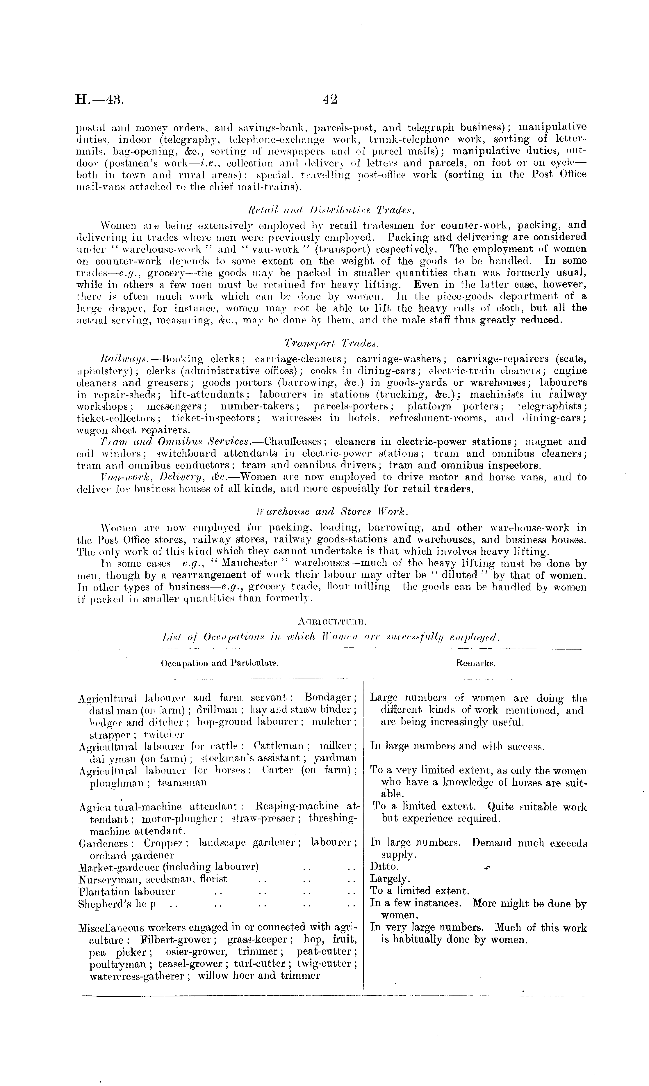 postal and money orders, and savings-bank, parcels-post, and telegraph business); manipulative duties, indoor (telegraphy, telephone-exchange work, trunk-telephone work, sorting of lettermails, bag-opening, (fee, sorting of newspapers and of parcel mails); manipulative duties, outdoor (postmen's work — i.e., collection and delivery of letters and parcels, on foot or on oych — both in town and rural areas); special, travelling post-office work (sorting in the Post Office mail-vans attached to the chief mail-trains). Retail and Distributive Trades. Women are being extensively employed by retail tradesmen for counter-work, packing, and delivering in trades where men were previously employed. Packing and delivering are considered under "warehouse-work" and "van-work" (transport) respectively. The employment of women on counter-work depends to some extent on the weight of the goods to be handled. In some trades — e.g., grocery—the goods may be packed in smaller quantities than was formerly usual, while in others a few men must be retained for heavy lifting. Even in the latter case, however, there is often much work which can bo done by women. In the piece-goods department of a large draper, for instance, women may not be able to lift the heavy rolls of cloth, but all the actual serving, measuring, &c, may be done by them, and the male staff thus greatly reduced. Transport Trades. Railways. —Booking clerks; carriage-cleaners; carriage-washers; carriage-repairers (seats, upholstery); clerks (administrative offices); cooks in dining-cars; electric-train cleaners; engine cleaners and greasers; goods porters (harrowing, (fee) in goods-yards or warehouses; labourers in repair-sheds; lift-attendants; labourers in stations (trucking, (fee); machinists in railway workshops; messengers; number-takers; parcels-porters; platform porters; telegraphists; ticket-collectors; ticket-inspectors; waitresses in hotels, refreshment-rooms, and dining-cars; wagon-sheet repairers. Tram and Omnibus Services. —Chauffeuses; cleaners in electric-power stations; magnet and coil winders; switchboard attendants in electric-power stations; tram and omnibus cleaners; tram and omnibus conductors; tram and omnibus drivers; tram and omnibus inspectors. Van-work, Delivery, dr.. —Women are now employed to drive motor and horse vans, and to deliver for business houses of all kinds, and more especially for retail traders. 11 ar chouse and Stores Work. Women are now employed for packing, loading, harrowing, and other warehouse-work in the Post Office stores, railway stores, railway goods-stations and warehouses, and business houses. The only work of this kind which they cannot, undertake is that which involves heavy lifting. In some cases — e.g., " Manchester " warehouses—much of the heavy lifting must be done by men, though by a rearrangement of work their labour may offer be " diluted " by that of women. In other types of business — e.g., grocery trade, Hour-milling —the goods can be handled by women if packed in smaller quantities than formerly.
