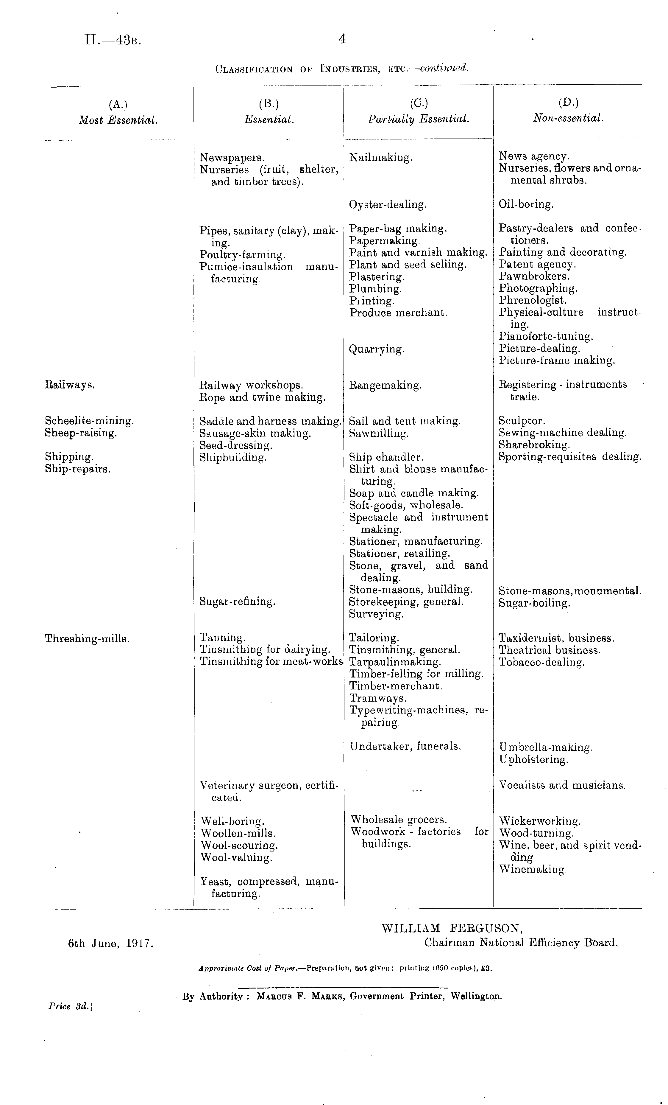 (A.) Most Essential. (B.) (C.) Partially Essential. (D.) Essential. Non-essential. Newspapers. Nurseries (fruit, shelter, and timber trees). Nailmaking. News agency. Nurseries, flowers and ornamental shrubs. Oyster-dealing. Oil-boring. Pipes, sanitary (clay), making. Poultry- f ar mi ng. Pumice-insulation manufacturing. Paper-bag making. Papermaking. Paint and varnish making. Plant and seed selling. Plastering. Plumbing. Printing. Produce merchant. Pastry-dealers and confectioners. Painting and decorating. Patent agency. Pawnbrokers. Photographing. Phrenologist. Physical-culture instructing. Pianoforte-tuning. Picture-dealing. Picture-frame making. Railway workshops. Rope and twine making. Quarrying. Railways. Rangeinaking. Registering - instruments trade. 3cheelite-mining. Sheep-raising. Saddle and harness making. Sausage-skin making. Seed-dressing. Shipbuilding. Sail and tent making. Sawmilling. Sculptor. Sewing-machine dealing. Sharebroking. Sporting-requisites dealing, Shipping. Ship-repairs. Sugar-refining. Ship chandler. Shirt and blouse manufacturing. Soap and candle making. Soft-goods, wholesale. Spectacle and instrument making. Stationer, manufacturing. Stationer, retailing. Stone, gravel, and sand dealing. Stone-masons, building. Storekeeping, general. Surveying. Stone-masons, monumental, Sugar-boiling. 'hreshing-mills. Tanning. Tinsmithing for dairying. Tinsmithing for meat-works Tailoring. Tinsmithing, general. Tarpaulinmaking. Timber-felling for milling. Timber-merchant, Tramways, Typewriting-machines, repairing. Taxidermist, business. Theatrical business. Tobacco-dealing. Veterinary surgeon, certificated. Undertaker, funerals. Umbrella-making. Upholstering. Vocalists and musicians. Well-boring. Woollen-mills. Wool-scouring. Wool-valuing. Wholesale grocers. Woodwork - factories for buildings. Wickerworking. Wood-turning. Wine, beer, and spirit vendding. Winemaking, Yeast, compressed, manufacturing.