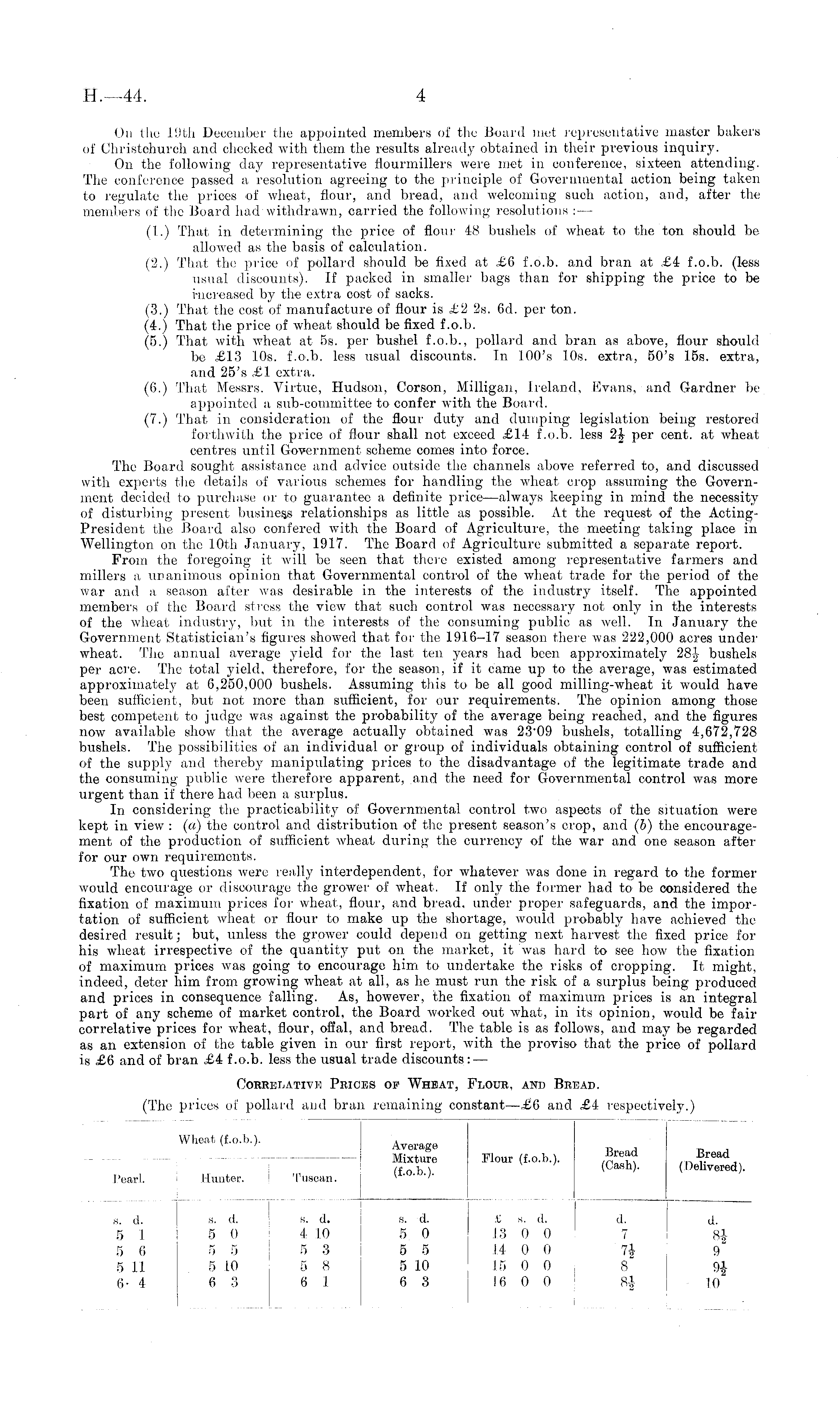 On the 19th December the appointed members of the Board met representative master bakers of Christchurch and checked with them the results already obtained in their previous inquiry. On the following day representative fiourmillers were met in conference, sixteen attending. The conference passed a resolution agreeing to the principle of Governmental action being taken to regulate the prices of wheat, flour, and bread, and welcoming such action, and, after the members of the Board had withdrawn, carried the following resolutions : — (I.) That in. determining the price of flour 48 bushels of wheat to the ton should be allowed as the basis of calculation. (2.) That the price of pollard should be fixed at £6 f.o.b. and bran at £4 f.o.b. (less usual discounts). If packed in smaller bags than for shipping the price to be increased by the extra cost of sacks. (3.) That the cost of manufacture of flour is £2 2s. 6d. per ton. (4.) That the price of wheat should be fixed f.o.b. (5.) That with wheat at ss. per bushel f.0.b., pollard and bran as above, flour should be £13 10s. f.o.b. less usual discounts. In 100's 10s. extra, 50's 15s. extra, and 25's £1 extra. (6.) That Messrs. Virtue, Hudson, Corson, Milligan, Ireland, Evans, and Gardner be appointed a sub-committee to confer with the Board. (7.) That in consideration of the flour duty and dumping legislation being restored forthwith the price of flour shall not exceed £14 f.o.b. less 2£ per cent, at wheat centres until Government scheme comes into force. The Board sought assistance and advice outside the channels above referred to, and discussed with experts the details of various schemes for handling the wheat crop assuming the Government decided to purchase or to guarantee a definite price—always keeping in mind the necessity of disturbing present business relationships as little as possible. At the request of the ActingPresident the Board also conferee! with the Board of Agriculture, the meeting taking place in Wellington on the 10th January, 1917. The Board of Agriculture submitted a separate report. From the foregoing it will be seen that there existed among representative farmers and millers a unanimous opinion that Governmental control of the wheat trade for the period of the war and a season after was desirable in the interests of the industry itself. The appointed members of the Board stress the view that such control was necessary not only in the interests of the wheat industry, but in the interests of the consuming public as well. In January the Government Statistician's figures showed that for the 1916-17 season there was 222,000 acres under wheat. The annual average yield for the last ten years had been approximately 28J,- bushels per acre. The total yield, therefore, for the season, if it came up to the average, was estimated approximately at 6,250,000 bushels. Assuming this to be all good milling-wheat it would have been sufficient, but not more than sufficient, for our requirements. The opinion among those best competent to judge was against the probability of the average being reached, and the figures now available show that the average actually obtained was 23"09 bushels, totalling 4,672,728 bushels. The possibilities of an individual or group of individuals obtaining control of sufficient of the supply and thereby manipulating prices to the disadvantage of the legitimate trade and the consuming public were therefore apparent, and the need for Governmental control was more urgent than if there had been a surplus. In considering the practicability of Governmental control two aspects of the situation were kept in view : (a) the control and distribution of the present season's crop, and (b) the encouragement of the production of sufficient wheat during the currency of the war and one season after for our own requirements. The two questions Avere really interdependent, for whatever was done in regard to the former would encourage or discourage the grower of wheat. If only the former had to be considered the fixation of maximum prices for wheat, flour, and bread, under proper safeguards, and the importation of sufficient wheat or flour to make up the shortage, would probably have achieved the desired, result; but, unless the grower could depend on getting next harvest the fixed price for his wheat irrespective of the quantity put on the market, it was hard to see how the fixation of maximum prices was going to encourage him to undertake the risks of cropping. It might, indeed, deter him from growing wheat at all, as he must run the risk of a surplus being produced and prices in consequence falling. As, however, the fixation of maximum prices is an integral part of any scheme of market control, the Board worked out what, in its opinion, would be fair correlative prices for wheat, flour, offal, and bread. The table is as follows, and may be regarded as an extension of the table given in our first report, with the proviso that the price of pollard is £6 and of bran £4 f.o.b. less the usual trade discounts : —