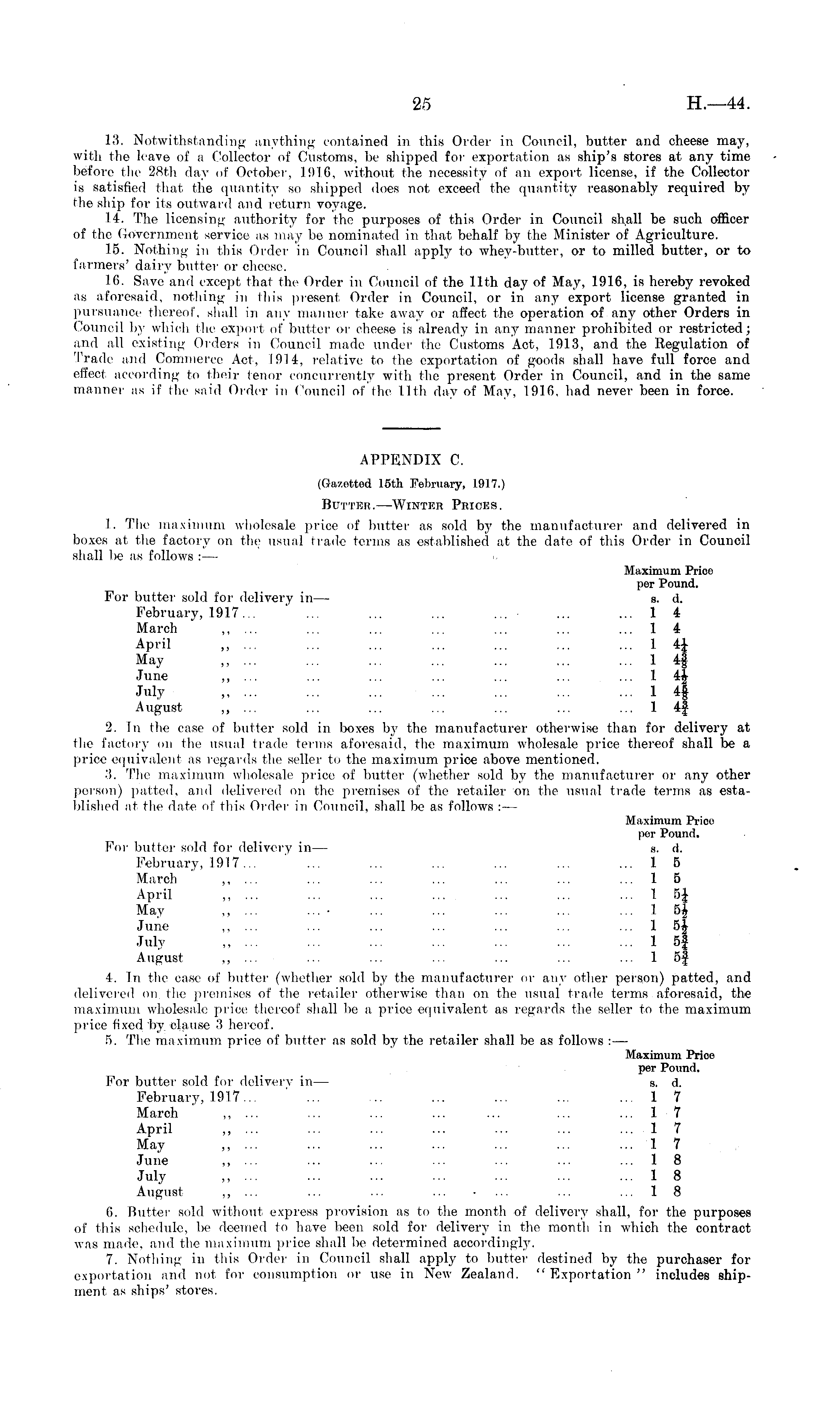 13. Notwithstanding anything contained in. this Order in Council, butter and cheese may, with the leave of a Collector of Customs, be shipped for exportation as ship's stores at any time before the 28th day of October, 1916, without the necessity of an export license, if the Collector is satisfied that the quantity so shipped does not exceed the quantity reasonably required by the ship for its outward and return voyage. 14. The licensing authority for the purposes of this Order in Council shall be such officer of the Government service as may be nominated in that behalf by the Minister of Agriculture. 15. Nothing in this Order in Council shall apply to whey-butter, or to milled butter, or to farmers' dairy butter or cheese, 16. Save and except that the Order in Council of the 11th day of May, 1916, is hereby revoked as aforesaid, nothing in this present, Order in Council, or in any export license granted in pursuance thereof, shall in any manner take away or affect the operation of any other Orders in Council by which the export of butter or cheese is already in any manner prohibited or restricted; and all existing Orders in Council made under the Customs Act, 1913, and the Regulation of Trade and Commerce Act, 1914, relative to the exportation of goods shall have full force and effect according to their tenor concurrentiy with the present Order in Council, and in the same manner as if the said Order in Council of the 11th day of May, 1916, had never been in force. APPENDIX C. (Gazetted 15th February, 1917.) Butter. —Winter Prices. 1. The maximum wholesale price of butter as sold by the manufacturer and delivered in boxes at the factory on the usual trade terms as established at the date of this Order in Council shall be as follows :— Maximum Prieo per Pound. For butter sold for delivery in— s. d. February, 1917... ... ... ... ... ... ... 1 4 March ~ ... ... ... ... ... ... ... 1 4 April „ 1 41 May „ 1 4f June ~ ... ... ... ... ... ... ... I 4 1 July , 1 4| August ~ ... ... ... ... ... ... ... 1 4f 2. In the case of butter sold in boxes by the manufacturer otherwise than for delivery at the factory on the usual trade terms aforesaid, the maximum wholesale price thereof shall be a price equivalent as regards the seller to the maximum price above mentioned. 3. The maximum wholesale price of butter (whether sold by the manufacturer or any other person) patted, and delivered on the premises of the retailer on the usual trade terms as established at the date of this Order in Council, shall be as follows :— Maximum Price per Pound. For butter sold for delivery in— s. d. February, 1917... ... ... ... ... ... ... 1 5 March ~ ... ... ... ... ... ... ... 1 5 April ~ ... ... ... ... ... ... ... 1 5J May ~ ... ... • ... ... ... ... ... 1 5| June ~ ... ... ... ... ... ... ... 1 5 1 July ~ ... ... ... ... ... ... ... 1 5f August ~ ... ... ... ... ... ... ... 1 5| 4:. In the case of butter (whether sold by the manufacturer or any other person) patted, and delivered on the premises of the retailer otherwise than on the usual trade terms aforesaid, the maximum wholesale price thereof shall be a price equivalent as regards the seller to the maximum price fixed fry clause 3 hereof. 5. The maximum price of butter as sold by the retailer shall be as follows : — Maximum Prioe per Pound. For butter sold for delivery in— s. d, February, 1917... ... ..._ ... ... ... ... 1 7 March ~ ... ... ..." ... ... ... ... 17 April ~ ... ... ... ... ... ... ... 1 7 May ~ ... ... ... ... ... ... ... 1 7 June ~ ... ... .. ... ... ... ... 1 8 July ~ ... ... ... ... ... ... ... 1 8 August ~ ... ... ... ... • ... ... ... 1 8 6. Butter sold without, express provision as to the month of delivery shall, for the purposes of this schedule, be deemed to have been sold for delivery in the month in which the contract was made, and the maximum price shall be determined accordingly. 7. Nothing in this Order in Council shall apply to butter destined by the purchaser for exportation and not. for consumption or use in New Zealand. " Exportation " includes shipment, as ships' stores.