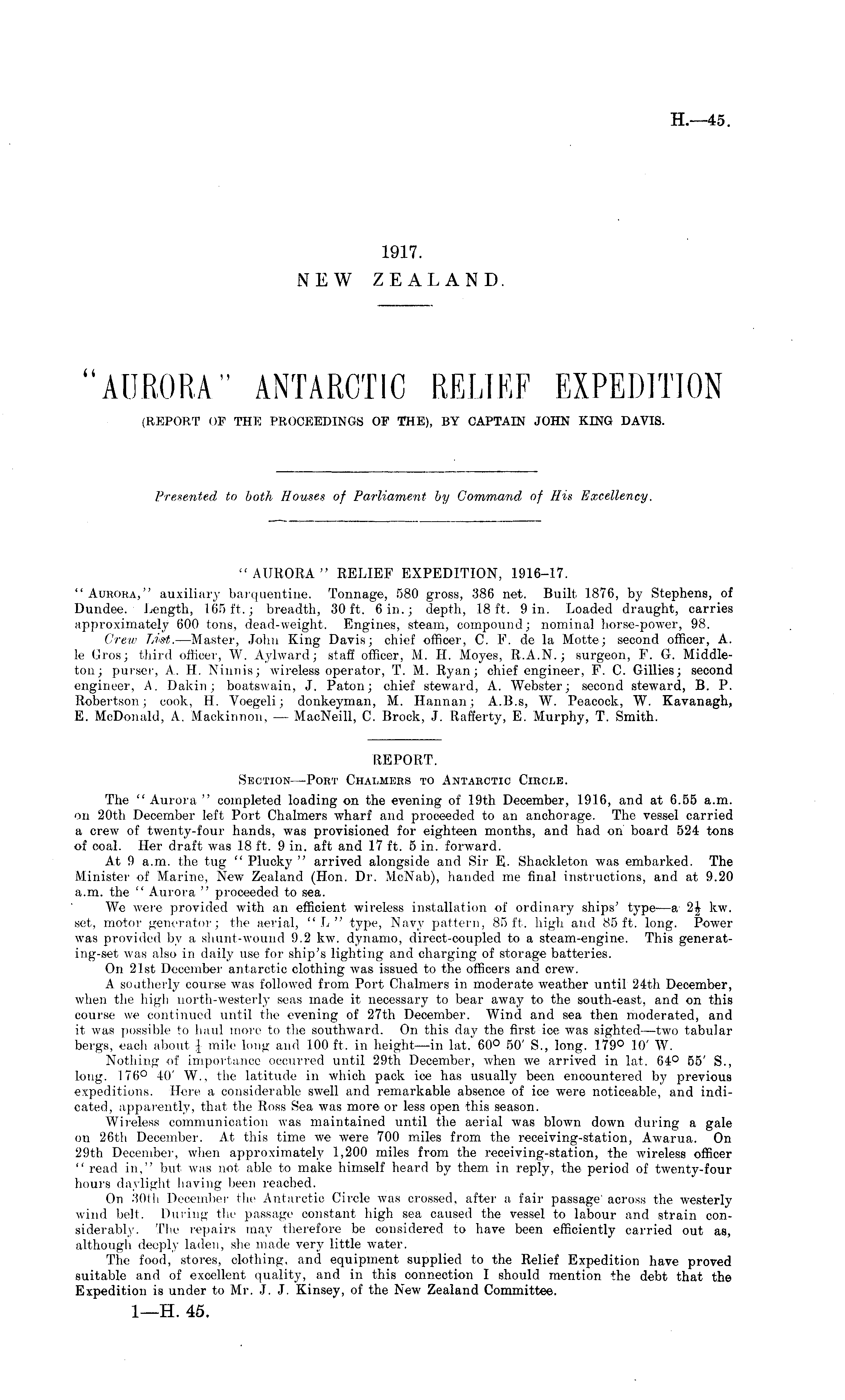 "AURORA" RELIEF EXPEDITION, 1916-17. "Aurora," auxiliary barquentine. Tonnage, 580 gross, 386 net. Built 1876, by Stephens, of Dundee. Length, 165 ft.; breadth, 30 ft. 6 in.; depth, 18 ft. 9 in. Loaded draught, carries approximately 600 tons, dead-weight. Engines, steam, compound; nominal horse-power, 98. Crew List. —Master, John King Davis; chief officer, C. F. de la Motte; second officer, A. le Gros; third officer, W. Aylward; staff officer, M. H. Moves, R.A.N.; surgeon, F. G. Middleton; purser, A. H. Ninnis; wireless operator, T. M. Ryan; chief engineer, F. C. Gillies; second engineer, A. Dakin; boatswain, J. Paton; chief steward, A. Webster; second steward, B. P. Robertson; cook, H. Voegeli; donkeyman, M. Hannan; A.B.s, W. Peacock, W. Kavanagh, E. McDonald, A. Mackinnon, — MacNeill, C. Brock, J. Rafferty, E. Murphy, T. Smith. REPORT. Section —Port Chalmers to Antarctic Circle. The " Aurora " completed loading on the evening of 19th December, 1916, and at 6.55 a.m. on 20th December left Port Chalmers wharf and proceeded to an anchorage. The vessel carried a crew of twenty-four hands, was provisioned for eighteen months, and had on board 524 tons of coal. Her draft was 18 ft. 9 in. aft and 17 ft. 5 in. forward. At 9 a.m. the tug " Plucky " arrived alongside and Sir E. Shackleton was embarked. The Minister of Marino, New Zealand (Hon. Dr. McNab), handed me final instructions, and at 9.20 a.m. the " Aurora " proceeded to sea. We were provided with an efficient wireless installation of ordinary ships' type —a 2i kw. set, motor generator; the aerial, "L" type, Navy pattern, 85ft. high and 85ft. long. Power was provided by a shunt-wound 9.2 kw. dynamo, direct-coupled to a steam-engine. This generat-ing-set was also in daily use for ship's lighting and charging of storage batteries. On 21st December antarctic clothing was issued to the officers and crew. A southerly course was followed from Port Chalmers in moderate weather until 24th December, when the high north-westerly seas made it necessary to bear away to the south-east, and on this course we continued until the evening of 27th December. Wind and sea then moderated, and it was possible to haul more to the southward. On this day the first ice was sighted—two tabular bergs, each about J mile long and 100 ft. in height—in hit. 60° 50' S., long. 179° 10' W. Nothing of importance occurred until 29th December, when we arrived in lat. 64° 55' S., long. 176° 40' W., the latitude in which pack ice has usually been encountered by previous expeditions. Here a considerable swell and remarkable absence of ice were noticeable, and indicated, apparently, that the Ross Sea was more or less open this season. Wireless communication was maintained until the aerial was blown down during a gale on 26th December. At this time we were 700 miles from the receiving-station, Awarua. On 29th December, when approximately 1,200 miles from the receiving-station, the wireless officer " read in," but was not able to make himself heard by them in reply, the period of twenty-four hours daylight having been reached. On 30th December the Antarctic Circle was crossed, after a fail' passage' across the westerly wind belt. During the passage constant high sea caused the vessel to labour and strain considerably. The repairs may therefore be considered to have been efficiently carried out as, although deeply laden, she made very little water. The food, stores, clothing, and equipment supplied to the Relief Expedition have proved suitable and of excellent quality, and in this connection I should mention the debt that the Expedition is under to Mr. J. J. Kinsey, of the New Zealand Committee.