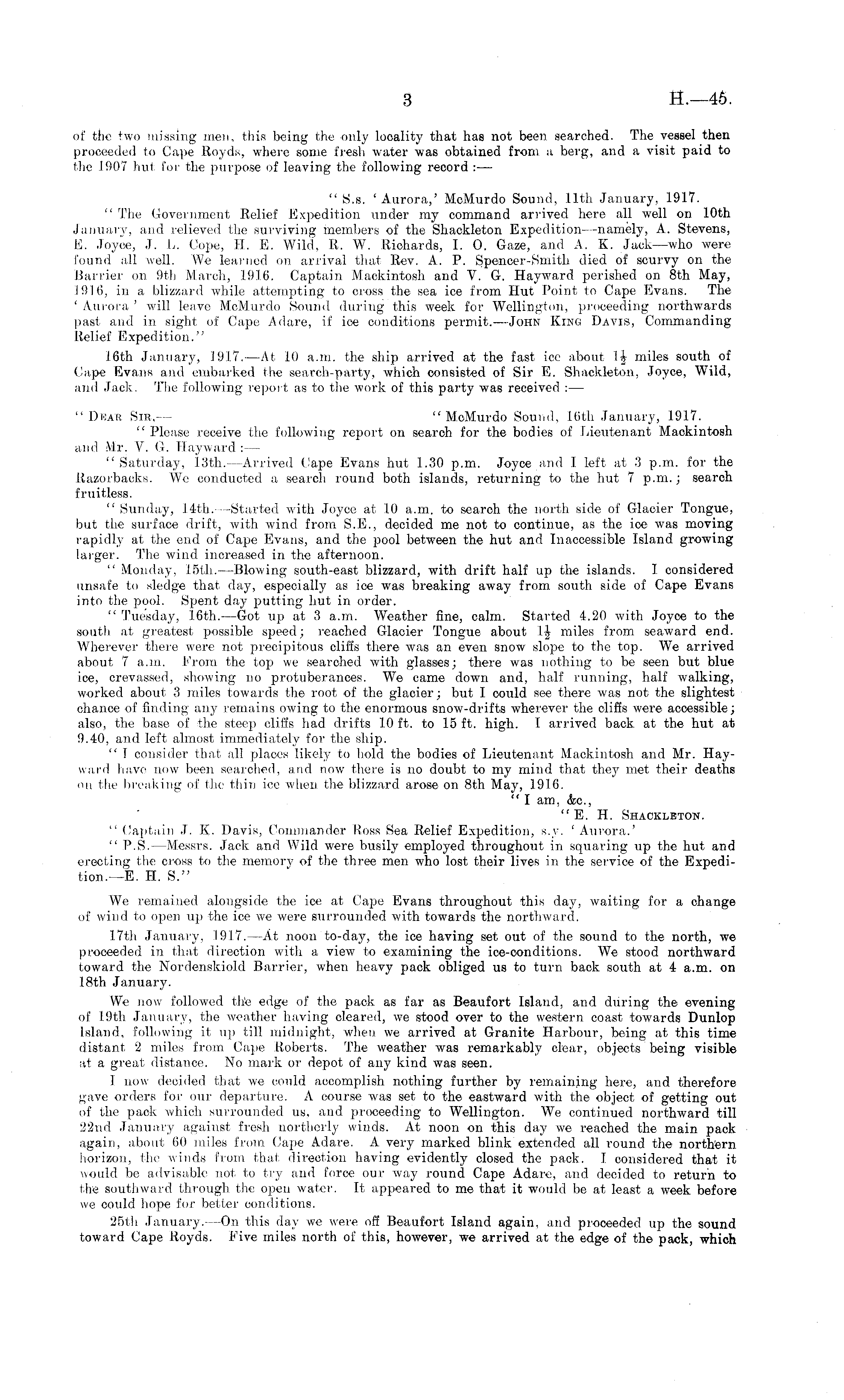 of the two missing men. this being the only locality that has not been searched. The vessel then proceeded to Cape Royds, where some fresh water was obtained from a berg, and a visit paid to the 1907 hut for the purpose of leaving the following record : — " S.s. 'Aurora,' McMurdo Sound, 11th January, 1917. " The Government Relief Expedition under my command arrived here all well on 10th January, and relieved the surviving members of the Shackleton Expedition —namely, A. Stevens, E. Joyce, J. L. Cope, H. E. Wild, R. W. Richards, I. 0. Gaze, and A. K. Jack —who were found all well. We learned on arrival that Rev. A. P. Spencer-Smith died of scurvy on the Barrier on 9th March, 1916. Captain Mackintosh and V. G. Hayward perished on Bth May, L 916, in a blizzard while attempting to cross the sea ice from Hut Point to Cape Evans. The ' Aurora ' will leave McMurdo Sound during this week for Wellington, proceeding northwards past and in sight of Cape Adare, if ice conditions permit.—John Kino Davis, Commanding Relief Expedition." 16th January, 1917. —At 10 a.m. the ship arrived at the fast ice about 1J miles south of Cape Evans and embarked the search-party, which consisted of Sir E. Shackleton, Joyce, Wild, and Jack. The following report as to the work of this party was received : — " Dear Sir, — " McMurdo Sound, LGtli January, 1917. " Please receive the following report on search for the bodies of Lieutenant Mackintosh and Mr. V. G. Hayward : — " Saturday, 13th.—Arrived Cape Evans hut 1.30 p.m. Joyce and 1 left at 3 p.m. for the Razorbacks. We conducted a search round both islands, returning to the hut 7 p.m.; search fruitless. "Sunday, J4th. Started with Joyce at 10 a.m. to search the north side of Glacier Tongue, but the surface drift, with wind from S.E., decided me not to continue, as the ice was moving rapidly at the end of Cape Evans, and the pool between the hut and Inaccessible Island growing larger. The wind increased in the afternoon. " Monday, 15th. —Blowing south-east blizzard, with drift half up the islands. I considered unsafe to sledge that day, especially as ice was breaking away from south side of Cape Evans into the pool. Spent day putting hut in order. " Tuesday, 16th.—Got up at 3 a.m. Weather fine, calm. Started 4.20 with Joyce to the south at greatest possible speed; reached Glacier Tongue about 1J miles from seaward end. Wherever there were not precipitous cliffs there was an even snow slope to the top. We arrived about 7 a.m. From the top we searched with glasses; there was nothing to be seen but blue ice, crevassed, showing no protuberances. We came down and, half running, half walking, worked about 3 miles towards the root of the glacier; but I could see there was not the slightest chance of finding any remains owing to the enormous snow-drifts wherever the cliffs were accessible; also, the base of the steep cliffs had drifts 10 ft. to 15 ft. high. I arrived back at the hut at 9.40, and left almost immediately for the ship. " I consider that all places likely to hold the bodies of Lieutenant Mackintosh and Mr. Hayward have now been searched, and now there is no doubt to my mind that they met their deaths on the breaking of the thin ice when the blizzard arose on Bth May, 1916. " I am, &c, " E. H. Shackleton. " Captain J. K. Davis, Commander Ross Sea Relief Expedition, s.y. ' Aurora.' " P.S. —Messrs. Jack and Wild were busily employed throughout in squaring up the hut and erecting the cross to the memory of the three men who lost their lives in the service of the Expedition.—E. H. S." We remained alongside the ice at ('ape Evans throughout this day, waiting for a change of wind to open up the ice we were surrounded with towards the northward. 17th January, 1917. —At noon to-day, the ice having set out of the sound to the north, we proceeded in that direction with a view to examining the ice-conditions. We stood northward toward the Nordenskiold Barrier, when heavy pack obliged us to turn back south at 4 a.m. on 18th January. We now followed the edge of the pack as far as Beaufort Island, and during the evening of 19th January, the weather having cleared, we stood over to the western coast towards Dunlop Island, following it up till midnight, when we arrived at Granite Harbour, being at this time distant 2 miles from Cape Roberts. The weather was remarkably clear, objects being visible at a great distance. No mark or depot of any kind was seen. I now decided that we could accomplish nothing further by remaining here, and therefore gave orders for our departure. A course was set to the eastward with the object of getting out of the pack which surrounded us, and proceeding to Wellington. We continued northward till 22nd January against fresh northerly winds. At noon on this day we reached the main pack again, about 60 miles from ('ape Adare. A very marked blink extended all round the northern horizon, the winds from that; direction having evidently closed the pack. I considered that it would be advisable not to try and force our way round Cape Adare, and decided to return to the southward through the open water. It appeared to me that it would be at least a week before we could hope for better conditions. 25th January.—On this day we were off Beaufort Island again, and proceeded up the sound toward Cape Royds. Five miles north of this, however, we arrived at the edge of the pack, which