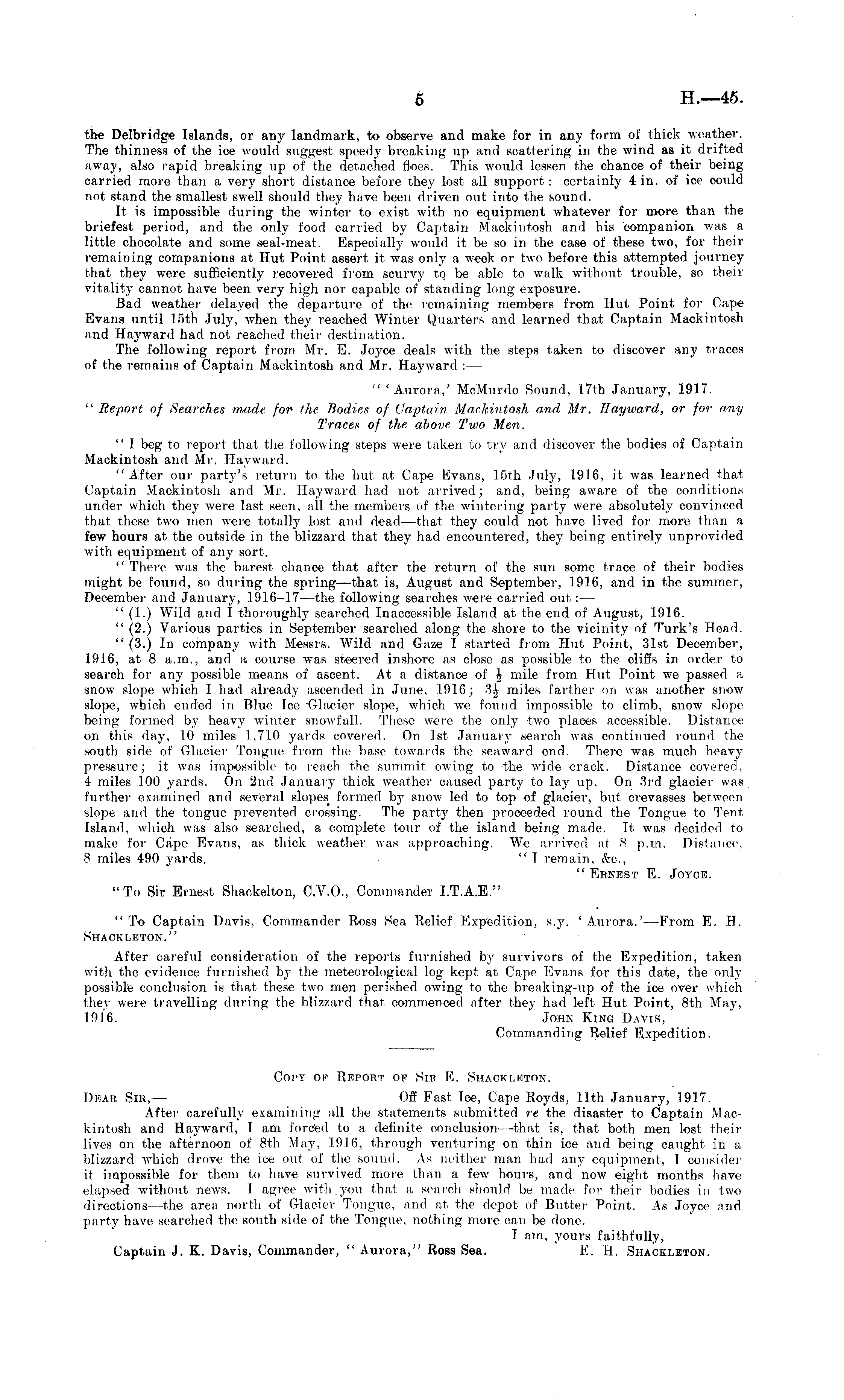 the Delbridge Islands, or any landmark, to observe and make for in any form of thick weather. The thinness of the ice would suggest speedy breaking up and scattering in the wind as it drifted away, also rapid breaking up of the detached floes. This would lessen the chance of their being carried more than a very short distance before they lost all support: certainly 4 in. of ice could not stand the smallest swell should they have been driven out into the sound. It is impossible during the winter to exist with no equipment whatever for more than the briefest period, and the only food carried by Captain Mackintosh and his 'companion was a little chocolate and some seal-meat. Especially would it be so in the case of these two, for their remaining companions at Hut Point assert it was only a week or two before this attempted journey that they were sufficiently recovered from scurvy to be able to walk without trouble, so their vitality cannot have been very high nor capable of standing long exposure. Bad weather delayed the departure of the remaining members from Hut Point for Cape Evans until 15th July, when they reached Winter Quarters and learned that Captain Mackintosh and Hayward had not reached their destination. The following report from Mr. E. Joyce deals with the steps taken to discover any traces of the remains of Captain Mackintosh and Mr. Hayward : — " 'Aurora,' McMurdo Sound, 17th January, 1917. "Report of Searches made for the Bodies of Captain Mackintosh and Mr. Hayward,, or for any Traces of the above Two Men. " J beg to report that the following steps were taken to try and discover the bodies of Captain Mackintosh and Mr. Hayward. "After our party's return to the hut at Cape Evans, 15th July, 1916, it was learned that Captain Mackintosh and Mr. Hayward had not arrived; and, being aware of the conditions under which they were last seen, all the members of the wintering party were absolutely convinced that these two men were totally lost and dead—that they could not have lived for more than a few hours at the outside in the blizzard that they had encountered, they being entirely unprovided with equipment of any sort. "There was the barest chance that after the return of the sun some trace of their bodies might be found, so during the spring—that is, August and September, 1916, and in the summer, December and January, 1916-17—the following searches were carried out: — " (1.) Wild and I thoroughly sea7'ched Inaccessible Island at the end of August, 1916. " (2.) Various parties in September searched along the shore to the vicinity of Turk's Head. " (3.) In company with Messrs. Wild and Gaze I started from Hut Point, 31st December, 1916, at 8 a.m., and a course was steered inshore as close as possible to the cliffs in order to search for any possible means of ascent. At a distance of \ mile from Hut Point we passed a snow slope which I had alreadj- ascended in June, 1916; miles farther on was another snow slope, which ended in Blue Ice Glacier slope, which we found impossible to climb, snow slope being formed by heavy winter snowfall. These were the only two places accessible. Distance on this day, 10 miles 1,710 yards covered. On Ist January search was continued round the south side of Glacier Tongue from the base towards the seaward end. There was much heavy pressure; it was impossible to reach the summit owing to the wide crack. Distance covered, 4 miles 100 yards. On 2nd January thick weather caused party to lay up. On 3rd glacier was further examined and several slopes formed by snow led to top of glacier, but crevasses between slope and the tongue prevented crossing. The party then proceeded round the Tongue to Tent Island, which was also searched, a complete tour of the island being made. It was decided to make for Cape Evans, as thick weather was approaching. We arrived at 8 p.m. Distance, 8 miles 490 yards. " I remain, &c., " Ernest E. Joyce. "To Sir Ernest Shackelton, C.V.0., Commander 1.T.A.E." " To Captain Davis, Commander Ross Sea Relief Expedition, s.y. ' Aurora.'—From E. H. Shackleton." After careful consideration of the reports furnished by survivors of the Expedition, taken with the evidence furnished by the meteorological log kept at Cape Evans for this date, the only possible conclusion is that these two men perished owing to the breaking-up of the ice over which they were travelling during the blizzard that commenced after they had left Hut Point, Bth May, 1916. John Kinc Davis, Commanding Relief Expedition. Copy of Report op Sir E. Shackleton. Dear Sir, — Off Fast Ice, Cape Royds, 11th January, 1917. After carefully examining all the statements submitted re the disaster to Captain Mackintosh and Hayward, I am forced to a definite conclusion—that is, that both men lost their lives on the afternoon of Bth May, 1916, through venturing on thin ice and being caught in a blizzard which drove the ice out of the sound. As neither man had any equipment, I consider it impossible for them to have survived more than a few hours, and now eight months have elapsed without news. I agree with,you that a search should be made for their bodies in two directions —the area north of Glacier Tongue, and at the depot of Butter Point. As Joyce and party have searched the south side of the Tongue, nothing more can be done. I am, yours faithfully, Captain J. K. Davis, Commander, "Aurora," Ross Sea. E. H. Shackleton.