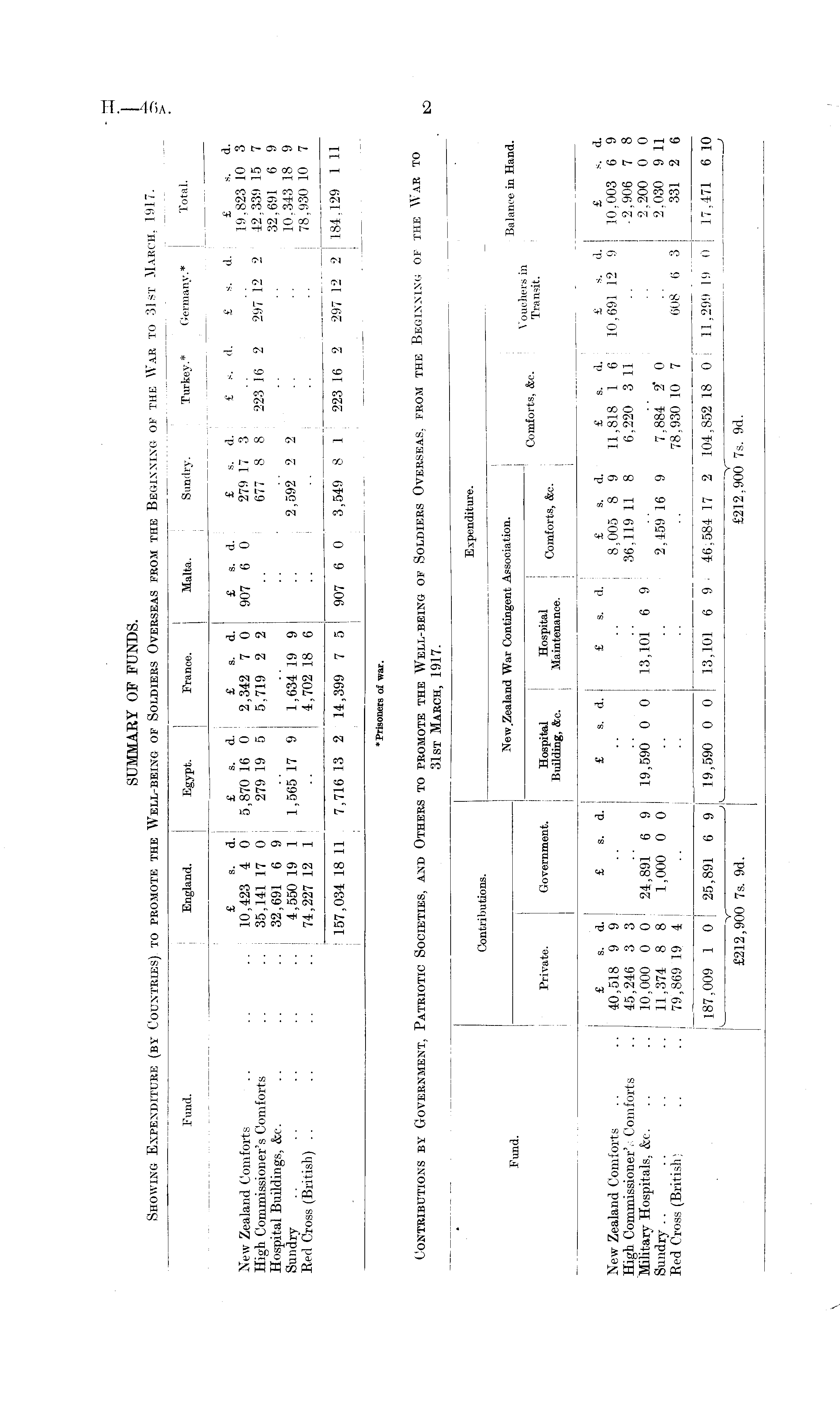 Fund. England. EgyptFrance. Malta. Malta. Sum Iry. Sundry. Turkey.* Germany.* Total. I I _i_ [ New Zealand Comforts High Commissioner's Comforts Hospital Buildings, <fcc. Sundry Bed Cross (British) .. £ s. d. 10,423 4 0 35,141 17 0 32.691 6 9 4,550 19 1 74,227 12 1 ( £ s. 5,870 16 279 19 1,565 17 d0 5 9 £ s. d. 2,342 7 0 5,719 2 2 1,634 19 9 4,702 18 6 £ s. d. 907 6 0 £ s. 279 17 677 8 2,592 2 d. 3 8 2 £ s. d. 223 16 2 £ s. d. 297 12 2 £ s. d. 19.823 10 3 42.339 15 7 32.691 6 9 10.343 18 9 78.930 10 7 157,034 18 11 7,716 13 2 2 14,399 7 5 14,399 7 5 5 907 6 0 3,549 8 1 223 16 2 297 12 2 184,129 1 11 _J * Prisoners of war.