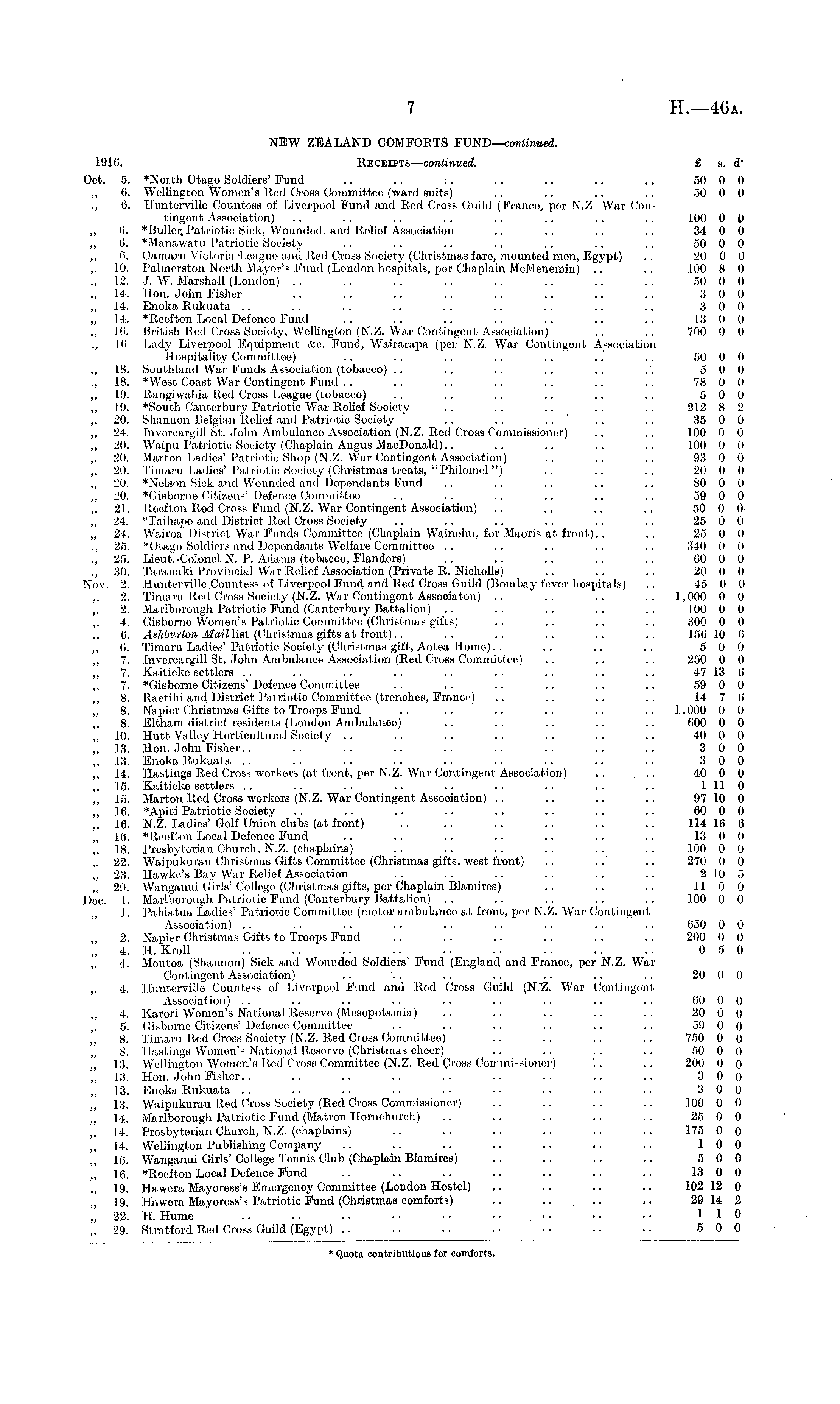 NEW ZEALAND COMFORTS FUND— continued. 1916. Receipts-— continued. £ s. d' Oct. 5. "North Otago Soldiers' Fund .. .. .. .. .. .. .. 50 0 0 ~ 0. Wellington Women's Bed Cross Committeo (ward suits) .. .. .. .. 50 0 0 ~ 6. Hunterville Countess of Liverpool Fund and Red Cross Guild (France, per N.Z. War Contingent Association) .. .. .. .. .. .. .. .. 100 0 0 „ 6. "Buller, Patriotic Sick, Wounded, and Relief Association .. .. .. .. 34 0 0 ~ 6. "Manawatu Patriotic Society .. .. .. .. .. .. .. 50 0 0 ~ 6. Oamaru Victoria -League and Rod Cross Society (Christmas faro, mounted men, Egypt) .. 20 0 0 10. Palmorston North Mayor's Fund (London hospitals, per Chaplain McMeneinin) .. .. 100 8 0 „ 12. J. W. Marshall (London) .. .. .. .. .. .. .. .. 50 0 0 14. Hon. John Fisher .. .. .. .. .. .. .. .. 3 0 0 „ 14. Enoka Rukuata .. .. .. .. .. .. .. .. .. 3 0 0 „ 14. "Reefton Local Dofonce Fund .. .. .. .. .. .. .. 13 0 0 ~ 1.0. British Red Cross Society, Wellington (N.Z. War Contingent Association) .. .. 700 0 o ~ 16. Lady Liverpool Equipment &o. Fund, Wairarapa (per N.Z. War Contingent Association Hospitality Committee) .. .. .. .. .. .. .. 50 0 0 ~ 18. Southland War Funds Association (tobacco) .. .. .. .. .. .'. 5 0 0 „ 18. "West Coast War Contingent Fund . . .. .. .. .. .. .. 78 0 0 „ 19. Rangiwahia Red Cross Loague (tobacco) .. .. .. .. .. .. 5 0 0 „ 19, "South Canterbury Patriotic War Rolief Society .. .. .. .. .. 212 8 2 „ 20. Shannon Belgian Relief and Patriotic Society .. .. .. .. .. 35 0 0 ~ 24. Invorcargill St. John Ambulance Association (N.Z. Rod Cross Commissioner) .. .. 100 0 0 „ 20. Waipu Patriotic Society (Chaplain Angus Mac Donald).. .. .. .. .. 100 0 0 „ 20. Marton Ladies' Patriotic Shop (N.Z. War Contingent Association) .. .. .. 93 0 0 „ 20. Timaru Ladies' Patriotic Society (Christmas treats, "Philomel") .. .. .. 20 0 0 ~ 20. "Nelson Sick and Wounded and Dependants Fund .. .. .. .. .. 80 0 0 „ 20. "Cisborne Citizens' Defence Committee .. . . .. .. .. .. 59 0 0 „ 21. Reefton Red Cross Fund (N.Z. War Contingent Association) .. .. .. .. 50 0 0 „ 24. "Taihapo and District Red Cross Society .. .. .. .. .. .. 25 0 0 ~ 24. Wairoa District War Funds Committeo (Chaplain Wainohu, for Maoris at front).. .. 25 0 0 „ 25. "Otago Soldiers and Dependants Welfare Committeo . . .. . . .. .. 340 0 0 „ 25. Lieut.-Colonel N. P. Adams (tobacco, Flanders) .. .. .. .. .. 00 0 0 „ 30. Taranaki Provincial War Relief Association (Private R. Nicholls) .. .. .. 20 0 0 Nov. 2. Hunterville Countess of Liverpool Fund and Rod Cross Guild (Bombay fever hospitals) .. 45 0 0 „ 2. Timaru Red Cross Society (N.Z. War Contingent Associaton) .. .. .. .. 1,000 0 0 ~ 2. Marlborough Patriotio Fund (Canterbury Battalion) .. .. .. .. .. 100 0 0 ~ 4. Gisborne Women's Patriotic Committee (Christmas gifts) .. .. .. . . 300 0 0 „ 0. Ashburton Maillist (Christmas gifts at front)., .. .. .. .. .. 156 10 6 ~ 6. Timaru Ladies' Patriotic Society (Christmas gift, Aotea Home). . .. .. .. 5 0 0 ~ 7. Invercargill St. John Ambulance Association (Red Cross Committee) .. .. .. 250 0 0 7. Kaitieke settlers .. .. .. . . .. .. .. .. .. 47 13 6 ~ 7. "Gisborne Citizens' Defence Committee . . .. .. .. .. .. 59 0 0 ~ 8. Raetihi and District Patriotic Committee (trenches, France) .. .. .. .. 14 7 6 ~ 8. Napier Christmas Gifts to Troops Fund .. .. .. .. .. .. 1,000 0 0 „ 8. Eltham district residents (London Ambulance) .. .. .. .. .. 600 0 0 ~ 10. Hutt Valley Horticultural Society .. .. . . . . .. .. .. 40 0 0 „ 13. Hon. John Fisher.. .. .. .. .. .. .. .. .. 3 0 0 ~ 13. Enoka Rukuata . . . . .. . . . . . . .. .. .. 3 0 0 ~ 14. Hastings Red Cross workers (at front, per N.Z. War Contingent Association) .. .. 40 0 0 „ 15. Kaitieke settlers . . . . . . .. .. .. .. .. .. 111 0 „ 15. Marton Red Cross workers (N.Z. War Contingent Association) . . .. .. .. 97 10 0 „ 16. "Apiti Patriotic Society .. .. . . .. .. .. .. .. 60 0 0 „ 16. N.Z. Ladies' Golf Union clubs (at front) .. .. .. .. .. .. 114 16 6 „ 16. "Reefton Local Defence Fund .. .. .. . . .. .. .. 13 0 0 ~ 18. Presbyterian Church, N.Z. (chaplains) .. .. . . .. . . .. 100 0 0 „ 22. Waipukurau Christmas Gifts Committee (Christmas gifts, west front) .. .. .. 270 0 0 „ '23. Hawke's Bay War Relief Association . . .. .. .. .. .. 210 5 ~ 29. Wanganui Girls' College (Christmas gifts, per Chaplain Blamires) .. .. .. 11 0 0 Dec. I. Marlborough Patriotic Fund (Canterbury Battalion) .. .. .. .. .. 100 0 0 ~ 1, Pahiatua Ladios' Patriotic Committeo (motor ambulanco at front, per N.Z. War Contingent Association) .. .. . . .. . . .. .. .. .. 650 0 0 „ 2. Napier Christmas Gifts to Troops Fund .. . . .. .. .. .. 200 0 0 4. H. Kroll . . .. • • • • ■ • • • • • . • . • 0 5 0 ~ 4. Moutoa (Shannon) Sick and Wounded Soldiers' Fund (England and France, per N.Z. War Contingent Association) .. . . . . .. .. .. .. 20 0 0 „ 4. Hunterville Countess of Liverpool Fund and Red Cross Guild (N.Z. War Contingent Association) . . .. .. .. .. . . .. . . . . 60 0 0 ~ 4. Karori Women's National Reserve (Mesopotamia) .. .. .. . . . . 20 0 0 ~ 5. Gisborne Citizens' Defence Committee .. . . .. .. .. .. 59 0 0 ~ 8. Timaru Red Cross Society (N.Z. Red Cross Committee) .. . . .. .. 750 0 0 „ 8. Hastings Women's National Reserve (Christmas cheer) .. .. .. . . 50 0 0 ~ 13. Wellington Women's Rod Cross Committeo (N.Z. Red Qrmw Commissioner) '.. .. 200 0 o „ 13. Hon. John Fisher.. .. .. .. .. .. .. .. .. 3 0 () „ 13. Enoka Rukuata .. .. .. .. .. .. .. .. .. 300 „ 13. Waipukurau Red Cross Society (Red Cross Commissioner) .. .. .. .. 100 0 0 ~ 14. Marlborough Patriotic Fund (Matron Homchurch) .. .. .. .. .. 25 0 0 „ 14. Presbyterian Church, N.Z. (chaplains) .. -.. .. .. .. .. 175 0 () „ 14. Wellington Publishing Company .. .. .. .. .. .. .. 10 0 10. Wanganui Girls' College Tennis Club (Chaplain Blamires) .. .. .. .. 5 0 0 „ 16. "Reefton Local Defence Fund . . .. 