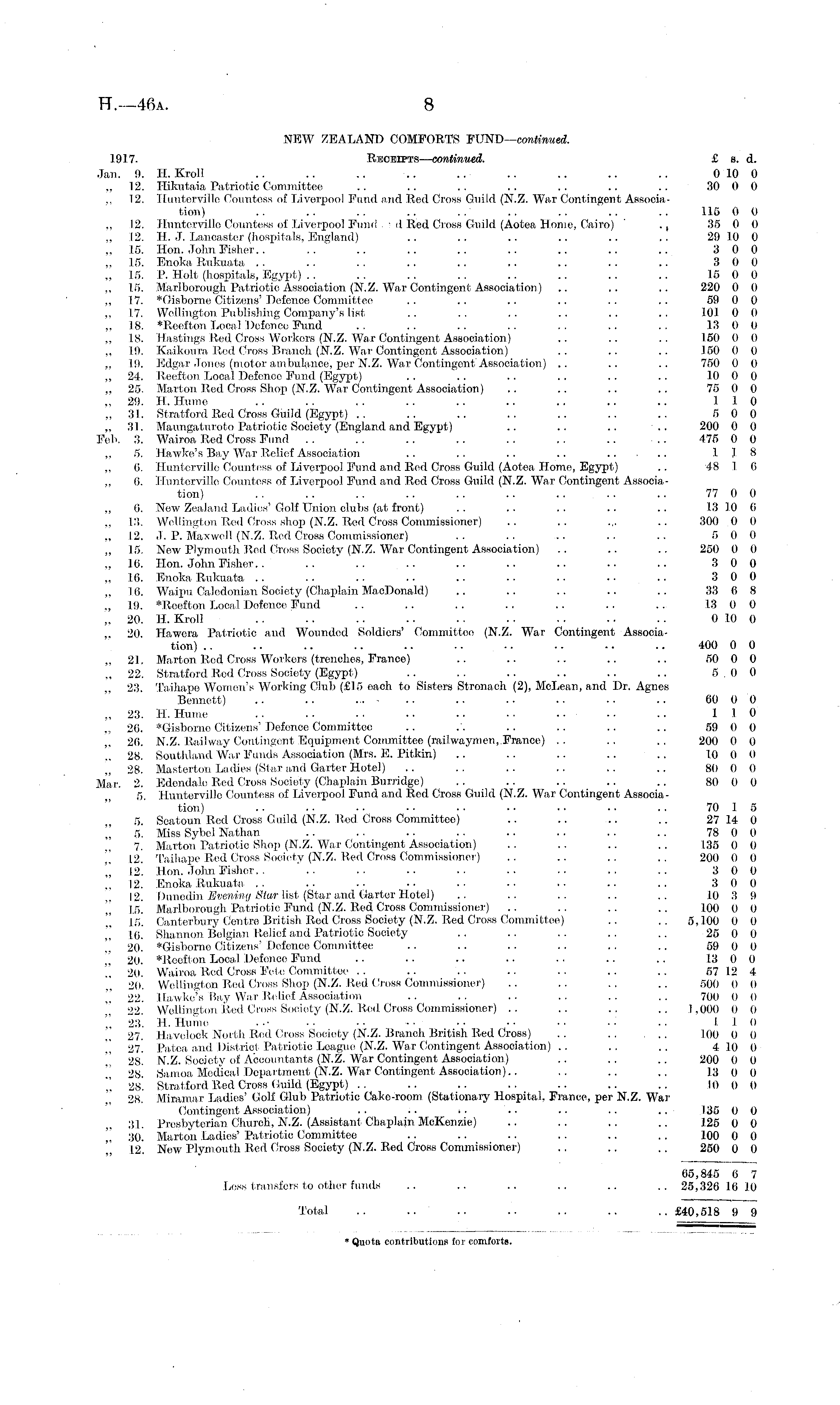 NEW ZEALAND COMFORTS FUND— continued. 1917. Receipts— continued. £ s. d. Jan. 9. H. Kroll .. .. .. .. ... .. .. .. .. 0 10 0 „ 12. Hikutaia Patriotic Committee .. .. . . .. .. .. .. 30 0 0 ~ 12. Hunterville Countess of Liverpool Fund and Red Cross Guild (N.Z. War Contingent Association) .. .. .. .. ~' .. .. .. .. 115 0 0 ~ 12. Hunterville Countess of Liverpool Fund fid Red Cross Guild (Aotea Home, Cairo) ~ 35 0 0 „ 12. H. J. Lancaster (hospitals, England) .. .. .. .. .. .. 29 10 0 „ 15. Hon. John Fisher.. .. .. .. .. .. .. .. .. 300 „ 15. Enoka Rukuata . . .. . . .. .. .. .. . . .. 3 0 0 „ 15. P. Holt (hospitals, Egypt) .. .. . . . . .. .. .. .. 15 0 0 „ 15. Marlborough Patriotic Association (N.Z. War Contingent Association) .. .. .. 220 0 0 „ 17. "Gisborne Citizens' Defence Committee .. .. .. .. .. .. 59 0 0 „ 17. Wellington Publishing Company's list .. .. .. .. .. .. 101 0 0 „ 18. "Reefton Local Defonce Fund .. .. .. .. .. .. .. 13 0 0 18. Hastings Red Cross Workers (N.Z. War Contingent Association) .. .. .. 150 0 0 ~ 19. Kaikoura Red Cross Branch (N.Z. War Contingent Association) .. .. .. 150 0 0 „ 19. Edgar .Tones (motor ambulance, per N.Z. War Contingent Association) .. .. .. 750 0 0 „ 24. Reefton Looal Defenoe Fund (Egypt) .. .. .. .. .. .. 10 0 0 25. Marton Reel Cross Shop (N.Z. War Contingent Association) .. .. .. .. 75 0 0 „ 29. H. Hume .. .. .. .. .. .. .. .. .. 110 „ 31. Stratford Red Cross Guild (Egypt) . . .. .. .. .. . . .. 5 0 0 „ 31. Maungaturoto Patriotic Society (England and Egypt) .. .. .. .. 200 0 0 Feb. 3. Wairoa Red Cross Fund . . .. . . .. .. .. .. .. 475 0 0 ~ 5. Hawke's Bay War Rolief Association .. .. .. .. I 1 8 ~ 0. Hunterville Countess of Liverpool. Fund and Red Cross Guild (Aotea Homes Egypt) .. 48 1 (> ~ 0. Hunterville Countess of Liverpool Fund and Rod Cross Guild (N.Z. War Contingent Association) . . . . .. .. .. .. . . . . .. 77 0 0 „ 6. New Zealand Ladies' Golf Union clubs (at front) .. .. .. .. .. 13 10 0 „ 13. Wellington Red Cross shop (N.Z. Reel Cross Commissioner) .. .. ... .. 300 0 0 „ 12. J. P. Maxwell (N.Z. Rod Cross Commissioner) .. .. .. . . . . 5 0 0 „ 15. New Plymouth Red Cross Society (N.Z. War Contingent Association) .. .. .. 250 0 0 „ 16. Hon. John Fisher.. .. .. .. .. .. .. .. .. 3 0 0 „ 16. Enoka Rukuata .. .. . . .. .. .. .. .. .. 3 0 0 ~ 16. Waiim Caledonian Society (Chaplain Mac Donald) .. .. .. .. .. 33 0 8 „ 19. "Reefton Local Defence Fund .. . . .. .. .. .. ... 13 0 0 „ 20. H. Kroll .. -. .. .. . . . • • • . • .. 010 0 ~ 20. Hawera Patriotic and Wounded Soldiers' Committee (N.Z. War Contingent Association) .. .. .. .. .. .. ... .. .. .. 400 0 0 21. Marton Bed Cross Workers (trenches, France) .. . . .. .. .. 50 0 0 „ 22. Stratford Red Cross Society (Egypt) .. .. . . .. .. .. 5.00 23. Taihape Women's Working Club (£l5 each to Sisters Stronach (2), McLean, and Dr. Agnes Bennett) .. .. .. .. .. .. .. 60 0 0 „ 23. H. Hume .. . . .. .. .. ■ . . • .. .. 110 ~ 20. "Gisborne Citizens' Defence Committee .. .. .. . . . . .. 59 0 0 „ 26. N.Z. Railway Contingent Equipment Committee (railwaymen, France) .. .. .. 200 0 0 28. Southland War Funds Association (Mrs. E. Pitkin) .. .. .. .. .. 10 0 0 „ 28. Masterton Ladies (Star and Garter Hotel) .. .. .. .. .. .. 80 0 0 Mar. 2. Edendale Red Cross Society (Chaplain Burridgc) . . .. .. .. .. 80 0 0 5 Hunterville Countess of Liverpool Fund and Red Cross Guild (N.Z. War Contingent Association) .. .. .. . • • • .• .. .. . . 70 1 5 5. Seatoun Red Cross Cuild (N.Z. Red Cross Committee) .. .. .. .. 27 14 0 5. Miss Sybel Nathan .. .. .. .. .. .. .. . . 78 0 0 7. Marton Patriotic Shop (N.Z. War Contingent Association) .. .. .. .. 135 0 0 „ 12. Taihape Red Cross Socioty (N.Z. Red Cross Commissioner) . . .. .. .. 200 0 0 „ 12. Hon. John Fisher.. '.. .. .. .. .. .. .. .. 300 ~ 12. Enoka Rukuata, .. .. .. .. .. . . .. .. .. 3 0 0 „ 12. Dunedin Evening Star list (Star and Garter Hotel) .. .. .. .. .. 10 3 9 '„ 1.5. Marlborough Patriotic Fund (N.Z. Bed Cross Commissioner) .. .. .. .. 100 0 0 15. Canterbury Centre British, Red Cross Society (N.Z. Red Cross Committee) .. ... 5,100 0 0 16. Shannon Belgian Relief and Patriotic Society . . .. .. . . .. 25 0 0 „ 20. "Gisborne Citizens' Defence Committee .. .. .. .. .. .. 59 0 0 „ 20. "Reefton Local Defence Fund .. .. .. .. . . .. .. 13 0 0 „ 20. Wairoa Red Cross Fete Committee .. .. .. .. .. .. .. 57 12 4 20. Wellington Red Cross Shop (N.Z. Red Cross Commissioner) .. .. .. .. 500 0 0 22. Hawke's Bay War Relief Association .. •■ .. .. .. .. 700 0 0 22. Wellington Red Cross Society (N.Z. Red. Cross Commissioner) .. .. .. .. 1,000 0 0 '„ 23. H. Hume . .• .. ■• ■■ •• •• •■ .. .. 110 27. Havelock North Red Cross Society (N.Z. Branch British Red Cross) .. 100 o 0 "„ 27. Patea and District Patriotic League (N.Z. War Contingent Association) .. .. .. 410 0 28. N.Z. Society of Accountants (N.Z. War Contingent Association) .. .. .. 200 0 0 28. Samoa Medical Department (N.Z. War Contingent Association).. .. .. .. 13 0 0 ',' 28. Stratford Red Cross Cuild (Egypt) .. .. .. .. .. .. .. 10 0 0 28. Miramax Ladies' Golf Glub Patriotic Cake-room (Stationary Hospital. France, per N.Z. War Contingent Association) .. .. ~ .. .. .. .. 135 0 0 31. Presbyterian Church, N.Z. (Assistant Chaplain McKenzie) .. .. .. .. 125 0 0 ,', 30. Marton Ladies' Patriotic Committee .. .. . . .. .. .. 100 0 0 „ 12. New Plymouth Red Cross Society (N.Z. Red Cross Commissioner) .. .. ~ 250 0 0 65,845 6 7 Less transfers to other funds .. .. .. .. .. .. 25,326 10 10 Total .. .. .. .. .. . . .. £40,518 9 9 * Quota contributions for comforts.
