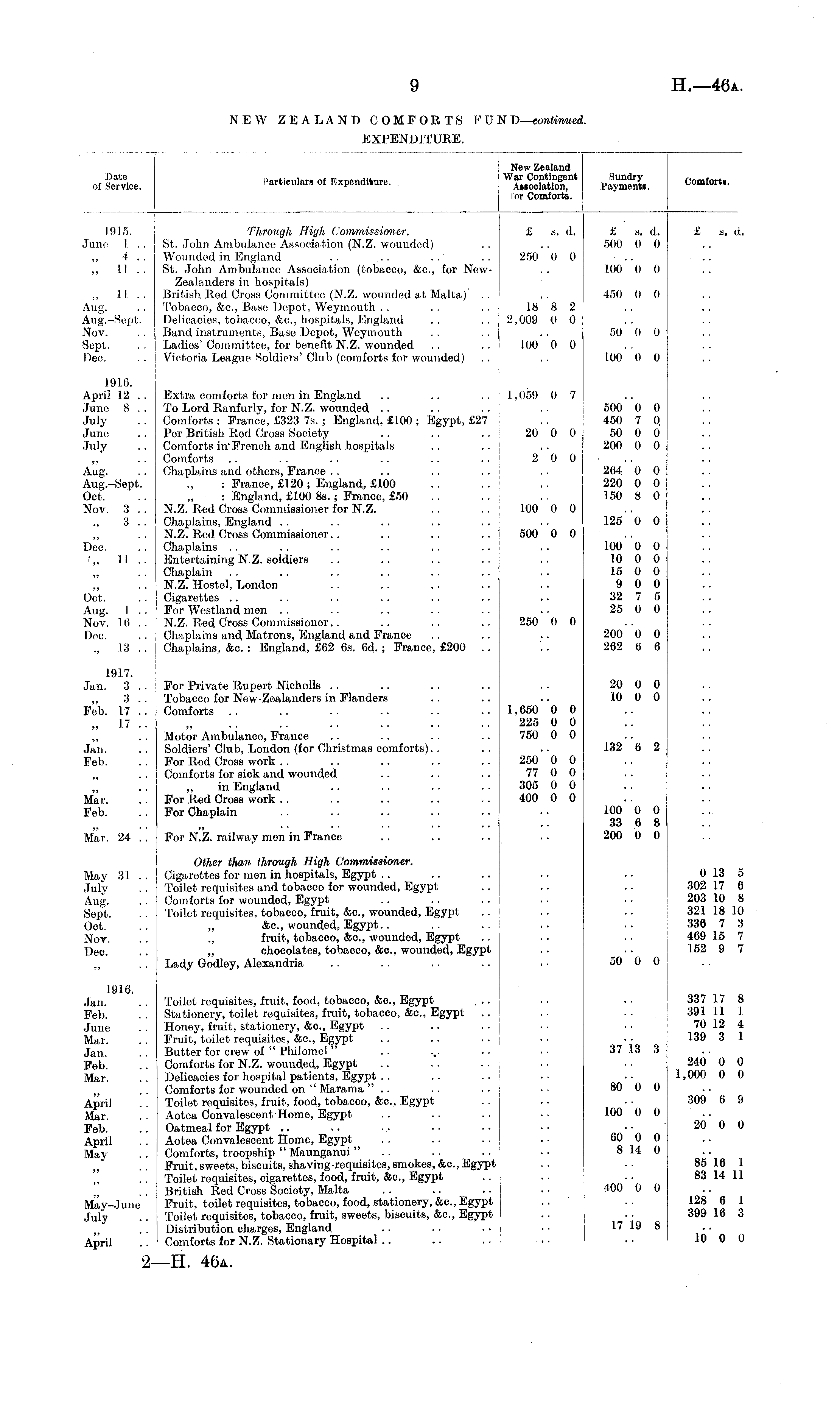 Date of Service. Particulars of Expenditure. New Zealand War Contingent Association, for Comforts. Sundry Payments. Comforts. 1915. Juno I . . 4 .. „ 11 .. „ 11 .. Aug. Aug.-Sept. Nov. Sept. Dec. Through High Commissioner. St. John Ambulance Association (N.Z. wounded) Wounded, in England St. John Ambulance Association (tobacco, &c, for NewZealanders in hospitals) British Red Cross Committee (N.Z. wounded at Malta) Tobacco, &c, Base Depot, Weymouth Delicacies, tobacco, &c, hospitals, England Band instruments, Base Depot, Weymouth Ladies' Committee, for benefit N.Z. wounded Victoria League Soldiers' Club (comforts for wounded) £ s. d. 250 0 0 18 8 2 2.009 0 0 £ s. d. 500 0 0 100 0 0 450 0 0 £ s. d. 50 0 0 100 0 0 100 0 0 1916. April 12 . . June 8 .. July June July Extra comforts for men in England To Lord Ranfurly, for N.Z. wounded Comforts : France, £323 7s. j England, £.100 ; Egypt, £27 Per British Red Cross Society Comforts in: French, and English hospitals Comforts Chaplains and others, France : France, £120 ; England, £100 : England, £100 8s. ; France, £50 N.Z. Red Cross Commissioner for N.Z. Chaplains, England N.Z. Red Cross Commissioner. . Chaplains Entertaining N.Z. soldiers Chaplain N.Z. Hostel, London Cigarettes For Westland men N.Z. Red Cross Commissioner.. Chaplains and Matrons, England and France Chaplains, &c. : England, £62 6s. 6d.; France, £200 .. 1,059 0 7 500 0 0 450 7 0 50 0 0 200 0 0 20 0 0 2 0 0 Aug. Aug.-Sept. Oct. Nov. 3 .. 3 .. 100 0 0 264 0 0 220 0 0 150 8 0 125 0 0 500 0 0 100 0 0 10 0 0 15 0 0 9 0 0 32 7 5 25 0 0 Dee. I „ II.. Oct. Aug. 1 . . Nov. 16.. Dec. 250 0 0 200 0 0 262 6 6 ., 13 . . 1917. Jan. 3 . . 3 .. Feb. 17 .. „ 17 .. For Private Rupert Nicholls Tobacco for New-Zealanders in Flanders Comforts 1,650 0 0 225 0 0 750 0 0 20 0 0 10 0 0 Jan. Feb. Motor Ambulance, France Soldiers' Club, London (for Christmas comforts).. For Red Cross work Comforts for sick and wounded „ in England For Red Cross work For Chaplain 250 0 0 77 0 0 305 0 0 400 0 0 132 6 2 Mar. Feb. 100 0 0 33 6 8 200 0 0 Mar. 24 .. For N.Z. railway men in France May 31 .. July Aug. Sept. Oct. Nov. Dee. Other than through High Commissioner. Cigarettes for men in hospitals, Egypt Toilet requisites and tobacco for wounded, Egypt Comforts for wounded, Egypt Toilet requisites, tobacco, fruit, &c, wounded, Egypt „ &e., wounded, Egypt.. „ fruit, tobacco, &c, wounded, Egypt „ chocolates, tobacco, &c, wounded, Egypt Lady Godley, Alexandria 0 13 5 302 17 6 203 10 8 321 18 10 336 7 3 469 15 7 152 9 7 50 0 0 1916. Jan. Feb. June Mar. Jan. Feb. Mar. Toilet requisites, fruit, food, tobacco, &c, Egypt Stationery, toilet requisites, fruit, tobacco, &c, Egypt Honey, fruit, stationery, &c., Egypt Fruit, toilet requisites, &c, Egypt Butter for crew of " Philomel Comforts for N.Z. wounded, Egypt Delicacies for hospital patients, Egypt Comforts for wounded on " Marama " .. Toilet requisites, fruit, food, tobacco, &c, Egypt Aotea Convalescent Home, Egypt Oatmeal for Egypt Aotea Convalescent Home, Egypt Comforts, troopship " Maunganui " Fruit, sweets, biscuits, shaving-requisites, smokes, &c, Egypt Toilet requisites, cigarettes, food, fruit, &c, Egypt British Red Cross Society, Malta Fruit, toilet requisites, tobacco, food, stationery, &c., Egypt Toilet requisites, tobacco, fruit, sweets, biscuits, &c, Egypt Distribution charges, England Comforts for N.Z. Stationary Hospital 337 17 8 391 11 1 70 12 4 139 3 1 37 13 3 240 0 0 1,000 0 0 80 0 0 April Mar. Feb. April May 100 0 0 309 6 9 20 0 0 60 0 0 8 14 0 85 16 1 83 14 11 400 0 0 May-June July 128 6 1 399 16 3 17 19 8 April 10 0 0