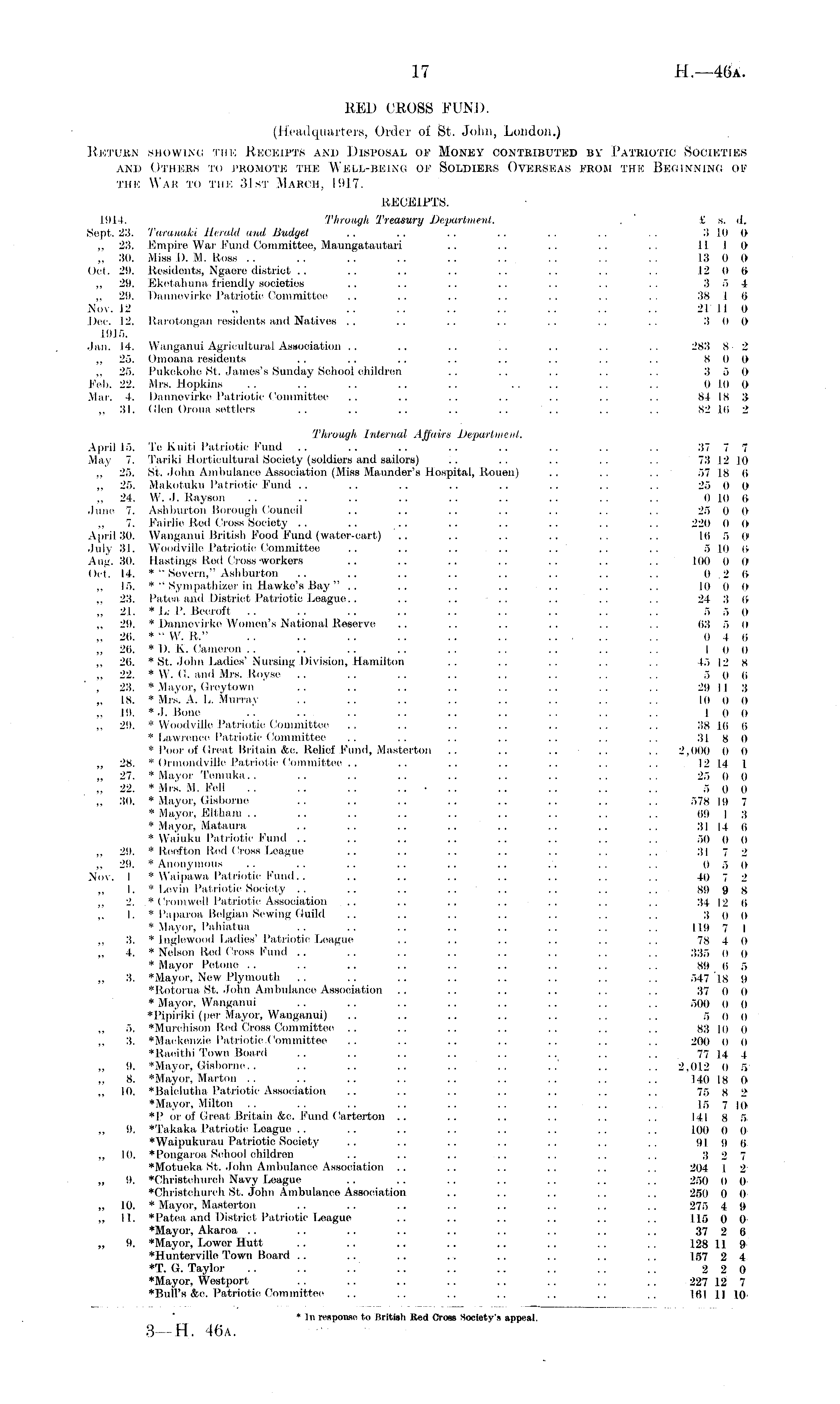RED CROSS FUND. (Headquarters, Order of St. John, London.) Return showing the Receipts and Disposal of Money contributed by Patriotic Societies and Others to promotb the Well-being Of Soldiers Overseas from the Beginning of the War to the 31st March. 1917. receipts. I ill I. Through Treasury Department. £ s. d. Sept. 23. Taranaki Herald and Budget .. .. .. .. .. .. 3 10 '0 ~ 23. Empire War Fund Committee, Maungatautari .. .. .. .. . , 1110 „ 30. Miss I). M. Ross .. .. .. .. .. .. .. .. 13 0 0 Oct. 29. Residents, Ngaore district . . .. .. .. .. .. .. .. 12 O 6 ~ 29, Eketahuna friendly societies .. .. .. .. .. .. .. 3 5 4 ~ 29. Dannevirke Patriotic Committee .. .. .. .. .. .. .. 38 I 0 Nov. 12 „ .. .. .. .. .. .. .. 21110 Dec. 12. Rarotongan residents and Natives .. .. .. .. .. .. .. •'! o 0 1915. Jan. 14. Wanganui Agricultural Association .. .. .. .. .. .. .. 288 8 2 „ 25. Omoana residents .. .. .. .. .. .. .. .. s 0 0 25. Pukekohe St. James's Sunday School children .. .. . . . . 3 5 0 Feb. 22. Mrs. Hopkins .. .. .. .. .. .... .. .. 0 LO 0 Mar. 4. Dannevirke Patriotic Committee .. .. .. .. .. .. .. 34 18 3 ~ 31. Glen Oroua settlers .. .. .. .. .. .. .. .. 82 16 2 Through internal Affairs Department. April 15. Te X nit i Patriotic Fund .. .. .. .. .. .. .. .. .'l7 7 7 May 7. Tariki Horticultural Society (soldiers and sailors) .. .. .. .. .. 73 12 10 ~ 25. St. John Ambulance Association (Miss Maunders Hospital, Rouen) .. .. .. 57 18 0 ~ 25, Makatuku Patriotic Fund .. .. .. .. .. .. .. 26 0 0 ~ 24. W. J. Rayson .. .. .. .. .. .. .. .. .. 010 6 June 7. Ashburton Borough Council .. .. .. .. .. .. .. 25 tl O „ 7. Fairlie Rod Cross Society .. .. .. .. .. .. .. .. 220 0 O April 30. Wanganui British Food Fund (water-cart) .. .. .. .. .. .. I (i 5 O July 31. Woodville Patriotic Committee .. .. .. .. .. .. .. 5 10 ii Aug. 30. Hastings Rod Cross-workers .. .. .. .. .. .. .. 100 () |> Oct. 14. *" Severn," Ashburton .. .. .. .. .. .. .. .. 0.2 (> ~ 15. *" Sympathizer in Hawke's Bay" .. .. .. .. .. .. .. 10 o o ~ 23. Patea and District Patriotic League. . .. .. .. .. .. .. 24 :i 0 „ 21. *L. I. Bccroft .. . . . . .. . . . . . . .. . . 5 5 0 ~ 29. * Dannevirke Women's National Reserve .. .. .. .. .. .. 63 5 o „ 26. * " VV. R." .. .. . . . . .. .. ... . . . . 046 „ 26. *D. K. Cameron .. .. .. .. .. .. .. .. 100 ~ 20. * St. John Ladies' Nursing Division, Hamilton .. .. .. t5 12 S ~ 22. *W. G. and Mrs. Royse .. .. .. .. .. .. .. .. 5 o ti 23. * Mayor, Grey town .. .. .. .. .. .. .. .. 29 11 3 „ 18. * Mrs. A. L. Murray .. .. .. .. .. .. .. .. loo o 111. * .1. Bone . . ... . . . . .. . . . . . . . . 100 ~ 29. * Woodville Patriotic Committee .. .. .. .. .. .. .. 38 16 <> * Lawrence Patriotic Committee .. .. .. .. .. .. 31 so * Poor of Great Britain &o. Relief Fund, Masterton .. .. .. .. .. 2,000 o o „ 28. * Ormondville Patriotic Committee .. .. .. .. .. .. .. 12 14 I ~ 27. * Mayor Temuka.. .. .. .. .. .. .. .. 25 0 0 „ 22. * Mrs. M. Fell .. ' .. . . .. • .. .. .. .. . . 5 0 0 30. * Mayor, Gisborne .. .. .. .. .. .. .. .. 578 h) 7 * Mayor, Kllliani . . . . . . , . . . . . . . . . . . (i!) | ;j * Mayor, Mataura . . . . . . .. . . . . . . . . 31 14 6 * Waiuku Patriotic Fund .. .. .. .. .. .. .. 50 0 tl ~ 2!). * Reef ton Red Cross League .. .. .. .. .. .. .. 31 7 2 „ 29. * Anonymous . . . . . . . . . . . . ,', . . 0 5 0 Nov. I * W'aipawa Patriotic Fund.. .. .. ~ .. .. .. .. 40 7 2 ~ I. * Levin Patriotic Society .. .. .. .... .. .. .. 89 9 8 ~ 2. , * Cromwell Patriotic Association .. .. .. .. .. .. .. 34 12 6 ~ I. * Paparoa Belgian Sewing Guild .. .. .. .. .. .. .. 3 0 0 "Mayor, Pahiatua ~ .. .. .. .. .. .. .. lilt 7 I ~ 3. * Inglewood Ladies' Patriotic League .. .. .. .. .. .. 78 4 0 „ 4. * Nelson Red Cross Fund .. .. . . .. .. . . 335 o o * Mayor Pet.one .. .. .. ... .. .. .. .. 89 (> 5 ~ 3. *Mayor, New Plymouth .. .. .. .. .. .. .. .. 547 IS 9 ♦Rotorua St. John Ambulance Association .. .. .. .. .. .. 37 0 0 * Mayor. Wanganui .. .. .. .. .. .. .. .. .-,()() o Q ♦Pipiriki (per Mayor, Wanganui) .. .. .. .. .. .. .. 5 0 0 ~ 5. *Mu:rehisnn Red Cross Committee .. .. .. .. .. .. .. 83 10 o ~ 3. ♦Mackenzie Patriotic Committee .. .. .. .. .. .. .. 200 o 0 *Raeithi Town Board .. .. .. .. .. .. .. .. 77 U 4 „ 9. -"Mayor, Gisborne. . .. .. .. .. .. . .' .. .. 2,012 0 5" 8. ♦Mayor, Marton .. .. .. .. .. .. .. .. .. 140 18 0 ~ 10. ♦Balolutha Patriotic Association ~ .. .. .. .. .. .. 75 8 2 ♦Mayor, Milton .. .. .. .. .. .. .. .. 15 7 lo *P or of Great Britain &c. Fund Carterton .. .. .. .. .. 141 8 5 i). *Takaka Patriotic League . . .. .. .. .. .. .. .. |()0 0 0 ♦Waipukurau Patriotic Society .. .. .. .. .. 91 9 6 „ 10. ♦Pongaroa School children .. .. .. .. .. .. .. 3 2 7 ♦Motueka St. John Ambulance Association . . . . . . . . . . . . 204 I 2 „ 11. *Ohi'istchureh Navy League . . . . . . . . . . . . . . 250 0 0 ♦Christchurch St. John Ambulance Association .. .. .. .. .. 250 0 0 „ 10. ♦ Mayor, Masterton . . . . . . . . . . . . . . . . 275 4 9 11. *Patea and District Patriotic League .. .. .. .. .. 115 0 ,0 ♦Mayor-, Akaroa .. .. .. .. .. .. .. .. 37 2 6 „ 9. ♦Mayor, Lower Hutt .. .. .. .. .. .. .. 128 II 9 ♦Hunterville Town Board .. .. .. .. .. .. .. 157 2 4 ♦T. (5. Taylor .. , . .. .. .. .. .. . , . . 2 2 0 ♦Mayor, Wostport .. .. .. .. .. .. . . 227 12 7 ♦Boil's &c. Patriotic Committee .. .. .. .. .. .. 161 II 10 * In response to British Red Cross Society's appeal.