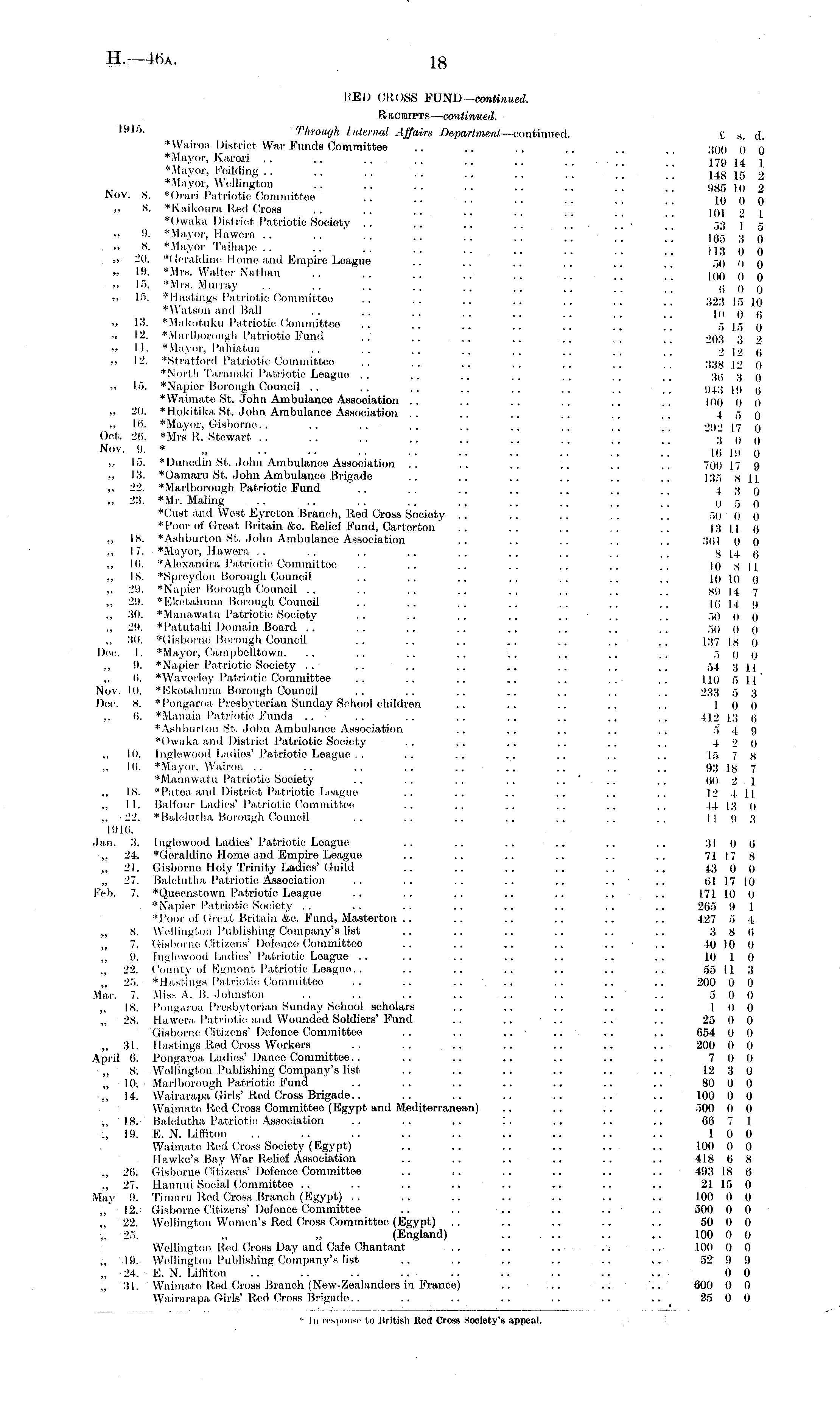RED CROSS FUND -continued. Receipts-— continued. "*'"' Through I /denial Affairs Department —continued. £ 8 , ± ♦Wairoa District War Funds Committee .. .. .. .. .. ;> o o 0 q ♦Mayor, Karori .. .. .. .. _ , _ ' _' 179 14 i ♦Mayor, Feilding.. .. .. .. __ ■ » a ♦Mayor, Wellington .. .. .. .. pi ggg in 7, Nov. s. ♦Orari Patriotio Committee .. .. .. '' '' 10 0 0 „ 8. *Kaikoura Red Cross .. .. .. .. .. LP,] •> i ♦Owaka District Patriotic Society .. .. .. .. 53 j 5 " 9. '"Mayor, Hawera .. .. .. .. l (i r F •; X „ 8, ♦Mayor Taihape .. .. ~ ~ __ _ I l'j {) « „ 20. ♦Geraldine Home and Umpire League -.9 n [) „ 19. ♦Mrs. Walter Nathan .. .. .. .. \\ '.'.■'.'. liio 0 0 ~ 15. ♦Mrs. Murray .. .. .. .. .. it 6 0 0 ~ 15. ♦Hastings Patriotio Committee .. .. .. .. ~ :;■>;! |.-, in ♦Watson and Ball .. .. .. .. 10 0 6 ~ 13. ♦Makotukrt Patriotic Committee .. .. .. .. __ 515 0 ~ 12. ♦Marlborough Patriotio Fund .. .. .. .. 21)3 3 ■> ~ 11. *Mayor, Pahiatua ~ .. .. ~ 212 6 ~ 12. ''Stratford Patriotic Committee .. ... .. .. .. ~ 333 |-> n ♦North Taranaki Patriotio League .. .. .. .. .. ~ 39 ;j q ~ 15. ♦Napier Borough Council .. .. .. .. ._ 943 pj a ♦Waimate St. John Ambulance Association .. .. .. .. 100 0 o ~ 20. ♦Hokitika St. John Ambulance Association .. .. .. .. .. . . 4 5 0 ~ Hi. ♦Mayor, Gisborne.. .. .. .. ~ .. _ •><).> 17 n Oct. 26. *Mrs R. Stewart .. .. .. ' " "300 Nov - ! »- * .. .' .'.' .'.' .'.' 16 lit 0 ~ 15. *Dunodin St. John Ambulance Association .. .. .. .. ... ~ 70(1 17 9 ~ 13. *oamaru St. John Ambulance Brigade .. .. .. ~ .. ~ 135 81] ~ 22. *Marlborough Patriotic Fund .. .. .. .. .. .. 4 3 0 „ 23. ♦Mr. Maling .. .. .. .. .. .. ]'_ '" [[ 0 5 0 ♦Oust and West Eyreton Branch, Rod Cross Socioty .. .. .. .. 50 0 0 ♦Poor of Great Britain &c. Relief Fund, Carterton .. .. .. .. .. 13 II (i ~ 18. ♦Ashburton St. John Ambulance Association .. .. .. .. .. :',(i| 0 rj ~ 17. ♦Mayor, Hawera .. .. .. .. .. .. ~ ~ _■, 814 6 ~ Iti. ♦Alexandra Patriotic Committee .. .. .. .. .. .. 10 81] ~ IS. ♦Spreydon Borough Council .. .. .. .. .. .. ~ 10 10 0 ~ 29. ♦Napier Borough Council .. .. .. ~ ~ .. ~ , 89 14 7 29. ♦Eketahuna Borough Council .. .. .. .. ~ .. ~ Hi 14 9 30. ♦Manawatu Patriotic Society .. .. .. .. .. .. .. 50 0 11 ~ 29. ♦Patutahi Domain Board .. .. .. .. .. ~ .. .. 50 0 0 ~ 30. ♦Gisborne Borough Council .. .. .. ~ .. ~ .. 137 is 9 Dec. I. *Mayor, Campbelltown. .. .. .. .. .. .. .. .. 500 ~ 9. ♦Napier Patriotic Society .. .. .. .. .. .. .. ~ 54 311 ~ (i. ♦Waverley Patriotio Committee .. .. .. .. .. .. .. 110 5 1.1 Nov. 10. *Eketahuna Borough Council .. .. .. .. ~ ~ .. 233 5 3 Dec. 8. ♦Pongaroa Presbyterian Sunday Sohool children .. .. .. .. .. 100 ~ <i. ♦Manaia Patriotic Funds . . . . . . . . . . . . . . . , |)o [3 9 ♦Ashburton St. John Ambulance Association .. ~ .. .. ~ 5 4 9 ♦Owaka and District Patriotic Society .. .. .. .. .. ~ 4 2 0 ~ 10. Inglowood Ladies' Patriotio League.. .. .. .. .. .. .. 15 7 s „ Hi. ♦Mayor, Wairoa .. .. .. .. .. .. .. .. 93 is 7 ♦Manawatu Patriotic Society .. . . . . .. .. " .. .. 90 % 1 ~ 18. ♦Pa lea and District Patriotio League .. .. .. .. .. .. 12 4 II ~ 11. Balfour Ladies' Patriotic Committee .. .. ~ .. .. .. 14 13 o ~ -22. ♦Balolutha Borough Council .. .. .. .. .. .. 11 9 3 1916. Jan. 3. Inglowood Ladies' Patriotic League .. .. .. .. .. .. 31 0 6 „ 24. ♦Geraldine Home and Empire Loague .. .. .. .. .. .. 71 17 8 „ 21. Gisborne Holy Trinity Ladies' Guild .. .. .. .. .. .. 43 0 0 ~ 27. Balolutha Patriotic, Association .. .. .. .. .. .. .. 61 17 10 Feb. 7. *Queenstown Patriotic League .. .. .. .. .. .. .. 17 f HI 0 ♦Napier Patriotic Society .. .. .. .. .. .. .. .. 265 9 I ♦Poor of Great Britain &c. Fund, Masterton . . .. .. .. .. .. 427 5 4 „ 8. Wellington Publishing Company's list .. .. .. .. .. .. 3 8 6 „ 7. Gisborne Citizens' Defence Committee .. .. .. .. .. .. to 10 0 „ 9. tnglewood Ladies' Patriotic League .. .. ... .. .. .. .. 10 I 0 „ 22. County of Egmoni Patriotic League. . .. .. .. .. .. .. 55 II 3 „ 25. ♦Hastings Patriotic Committee .. .. .... .. .. .. 200 0 0 Mar. 7. Miss A. B. Johnston .. .. .. .. .. .. .. .. 5 0 0 „ 18. Pongaroa Presbyterian Sunday Sohool scholars .. .. .. .. .. 10 0 „ 28. Hawera Patriotic and Wounded Soldiers' Fund .. .. .. .. .. 25 0 0 Gisborne Citizens' Defenoe Committee .. .. .. .. .. .. 654 0 0 „ 31. Hastings Bed Cross Workers .. .. .. .. .. .. .. 200 0 0 April 0. Pongaroa Ladies' Dance Committee.. .. .. .. ... .. .. 7 0 0 „ S. Wellington Publishing Company's list .. .. .. .. .. .. 12 3 0 „ 10. Marlborough Patriotic Fund .. .. .. .. .. .. .. 80 0 0 14. Wairarapa Girls' Red Cross Brigade.. .. .. .. .. .. .. 100 0 0 Waimate Red. Cross Committee (Egypt and Mediterranean) .. .. .. .. 500 0 0 „ 18. Balolutha Patriotic Association .. .. .. :. .. .. .. 66 7 1 „ 19. E. N. Liffiton .. .. .. .. .. .. ... .. .. 10 0 Waimate Red Cross Socioty (Egypt) .. .. .. .. .. .. 100 0 0 Hawke's Bay War Rolief Association .. .. .. .. .. .. 418 6 8 „ 20. Gisborne Citizens' Defence Committee .. ~ .. .. .. .. 493 18 6 „ 27. Haunui Social Committeo .. .. .. .. .. .. .. .. 21 15 0 May 9. Timaru Red Cross Branch (Egypt) . . .. .. .. .. .. .. 100 0 0 „ 12. Gisborne Citizens' Defenoe Committee .. .. .. .. .. .. 500 0 0 „ 22. Wellington Women's Red Cross Committee (Flgypt) .. .. .. .. .. 50 0 0 „ 25. „ „ (England) .. .. .. .'. 100 0 0 Wellington Red Cross Day and Cafe Chantant .. .. ... .: ... 100 0 0 „ 19. Wellington Publishing Company's list .. .. .. .. .. .. 52 9 9 „ 24. E. N. Liffiton .. . . .. .. .. .. .. .. 0 0 „ 31. Waimate Red Cross Branch (New-Zealanders in France) .. .. .. .. 600 0 0 Wairarapa Girls' Rod Cross Brigade. . .. .. .. .. .. .. 25 0 0 1 In response to British Red Cross Society's appeal.