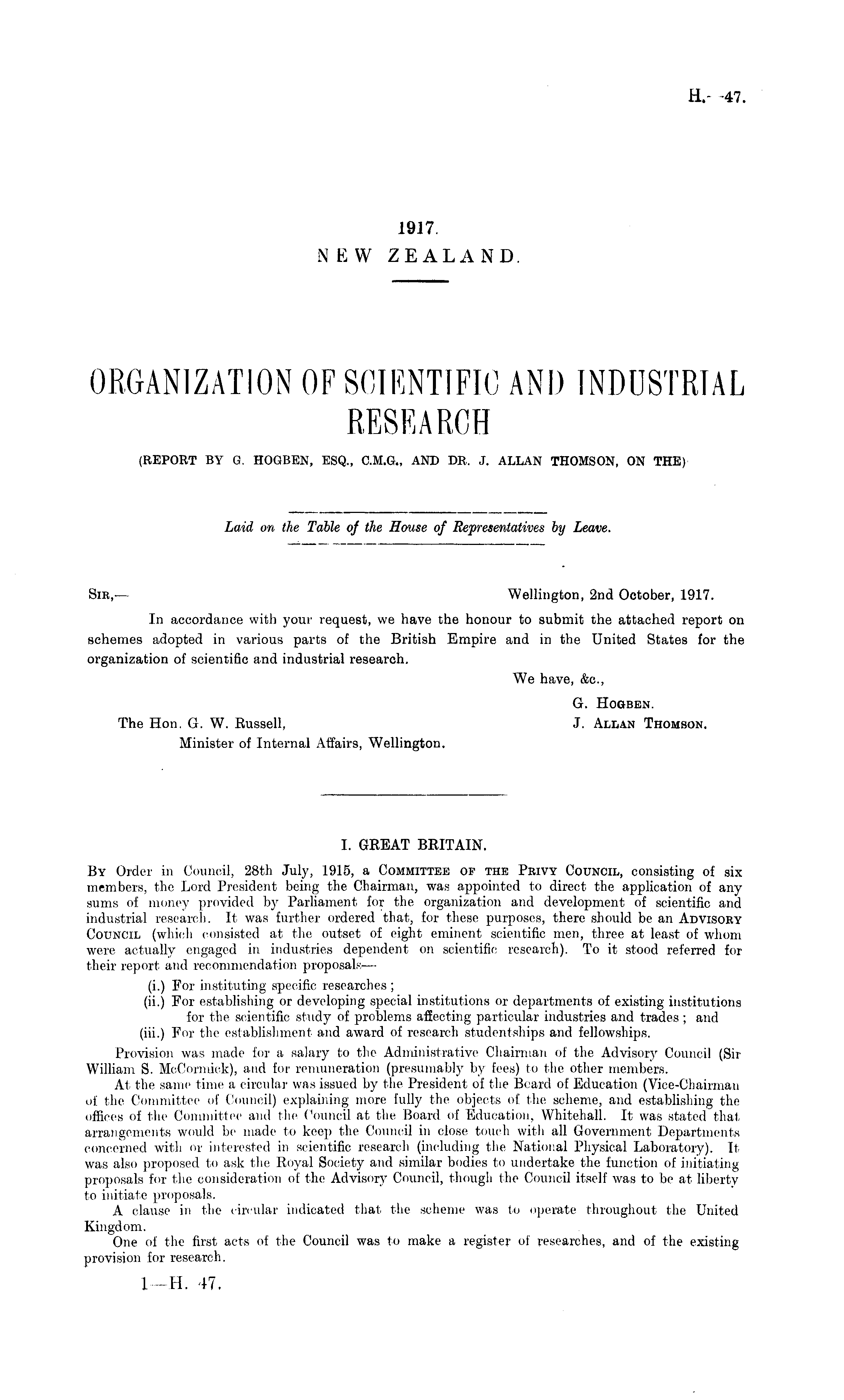 Sir,— Wellington, 2nd October, 1917. In accordance with your request, we have the honour to submit the attached report on schemes adopted in various parts of the British Empire and in the United States for the organization of scientific and industrial research. We have, &c, G. Hoqben. The Hon. G. W. Russell, J. Allan Thomson. Minister of Internal Affairs, Wellington.