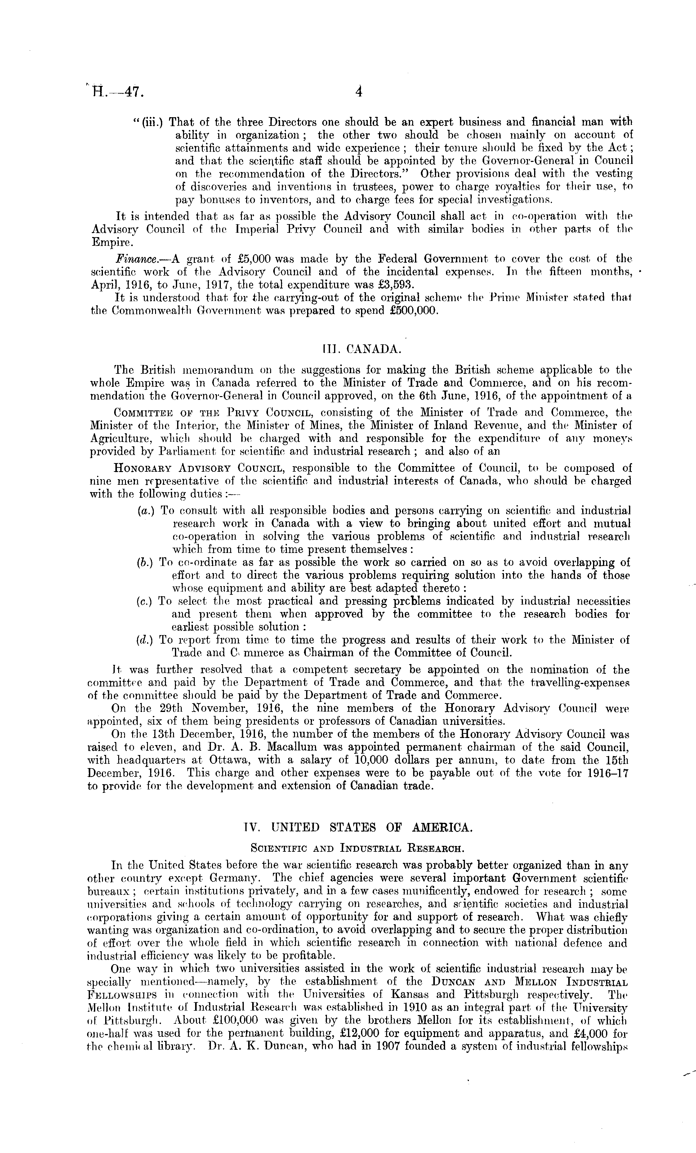 " (iii.) That of the three Directors one should be an expert business and financial man with ability in organization; the other two should be chosen mainly on account of scientific attainments and wide experience ; their tenure should be fixed by the Act; and that the scientific staff should be appointed by the Governor-General in Council on the recommendation of the Directors." Other provisions deal with the vesting of discoveries and inventions in trustees, power to charge royalties for their use, to pay bonuses to inventors, and to charge fees for special investigations. It is intended that as far as possible the Advisory Council shall act in co-operation with the Advisory Council of the Imperial Privy Council and with similar bodies in other parts of the Empire. Finance. —A grant of £5,000 was made by the Federal Government to cover the cost of the scientific work of the Advisory Council and of the incidental expenses. In the. fifteen months, April, 1916, to June, 1917, the total expenditure was £3,593. It is understood that for the carrying-out of the original scheme the Prime Minister stated that the Commonwealth Government was prepared to spend £500,000. 111. CANADA. The British memorandum on the suggestions for making the British scheme applicable to the whole Empire was in Canada referred to the Minister of Trade and Commerce, and on his recommendation the Governor-General in Council approved, on the 6th June, 1916, of the appointment of a Committee of the Privy Council, consisting of the Minister of Trade and Commerce, the Minister of the Interior, the Minister of Mines, the Minister of Inland Revenue, and the Minister of Agriculture, which should be charged with and responsible for the expenditure of any moneys provided by Parliament for scientific and industrial research ; and also of an Honorary Advisory Council, responsible to the Committee of Council, to be composed of nine men representative of the scientific and industrial interests of Canada, who should be charged with the following duties : — (a.) To consult with all responsible bodies and persons carrying on scientific and industrial research work in Canada with a view to bringing about united effort and mutual co-operation in solving the various problems of scientific and industrial research which from time to time present themselves : (b.) To co-ordinate as far as possible the work so carried on so as to avoid overlapping of effort and to direct the various problems requiring solution into the hands of those whose equipment and ability are best adapted thereto : (c.) To select the most practical and pressing problems indicated by industrial necessities and present them when approved by the committee to the research bodies for earliest possible solution : (d.) To report from time to time the progress and results of their work to the Minister of Trade and G mmerce as Chairman of the Committee of Council. It was further resolved that a competent secretary be appointed on the nomination of the committee and paid by the Department of Trade and Commerce, and that the travelling-expenses of the committee should be paid by the Department of Trade and Commerce. On the 29th November, 1916, the nine members of the Honorary Advisoiy Council were appointed, six of them being presidents or professors of Canadian universities. On the 13th December, 1916, the number of the members of the Honorary Advisory Council was raised to eleven, and Dr. A. B. Macallum was appointed permanent chairman of the said Council, with headquarters at Ottawa, with a salary of 10,000 dollars per annum, to date from the 15th December, 1916. This charge and other expenses were to be payable out of the vote for 1916-17 to provide for the development and extension of Canadian trade. IV. UNITED STATES OF AMERICA. Scientific and Industrial Research. In the United States before the war scientific research wa-s probably better organized than in any other country except Germany. The chief agencies were several important Government scientific bureaux ; certain institutions privately, and. in a few cases munificently, endowed for research ; some universities and schools of technology carrying on researches, and scientific societies and industrial corporations giving a certain amount of opportunity for and support of research. What was chiefly wanting was organization and co-ordination, to avoid overlapping and to secure the proper distribution of effort over the whole field in which scientific research in connection, with national defence and industrial efficiency was likely to be profitable. One way in which two universities assisted in the work of scientific industrial research may be specially mentioned—namely, by the establishment of the Duncan and Mellon Industrial Fellowships in connection with the Universities of Kansas and Pittsburgh respectively. The Mellon Institute of Industrial Research was established in 1910 as an integral part ol the University ol Pittsburgh. About £100,000 was given by the brothers Mellon for its establishment, of which one-half was used for the permanent building, £12,000 for equipment and apparatus, and £4,000 for the chemiial library. Dr. A. K. Duncan, who had in 1907 founded a system of industrial fellowships