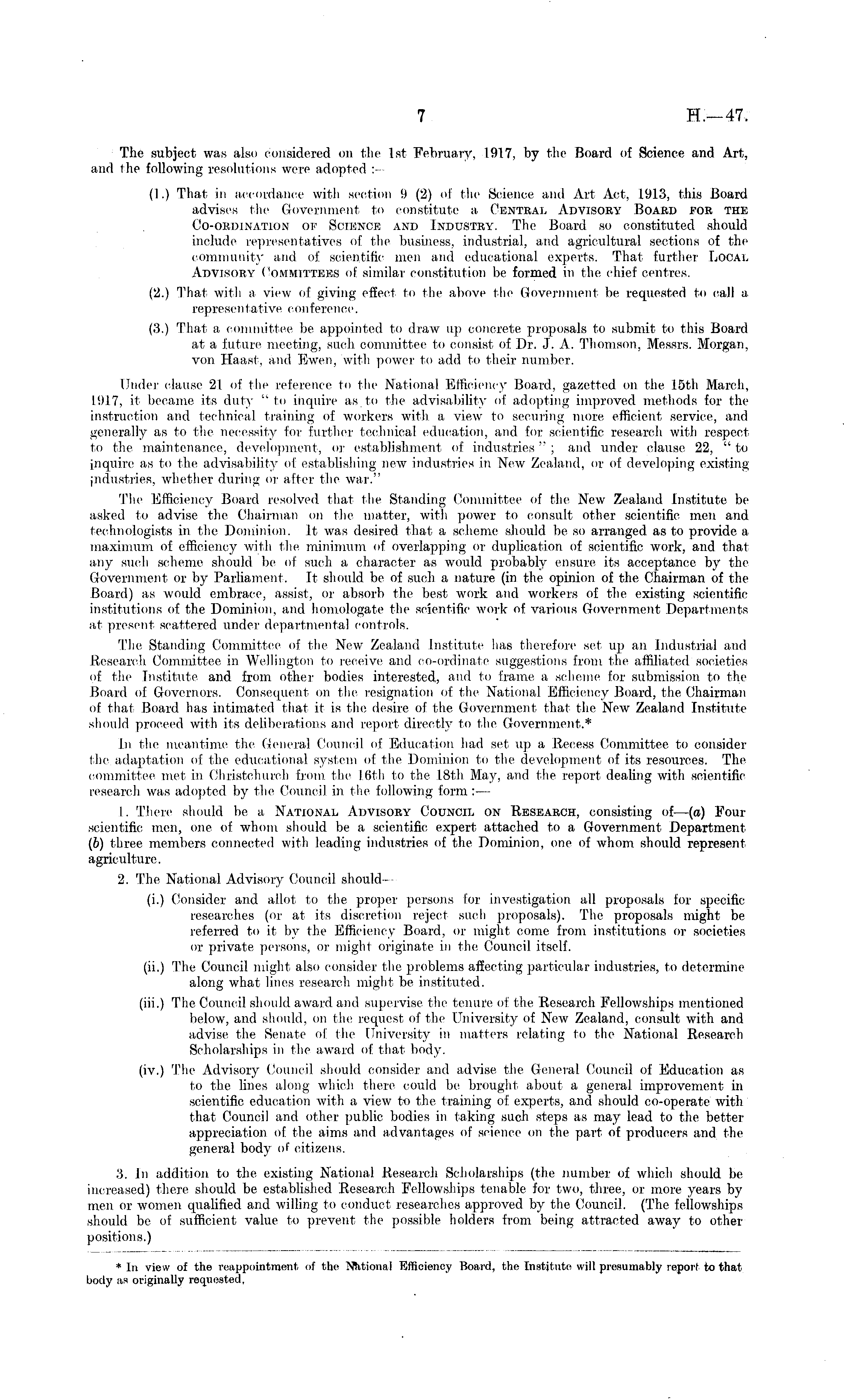 The subject was also considered on the Ist February, 1917, by the Board of Science and Art, and the following resolutions were adopted : (1.) That in accordance with section 9 (2) ol flic Science and Art Act, 1913, this Board advises the Government to constitute a Central Advisory Board for the Co-ordination of Science and Industry. The Board so constituted should include representatives ol' the business, industrial, and agricultural sections of the community and of scientific men and educational experts. That further Local Advisory Committees of similar constitution be formed in the chief centres. (2.) That with a view of giving effect to the above the Government be requested to call a representative conference. (3.) That a committee be appointed to draw up concrete proposals to submit to this Board at a future meeting, such committee to consist of Dr. J. A. Thomson, Messrs. Morgan, von Haast, and Ewen, with power to add to their number. Under clause 21 of the reference to the National Efficiency Board, gazetted on the 15th March, 1917, it became its duty "to inquire as to the advisability of adopting improved methods for the instruction and technical training of workers with a view to securing more efficient service, and generally as to the necessity for further technical education, and for scientific research with respect to the maintenance, development, or establishment of industries" ; and under clause 22, "to inquire as to the advisability of establishing new industries in New Zealand, or of developing existing industries, whether during or after the war." The Efficiency Board resolved that the Standing Committee of the New Zealand Institute be asked to advise the Chairman on the matter, with power to consult other scientific men and technologists in the Dominion, it was desired that a scheme should be so arranged as to provide a maximum of efficiency with the minimum of overlapping or duplication of scientific work, and that any such scheme should be of such a character as would probably ensure its acceptance by the Government or by Parliament. It should be of such a nature (in the opinion of the Chairman of the Board) as would embrace, assist, or absorb the best work and workers of the existing scientific institutions of the Dominion, and homologate the scientific work of various Government Departments at present scattered under departmental controls. The Standing Committee of the New Zealand Institute has therefore set up an Industrial and Research Committee in Wellington to receive and co-ordinate suggestions from the affiliated societies of the Institute and from other bodies interested, and to frame a scheme for submission to the Board of Governors. Consequent on the resignation of the National Efficiency Board, the Chairman of that Board has intimated that it is the desire of the Government that the New Zealand Institute should proceed with its deliberations and report directly to the Government.* Li the meantime the General Council of Education had set up a Recess Committee to consider the adaptation of the educational system of the Dominion to the development of its resources. The committee met in Christchurch from the 16th to the 18th May, and the report dealing with scientific research was adopted by the Council in. the following form: — 1. There should be a National Advisory Council on Research, consisting of— (a) Four scientific men, one of whom should be a scientific expert attached to a Government Department (b) three members connected with leading industries of the Dominion, one of whom should represent agriculture. 2. The National Advisory Council should(i.) Consider and allot to the proper persons lor investigation all proposals for specific researches (or at its discretion reject such proposals). The proposals might be referred to it by the Efficiency Board, or might come from institutions or societies or private persons, or might originate in the Council itself. (ii.) The Council might also consider the problems affecting particular industries, to determine along what lines research might be instituted. (iii.) The Council should award and supervise the tenure of the Research Fellowships mentioned below, and should, on the request of the University of New Zealand, consult with and advise the Senate of the University in matters relating to the National Research Scholarships in the award of that body. (iv.) The Advisory Council should consider and advise, the General Council of Education as to the lines along which there could be brought about a general improvement in scientific education with a view to the training of. experts, and should co-operate with that Council and other public bodies in taking such steps its may lead to the better appreciation of the aims and advantages of science on the part of producers and the general body of citizens. 3. In addition to the existing National Research Scholarships (the number of which should be increased) there should be established Research Fellowships tenable for two, three, or more years by men or women qualified and willing to conduct researches approved by the Council. (The fellowships should be of sufficient value to prevent the possible holders from being attracted away to other positions.)