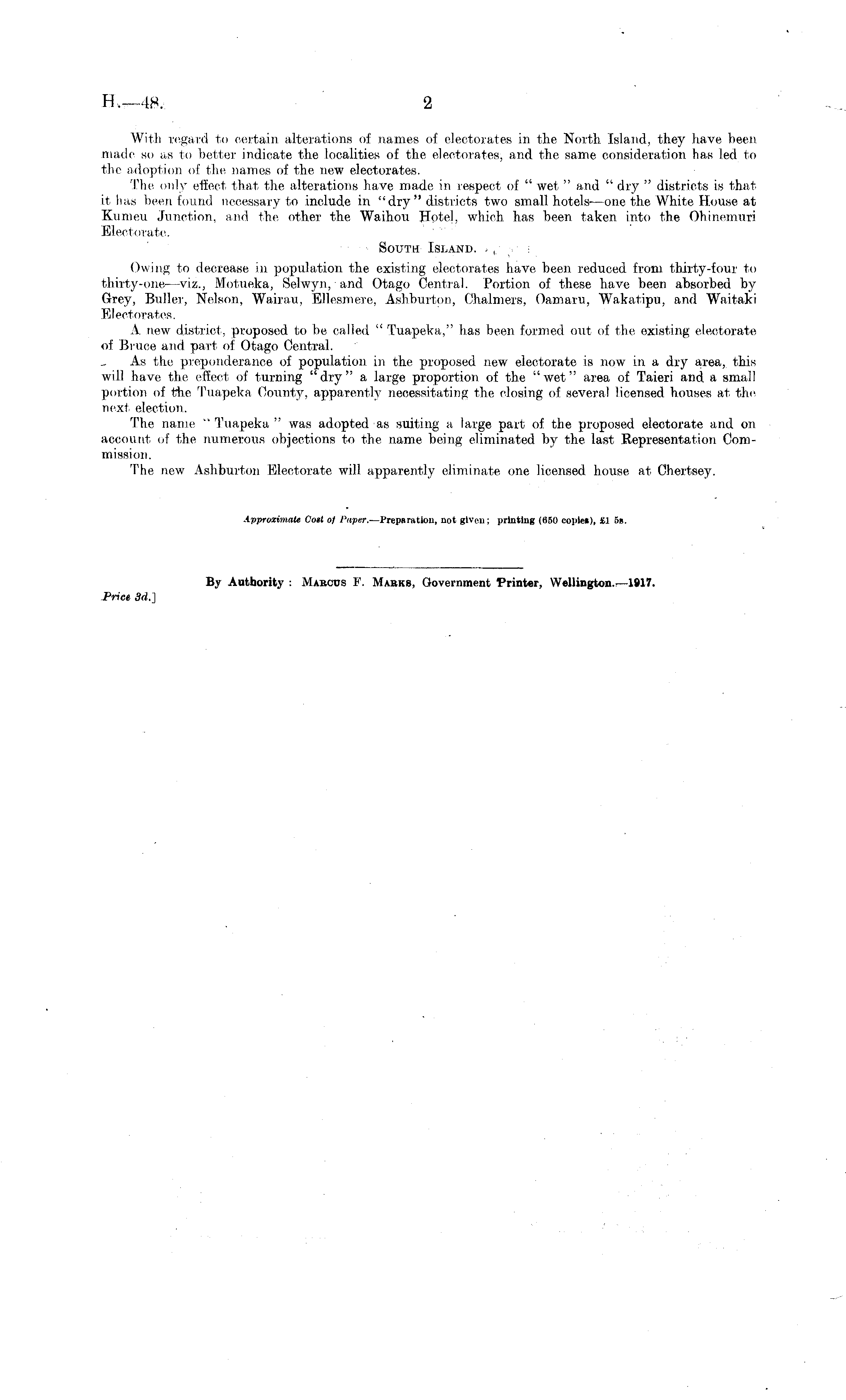 With regard to certain alterations of names of electorates in the North Island, they have been made so as to better indicate the localities of the electorates, and the same consideration has led to the adoption of the names of the new electorates. The only effect that the alterations have made in respect of " wet " and "dry " districts is that it has been found necessary to include in " dry " districts two small hotels- —one the White House at Kunieu Junction, and the other the Waihou Hotel, which has been taken into the Ohinemuri Electorate. South Island. , , Owing to deorease in population the existing electorates have been reduced from thirty-four to thirty-one —viz., M'otueka, Selwyn, and Otago Central. Portion of these have been absorbed by Grey, Buller, Nelson, Wairau, Ellesmere, Ashburton, Chalmers, Oamaru, Wakatipu, and Waitaki Electorates. A new district, proposed to be called " Tuapeka," has been formed out of the existing electorate of Bruce and part of Otago Central. Aw the preponderance of population in the proposed new electorate is now in. a dry area, this will have the effect of turning "dry" a large proportion of the "wet" area of Taieri and a small portion of the Tuapeka County, apparently necessitating the closing of several licensed houses at the next election. The name " Tuapeka " was adopted as suiting a large part of the proposed electorate and on account of the numerous objections to the name being eliminated by the last Representation Commission. The new Ashburton Electorate will apparently eliminate one licensed house at Chertsey.