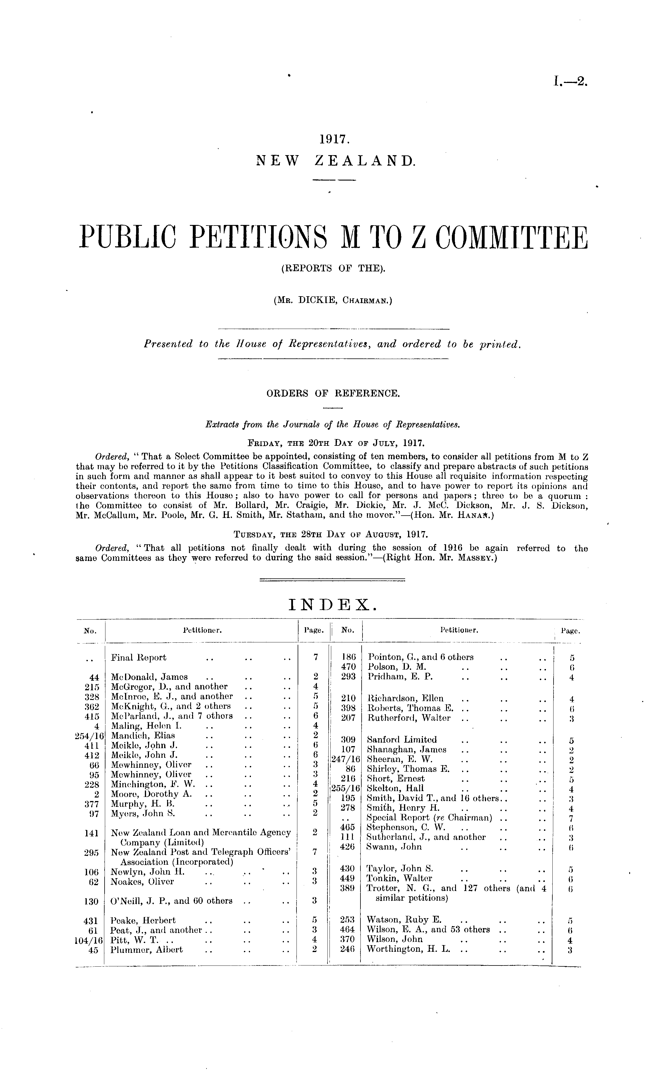 ORDERS OF REFERENCE. Extracts from the Journals of the House of Representatives. Friday, the 20th Day of July, 1917. Ordered, " That a Solect Committeo be appointed, consisting of ten members, to consider all petitions from M to Z that may bo referred to it by the Petitions Classification Committee, to classify and prepare abstracts of such petitions in such form and mannor as shall appear to it host suited to convey to this House all requisito information respecting their contents, and report the same from time to time to this Houso, and to have power to report its opinions and observations thereon to this Houso ; also to have power to call for persons and papers ; three to be a quorum : Ihe Committee to consist of Mr. Bollard, Mr. Craigie, Mr. Dickie, Mr. J. McC. Dickson, Mr. J. S. Dickson, Mr. McCallum, Mr. Poole, Mr. G. H. Smith, Mr. Statham, and tho movor." —(Hon. Mr. HanaS.) Tuesday, the 28th Day of August, 1917. Ordered, " That all petitions not finally doalt with during the session of 1916 be again referred to the same Committees as they were referred to during tho said session." —(Right Hon. Mr. Massey.)