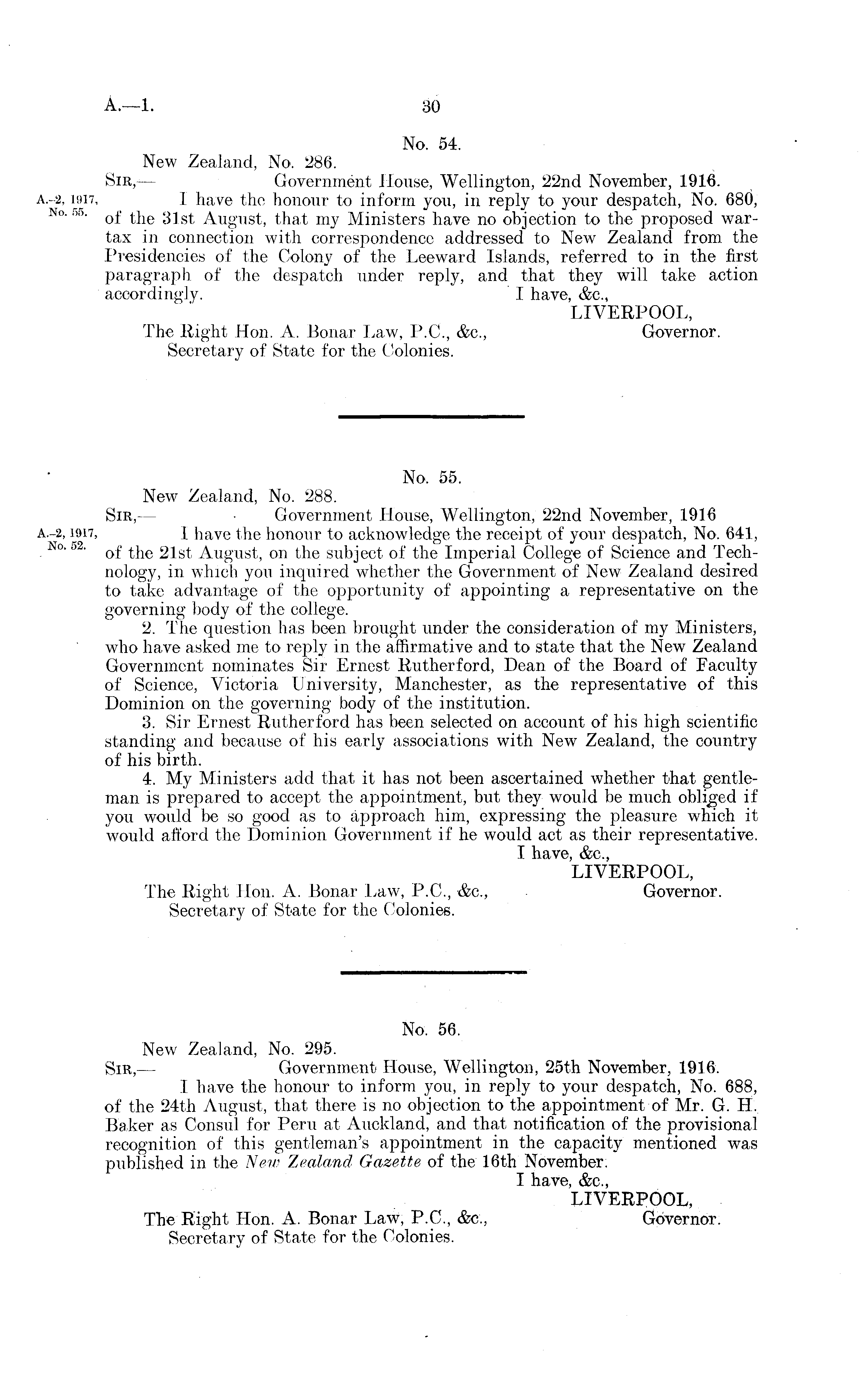 No. 55. New Zealand, No. 288. Sir, — Government House, Wellington, 22nd November, 1916 I have the honour to acknowledge the receipt of your despatch, No. 641, of the 21st August, on the subject of the Imperial College of Science and Technology, in which you inquired whether the Government of New Zealand desired to take advantage of the opportunity of appointing a representative on the governing body of the college. 2. The question has been brought under the consideration of my Ministers, who have asked me to reply in the affirmative and to state that the New Zealand Government nominates Sir Ernest Rutherford, Dean of the Board of Faculty of Science, Victoria University, Manchester, as the representative of this Dominion on the governing body of the institution. 3. Sir Ernest Rutherford has been selected on account of his high scientific standing and because of his early associations with New Zealand, the country of his birth. 4. My Ministers add that it has not been ascertained whether that gentleman is prepared to accept the appointment, but they would be much obliged if you would be so good as to approach him, expressing the pleasure which it would afford the Dominion Government if he would act as their representative. I have, &o, LIVERPOOL, The Right Hon. A. Bonar Law, P.C., &c, . Governor. Secretary of State for the Colonies.