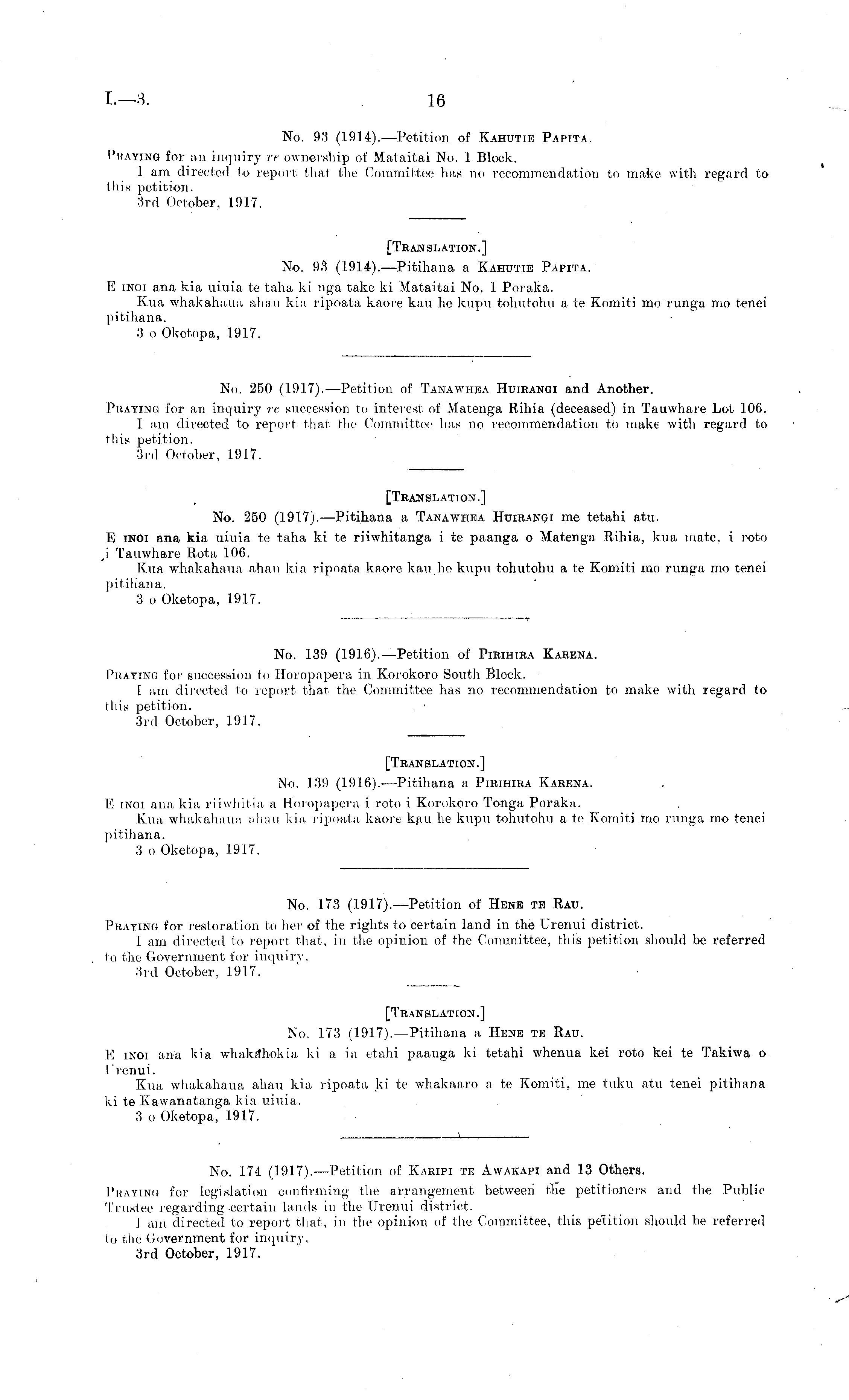 No. 93 (1914).—Petition of Kahutie Paptta. Praying for an inquiry re ownership of Mataitai No. 1 Block. 1 am directed to report that the Committee has no recommendation to make with regard to I Iris petition. 3rd October, 1917. [Translation.] No. 93 (1914).—Pitihana a Kahutie Papita. E inoi ana kia uiuia te taha ki nga take ki Mataitai No. 1 Poraka. Kua whakahaua ahau kia ripoata kaore kau he kupu tohutohu a te Komiti mo runga mo tenei pitihana. 3 o Oketopa, 1917.