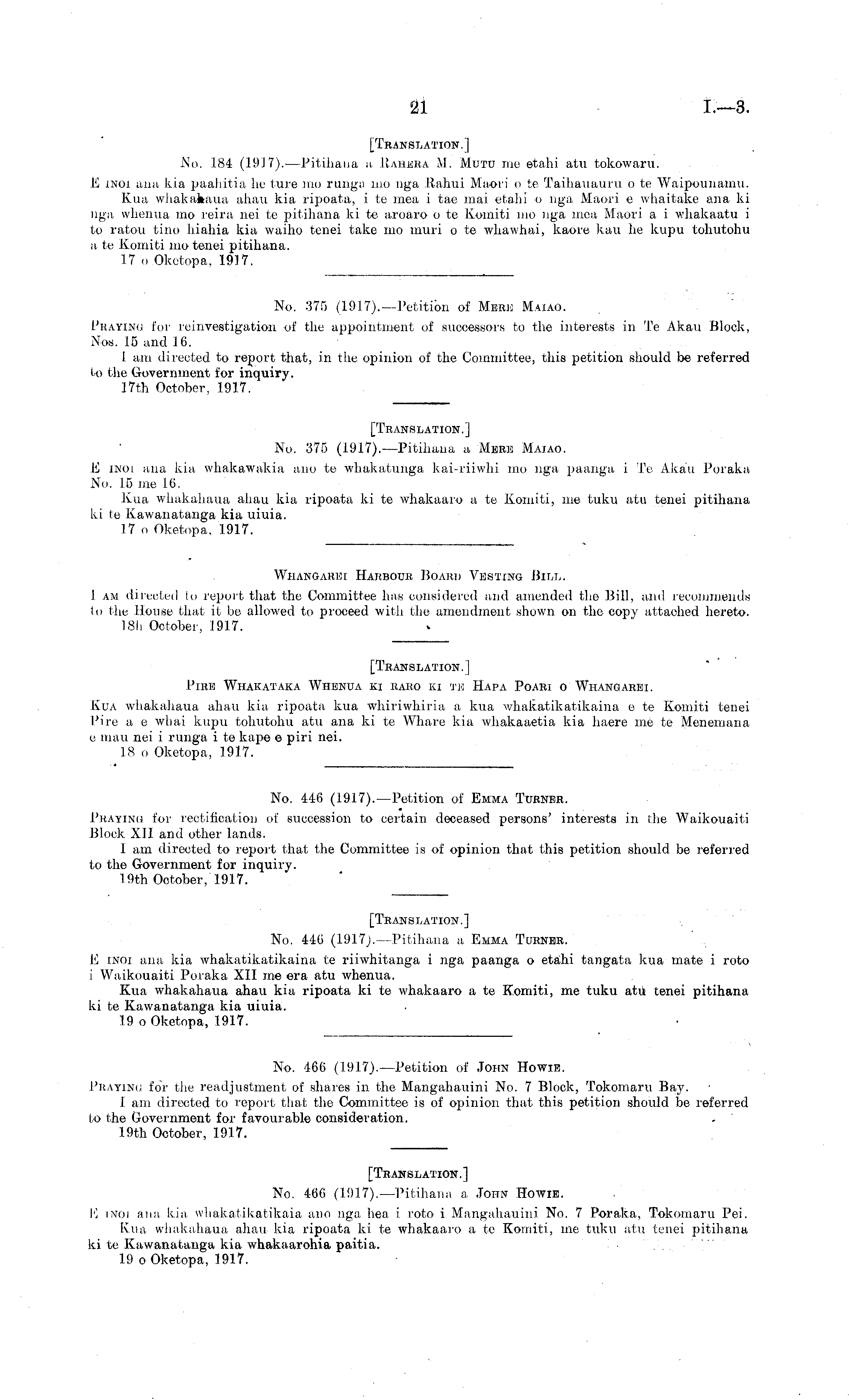 [Translation.] No. 184 (1917). —Pitihana a Rahera M. Mutu me etahi atu tokowaru. E inoi ana kia paahitia he ture mo runga mo nga Rahui Maori o te Taihauauru o te Waipounaniu. Kua whakakaua ahau kia ripoata, i te mea i tae mai etahi o nga Maori c whaitake ana ki nga whenua mo reira nei te pitihana kite aroaro o te Komiti mo nga mea Maori a i whakaatu i to ratou tino hiahia kia waiho tenei take mo muri o te whawhai, kaore kau he kupu tohutohu a te Komiti mo tenei pitihana. 17 o Oketopa, 1917.