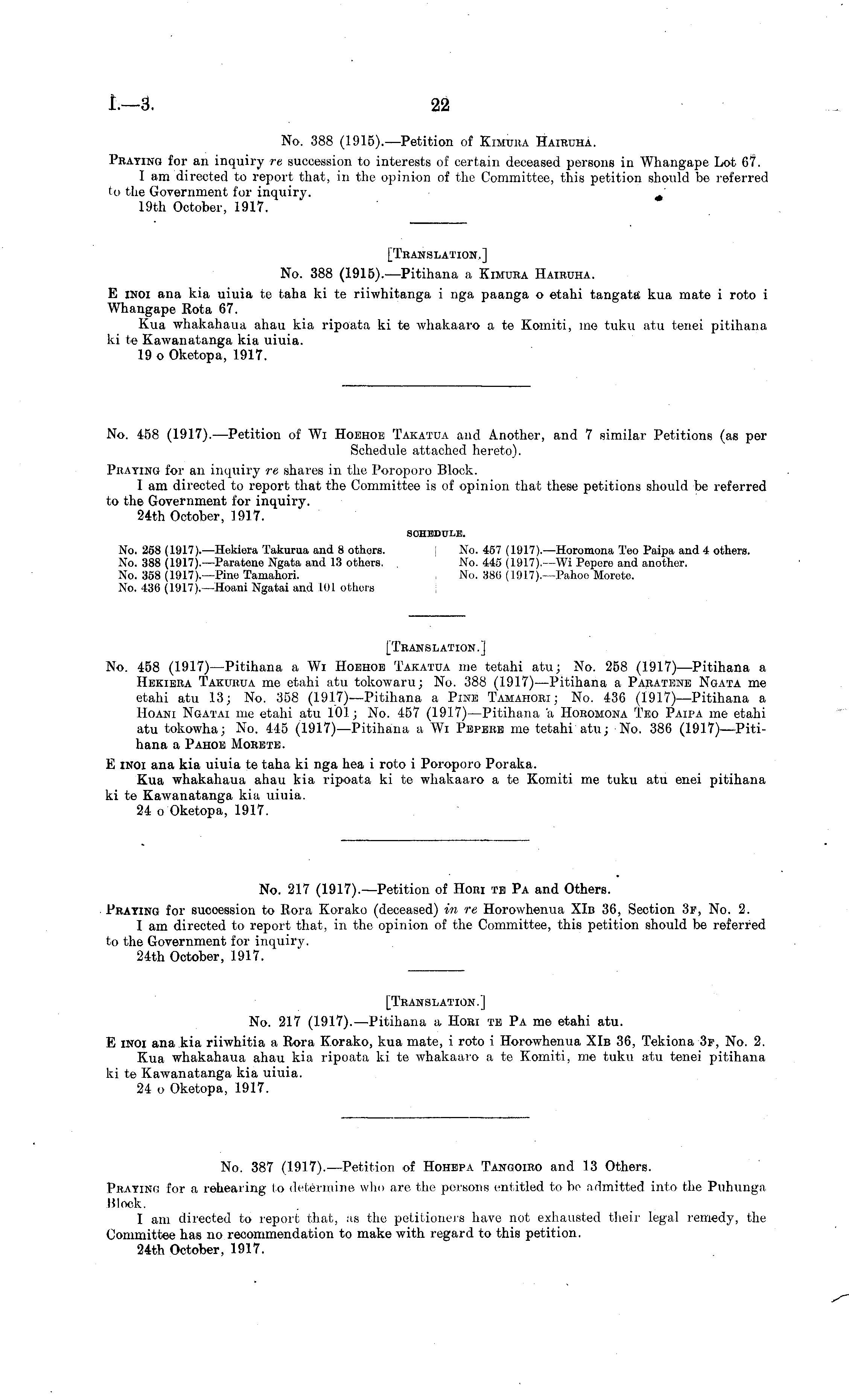 No. 387 (1917).—Petition of Hohbpa Tangoiro and 13 Others. Praying for a rehearing to determine who are the persons entitled to be admitted into the Puhunga Block. I am directed to report that, as the petitioners have not exhausted their legal remedy, the Committee has no recommendation to make with regard to this petition. 24th October, 1917.