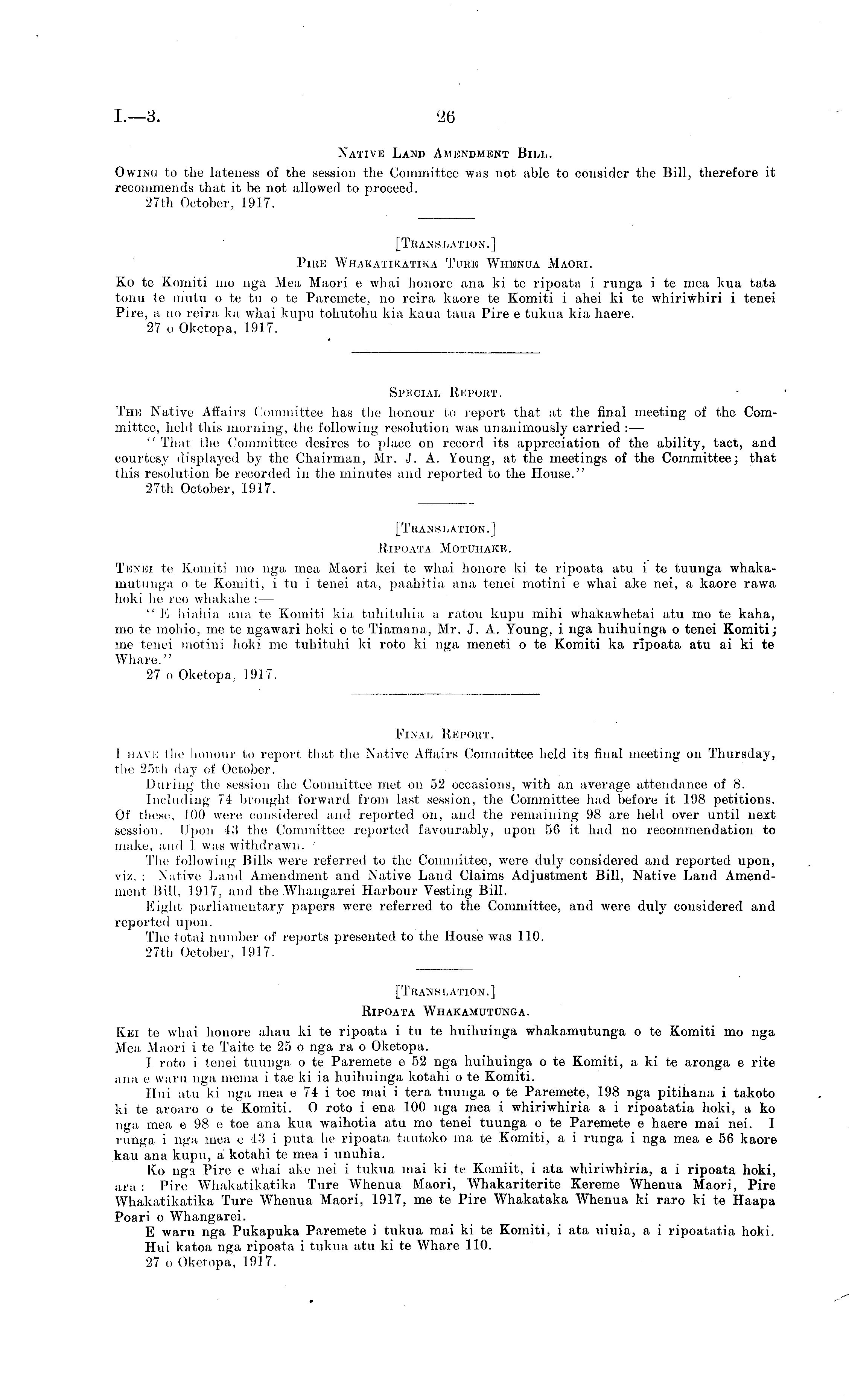 Special Report. The Native Affairs Committee has the honour to report that at the final meeting of the Committee, held this morning, the following resolution was unanimously carried : — " That the Committee desires to place on record its appreciation of the ability, tact, and courtesy displayed by the Chairman, Mr. J. A. Young, at the meetings of the Committee; that this resolution be recorded in the minutes and reported to the House." 27th October, 1917. [Translation.] Ripoata Motuhake. Tenei te Komiti mo nga mea Maori kei te whai honore kite ripoata atu i te tuunga whakamutunga o te Komiti, i tv i tenei ata, paahitia ana tenei motini c whai ake nei, a kaore rawa hold he reo whakahe :— " E hiahia ana te Komiti kia tuhituhia a ratou kupu mihi whakawhetai atu mo te kaha, mo te mohio, me te ngawari hold o te Tiamana, Mr. J. A. Young, i nga huihuinga o tenei Komiti; me tenei motini hold me tuhituhi ki roto ki nga meneti o te Komiti ka ripoata atu ai kite Whare." 27 o Oketopa, 1917.