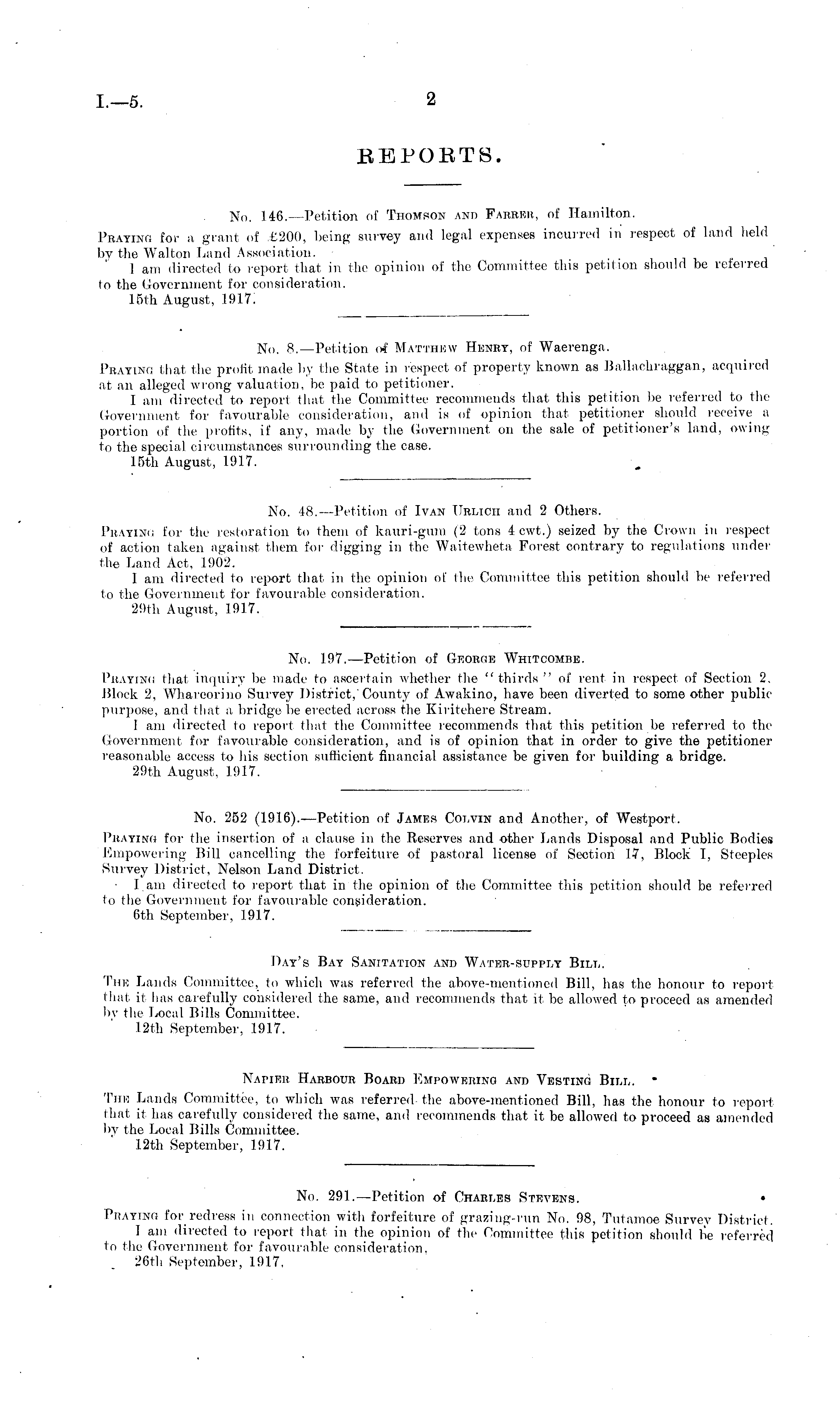 BEPORTB. No. 146.—Petition of Thomson and Farrbr, of Hamilton. Praying for a grant of £200, being survey and legal expenses incurred in respect of land hold by the Walton Land Association. - I am directed to report that in the opinion of the Committee this petition should be referred to the Government for consideration. 15th August, 1917.