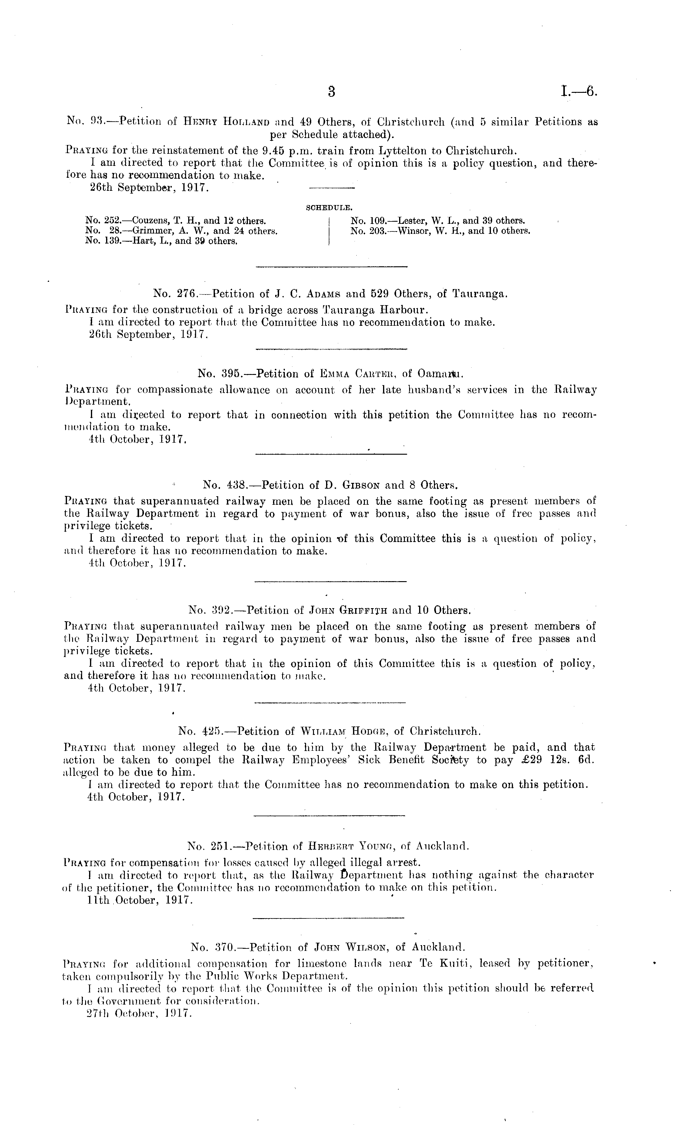 No. 93.—Petition of Henry Holland and 49 Others, of Christchurch (and 5 similar Petitions as per Schedule attached). Praying for the reinstatement of the 9.45 p.m. train from Lyttelton to Christchurch. I am directed to report that the Committee is of opinion this is a policy question, and therefore has no recommendation to make. 26th September, 1917. SCHEDULE. No. 252. —Couzens, T. H., and 12 others. j No. 109. —Lester, W. L., and 39 others. No. 28.—Grimmer, A. W., and 24 others. No. 203.—Winsor, W. H., and 10 others. No. 139. —Hart, L., and 39 others.