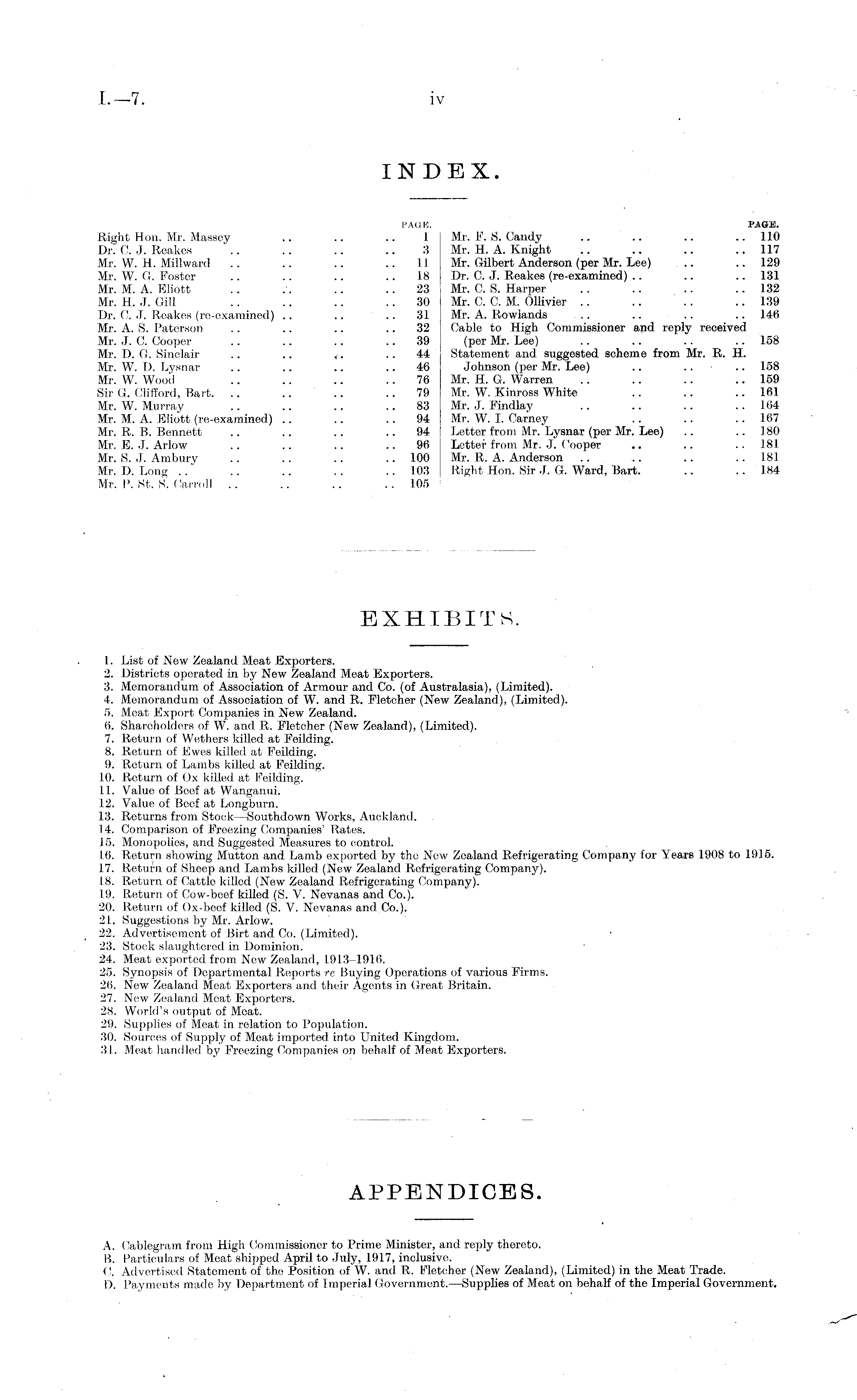 EXHIBITS. 1. List of New Zealand .Meat Exporters. 2. Districts operated in by New Zealand Meat Exporters. 3. Memorandum of Association of Armour and Co. (of Australasia), (Limited). 4. Memorandum of Association of W. and R. Fletcher (New Zealand), (Limited). 5. Meat Export Companies in. New Zealand. 6. Shareholders of W. and R. Fletcher (New Zealand), (Limited). 7. Return of Wethers killed at Feilding. 8. Return of Ewes killed at Feilding. 9. Return of Lambs killed at Feilding. 10. Return of Ox killed at Feilding. 11. Value of Beef at Wanganui. 12. Value of Beef at Longburn. 13. Returns from Stock —Southdown Works, Auckland. 14. Comparison of Freezing Companies' Rates. 1.5. Monopolies, and Suggested Measures to control. 1.6. Return showing Mutton and Lamb exported by the New Zealand Refrigerating Company for Years 1908 to 1915. 17. Return of Sheep and Lambs killed (New Zealand Refrigerating Company). 18. Return of Cattle killed (New Zealand Refrigerating Company). 19. Return of Cow-beef killed (S. V. Nevanas and Co.). 20. Return of Ox-beef killed (S. V. Nevanas and Co.). 21. Suggestions by Mr. Arlow. 22. Advertisement of Birt and Co. (Limited). 23. Stock slaughtered in Dominion. 24. Meat exported from New Zealand, 1.913-1916. 25. Synopsis of Departmental Reports re Buying Operations of various Firms. 26. New Zealand Moat Exporters and their Agents in Great Britain. 27. New Zealand Meat Exporters. 28. World's output of Moat. 29. Supplies of Meat in relation to Population. 30. Sources of Supply of Meat Imported into United Kingdom. 31. Meat handled by Freezing Companies on behalf of Meat Exporters.