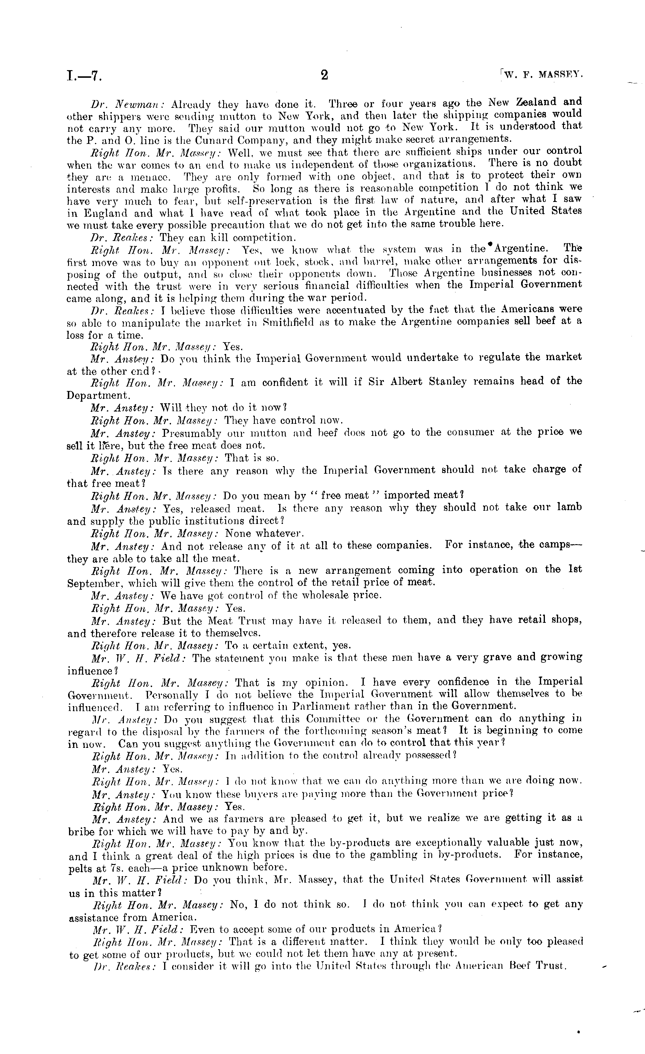 Dr. Newman: Already they have done it. Three or four years ago the New Zealand and other shippers were sending mutton to New York, and then later the shipping companies would not carry any more. They said our mutton would not go to New York. It is understood that the P. and 0. line is the Cunard Company, and they might make secret arrangements. Right Ron. Mr. Massey: Well, we must see that there are sufficient ships under our control when the war comes to an end to make us independent of those organizations. There is no doubt ■they are a menace. They are only formed with one object, and that is to protect their own interests and make large profits. So long as there is reasonable competition 1 do not think we have very much to fear, but self-preservation is the first law of nature, anil after what I saw in England and what I have read of what took place in the Argentine and the United States we must take every possible precaution that we do not get into the same trouble here. Dr. Reakes: They can kill competition. Right Hon. Mr. Massey: Yes, we know whai the system was in the Argentine. The first move was to buy an opponent out lock, stuck, and barrel, make other arrangements for disposing of the output, and so close their opponents down. Those Argentine businesses not connected with the trust were in very serious financial difficulties when the Imperial Government came along, and it is helping them during the war period. Dr. Reakes: I believe those difficulties were accentuated by the fact that the Americans were so able to manipulate the market in Smitlifield as to make the Argentine companies sell beef at a loss for a time. Right Hon. Mr. Massey: Yes. Mr. Anstey: Do you think the Imperial Government would undertake to regulate the market at the other end 1 • Right Hon. Mr. Massey: I am confident it will if Sir Albert Stanley remains head of the Department. Mr. Anstey: Will they not, do it now? Right Hon. Mr. Massey: They have control now. Mr. Anstey: Presumably our mutton and beef does not go to the consumer at the price we sell it here, but the free meat does not. Right Hon. Mr. Massey: That is so. Mr. Anstey: Is there any reason why the Imperial Government should not take charge of that free meat ? Right Hon. Mr. Massey: Do you mean by " free meat " imported meat? Mr. Anstey: Yes, released meat. Is there any reason why they should not take our lamb and supply the public institutions direct? Right Hon. Mr. Massey: None whatever. Mr. Anstey: And not release any of it at, all to these companies. For instance, the camps — they are able to take all the meat. Right Ron. Mr. Massey: There is a new arrangement coming into operation on the Ist September, which will give them the control of the retail price of meat. Mr. Anstey: We have got control of the wholesale price. Right Hon. Mr. Massey: Yes. Mr. Anstey: But the Meat Trust may have if released to them, and they have retail shops, and therefore release it to themselves. Bight Hon. Mr. Massey: To a em-tain extent, yes. Mr. W. H. Field: The statement you make is that these men have a very grave and growing influence ? Right Hon. Mr. Massey: That is my opinion, I have every confidence in the Imperial Government. Personally Ido not believe the Imperial Government will allow themselves to be influenced. lam referring to influence in Parliament rather than in the Government. Mr. Anstey: Do you suggest that this Commit lee or the Government can do anything in regard to the disposal by the farmers of the forthcoming season's meat? It is beginning to come in now. Can you suggest anything the Government can do to control that this year? Right Hon. Mr. Massey: In addition to the control already possessed? Mr. Anstey: Yes. Right Hon. Mr. Massey: 1 do not know that we can do anything more than we are doing now. Mr. Anstey: You know these buyers are paying more than the Government price? Right Hon. Mr. Massey: Yes. Mr. Anstey: And we as farmers are pleased to get it, but we realize we are getting it as a bribe for which we will have to pay by and by. Right Hon. Mr. Massey: You know that the by-products are exceptionally valuable just now, and I think a great deal of the high prices is due to the gambling in by-products. For instance, pelts at 7s. each —a price unknown before. Mr. W. If. Field: Do you think, Mr. Massey, that the United States Government will assist us in this matter 1 Right Hon. Mr. Massey: No, I do not think so. I do no! think you can expect, to get any assistance from America. Mr. W. H. Field: Even to accept some of our products in America? Right Ron. Mr. Massey: That is a different matter. I think they would be only too pleased to get some of our products, but, we could not let them have any at present. Dr. Reakes: I consider it will go into the United Stales through the American Beef Trust.