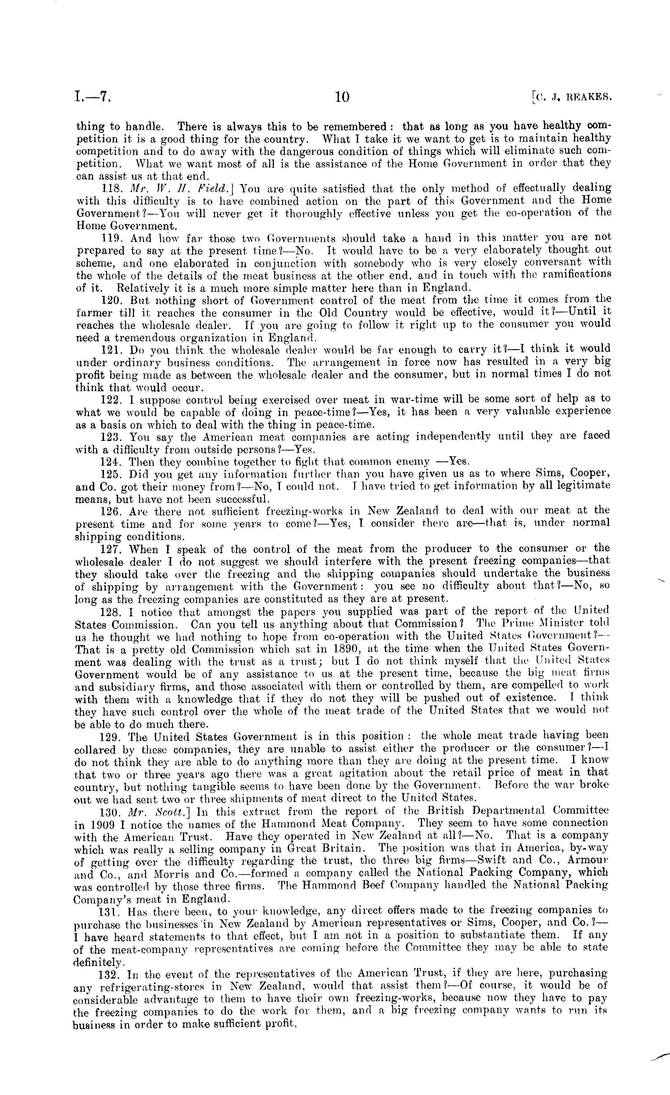 thing to handle. There is always this to be remembered : that as long as you have healthy competition it is a good thing for the country. What I take it we want to get is to maintain healthycompetition and to do away with the dangerous condition of things which will eliminate such competition. What we want most of all is the assistance of the Home Government in order that they can assist us at that end. 118. Mr. W. 11. Field.] You are quite satisfied that the only method of effectually dealing with this difficulty is to have combined action on the part of this Government and the Home Government? —You will never get it thoroughly effective unless you get the co-operation of the Home Government. 119. And how far those two Governments should take a hand in this matter you are not prepared to say at the present time? —No. It would have to be a very elaborately thought out scheme, and one elaborated in conjunction with somebody who is very closely conversant with the whole of the details of the meat business at the other end, and in touch with the ramifications of it. Relatively it is a much more simple matter here than in England. 120. But nothing short of Government control of the meat from the time it comes from the farmer till it reaches the consumer in the Old Country would be effective, would it? —Until it reaches the wholesale dealer. If you are going to follow it right up to the consumer you would need a tremendous organization in England. 121. Do you think the wholesale dealer would be far enough to carry it?—l think it would under ordinary business conditions. The arrangement in force now has resulted in a very bigprofit being made as between the wholesale! dealer and the consumer, but in normal times I do not think that would occur. 122. I suppose control being exercised over meat in war-time will be some sort of help as to what we would be capable of doing in peace-time? —Yes, it has been a very valuable experience as a basis on which to deal with the thing in peace-time. 123. You say the Amerioan meat companies are acting independently until they are faced with a difficulty from outside persons?— Yes. 124. Then they combine together to fight that common enemy —Yes. 125. Did you get any information further than you have given us as to where Sims, Cooper, and Co. got their money from?—No, I could not. T have tried to get information by all legitimate means, but have not been successful. 126. Are there not sufficient freezing-works in New Zealand to deal with our meat at the present time and for some years to come?— Yes, I consider (here are —that, is, under normal shipping conditions. 127. When I speak of the control of the meat from the producer to the consumer or the wholesale dealer I do not suggest we should interfere with the present freezing companies—that they should take over the freezing and the shipping companies should undertake the business of shipping by arrangement with the Government: you see no difficulty about that? —No, so long as the freezing companies are constituted as they are at present. 128. I notice that amongst the papers you supplied was part of the report of the United States Commission. Can you tell us anything about that Commission? The Prime Minister told us he thought we had nothing to hope from co-operation with the United States Government? — That is a pretty old Commission which sat in 1890, at the time when the United States Government was dealing with the trust as a trust; but I do not think myself that the United States Government would be of any assistance to us at the present time, because the big meat firms and subsidiary firms, and those associated with them or controlled by them, are compelled to work with them with a knowledge that if they do not they will be pushed out of existence. 1 think they have such control over the whole of' the meat trade of the United States that we would not be able to do much there. 129. The United States Government, is in this position : the whole meat trade having been collared by these companies, they are unable to assist either the producer or the consumer? —I do not think they are able to do anything more than they are doing at the present time. I know that two or three years ago there was a, great agitation about the retail price of meat in that country, but nothing tangible seems to have been done by the Government. Before the war broke out we had sent two or three shipments of meat direct to the United States. 130. Mr. Scott.] In this extract from the report of the British Departmental Committee in 1909 I notice the names of the Hammond Meat Company. They seem to have some connection with the American Trust. Have they operated in New Zealand at. all?— No. That is a company which was really a selling company in Great Britain. The position was that in America, by-way of getting over the difficulty regarding the trust, the three big firms —Swift and Co., Armour and Co., and Morris and Co. —formed a company called the National Packing Company, which was controlled by those three firms. The Hammond Beef Company handled the National Packing Company's meat in England. 131. Has there been, to your knowledge, any direct, offers made to the freezing companies to purchase tho businesses'in New Zealand by Amerioan representatives or Sims, Cooper, and Co.?—I have heard statements to that effect, but lam not in a position to substantiate them. If any of the meat-company representatives are coming before the Committee they may be able to state definitely. 132. In the event of the representatives of the American Trust, if they are here, purchasing any refrigerating-storcs in New Zealand, would that, assist them? —Of course, it would be of considerable advantage to them to have their own freezing-works, because now they have to pay the freezing companies to do the work for them, and a big freezing company wants to run its business in order to make sufficient profit.