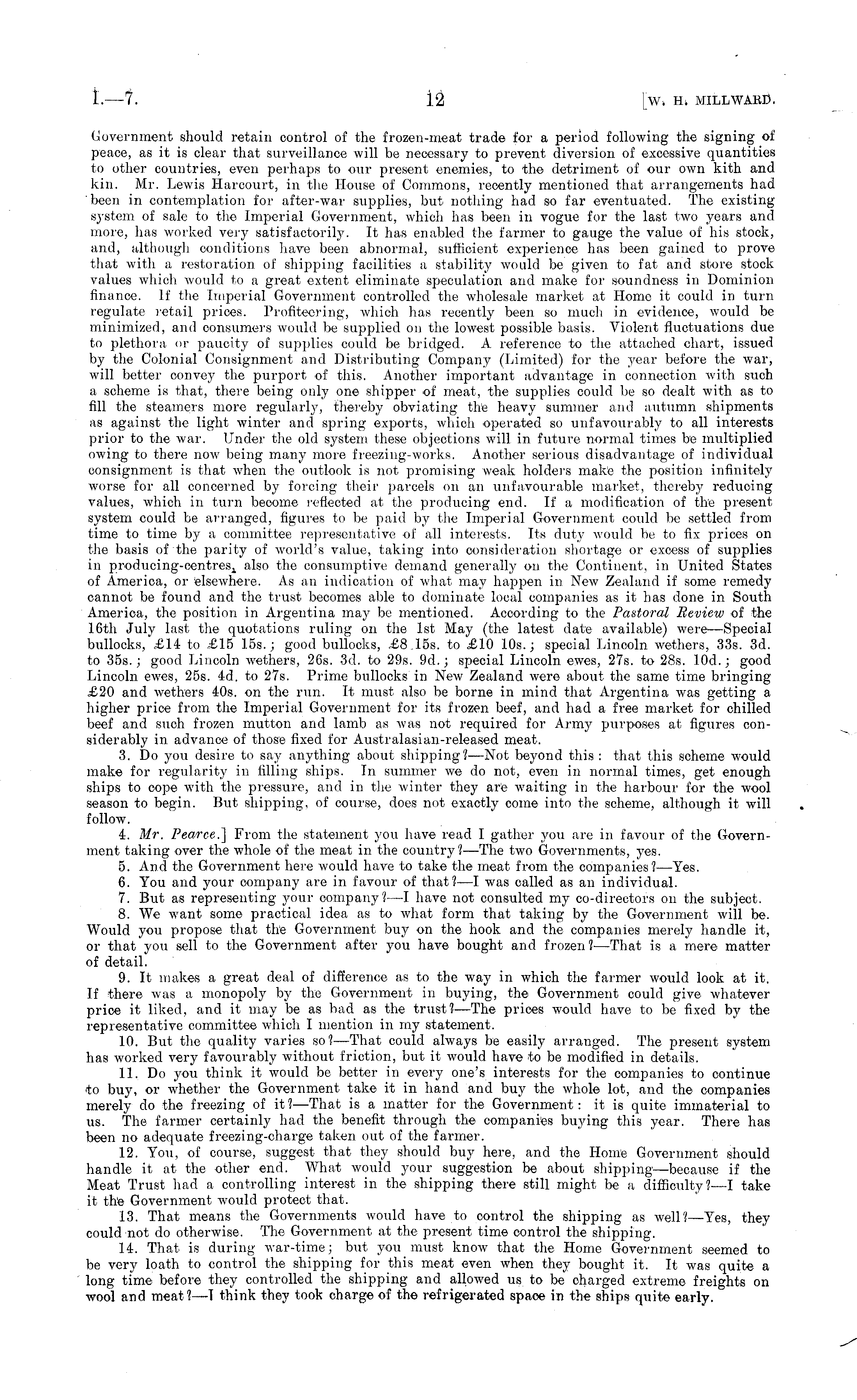 Government should retain control of the frozen-meat trade for a period following the signing of peace, as it is clear that surveillance will be necessary to prevent diversion of excessive quantities to other countries, even perhaps to our present enemies, to the detriment of our own kith and kin. Mr. Lewis Harcourt, in the House of Commons, recently mentioned that arrangements had been in contemplation for after-war supplies, but nothing had so far eventuated. The existing system of sale to the Imperial Government, which has been in vogue for the last two years and more, has worked very satisfactorily. It has enabled the farmer to gauge the value of his stock, and, although conditions have been abnormal, sufficient experience has been gained to prove that with a restoration of shipping facilities a stability would be given to fat and store stock values which would to a great extent eliminate speculation and make for soundness in Dominion finance. If the Imperial Government controlled the wholesale market at Home it could in turn regulate retail prices. Profiteering, which has recently been so much in evidence, would be minimized, and consumers would be supplied on the lowest possible basis. Violent fluctuations due to plethora or paucity of supplies could be bridged. A reference to the attached chart, issued by the Colonial Consignment and Distributing Company (Limited) for the j'ear before the war, will better convey the purport of this. Another important advantage in connection, with such a scheme is that, there being only one shipper of meat, the supplies could be so dealt with as to fill the steamers more regularly, thereby obviating the heavy summer and autumn shipments as against the light winter and spring exports, which operated so unfavourably to all interests prior to the war. Under the old system these objections will in future normal times be multiplied owing to there now being many more freezing-works. Another serious disadvantage of individual consignment is that when the outlook is not promising weak holders make the position infinitely worse for all concerned by forcing their parcels on an unfavourable market, thereby reducing values, which in turn become reflected at the producing end. If a modification of the present system could be arranged, figures to be paid by the Imperial Government could be settled from time to time by a committee representative of all interests. Its duty would be to fix prices on the basis of the parity of world's value, taking into consideration shortage or excess of supplies in producing-centreSj. also the consumptive demand generally on the Continent, in United States of America, or elsewhere. As an indication of what may happen in New Zealand if some remedy cannot be found and the trust becomes able to dominate local companies as it has done in South America, the position in Argentina may be mentioned. According to the Pastoral Review of the 16th July last the quotations ruling on the Ist May (the latest date available) were—Special bullocks, £14 to £15 155.; good bullocks, £8,155. to £10 10s.; special Lincoln wethers, 335. 3d. to 355.; good Lincoln wethers, 265. 3d, to 295. 9d.; special Lincoln ewes, 275. to 28s. lOd.; good Lincoln ewes, 255. 4d. to 275. Prime bullocks in New Zealand were about the same time bringing £20 and wethers 40s. on the run. It must also be borne in mind that Argentina was getting a higher price from the Imperial Government for its frozen beef, and had a free market for chilled beef and such frozen mutton and lamb as was not required for Army purposes at figures considerably in advance of those fixed for Australasian-released meat. 3. Do you desire to say anything about shipping?— Not beyond this : that this scheme would make for regularity in tilling ships. In summer we do not, even in normal times, get enough ships to cope with the pressure, and in the winter they are waiting in the harbour for the wool season to begin. But shipping, of course, does not exactly come into the scheme, although it will follow. 4. Mr. Pearce.] From the statement you have read I gather you are in favour of the Government taking over the whole of the meat in the country?— The two Governments, yes. 5. And the Government here would have to take the meat from the companies?— Yes. 6. You and your company are in favour of that? —I was called as an individual. 7. But as representing your company? —I have not consulted my co-directors on the subject. 8. We want some practical idea as to what form that taking by the Government will be. Would you propose that the Government buy on the hook and the companies merely handle it, or that you sell to the Government after you have bought and frozen ?—That is a mere matter of detail. 9. It makes a great deal of difference as to the way in which the farmer would look at it. If there was a monopoly by the Government in buying, the Government could give whatever price it liked, and it may be as bad as the trust? —The prices would have to be fixed by the representative committee which I mention in my statement. 10. But the quality varies so?— That could always be easily arranged. The present system has worked very favourably without friction, but it would have to be modified in details. 11. Do you think it would be better in every one's interests for the companies to continue to buy, or whether the Government take it in hand and buy the whole lot, and the companies merely do the freezing of it ?—That is a matter for the Government: it is quite immaterial to us. The farmer certainly had the benefit through the companies buying this year. There has been no adequate freezing-charge taken out of the farmer. 12. You, of course, suggest that they should buy here, and the Home Government should handle it at the other end. What would your suggestion be about shipping—because if the Meat Trust had a controlling interest in the shipping there still might be a difficulty?—l take it the Gove