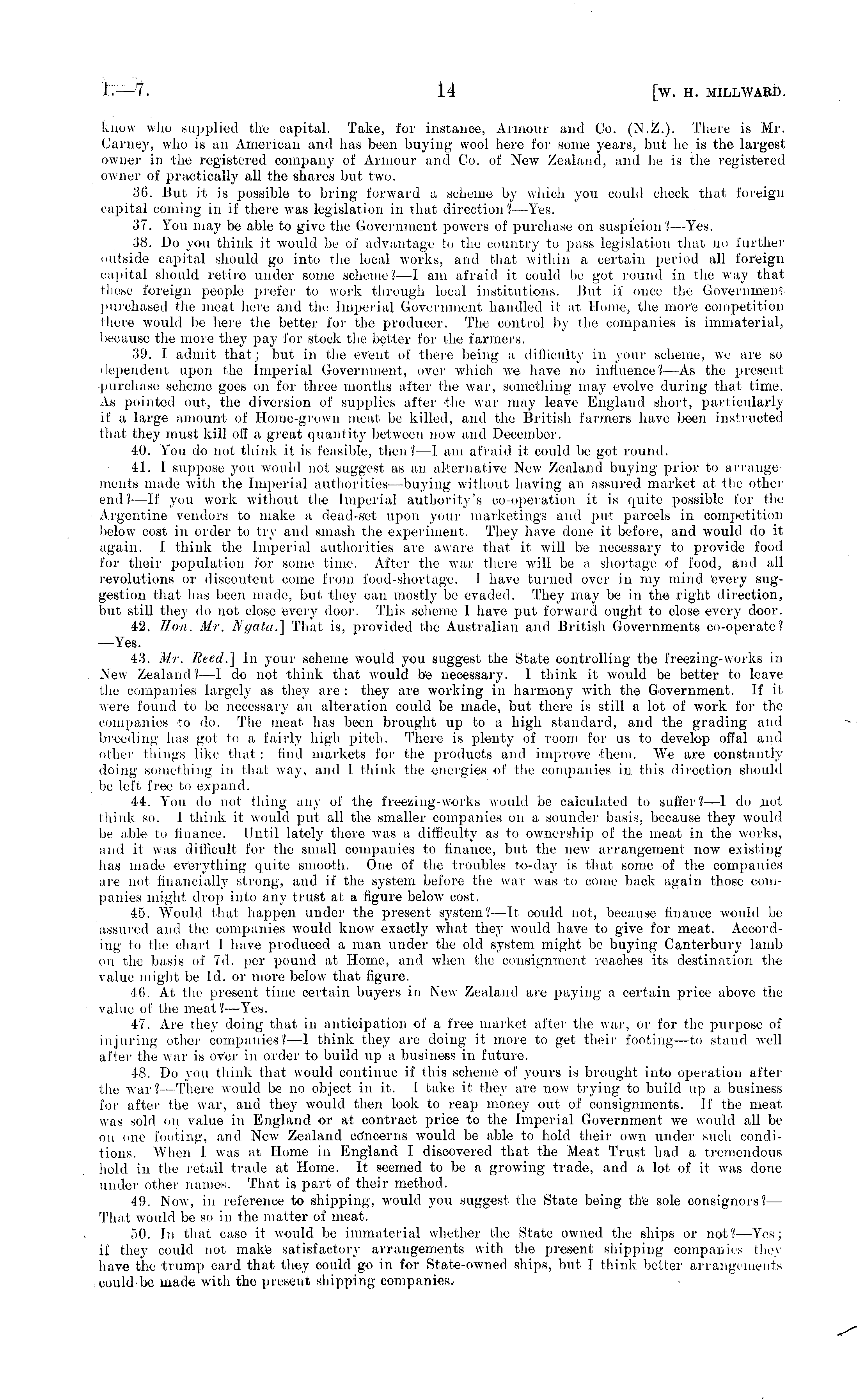 know who supplied the capital. Take, for instance, Armour and Co. (N.Z.). There is Mr. Carney, who is an American and has been buying wool here for some years, but he is the largest owner in the registered company of Armour and Co. of New Zealand, and he is the registered owner of practically all the shares but two. 36. But it is possible to bring forward a scheme by which you could check that foreign capital coining in if there was legislation in that direction ?—Yes. 37. You may be able to give the Government powers of purchase on suspicion?— Yes. 38. Do you think it would be of advantage to the country to pass legislation that no further outside capital should go into the local works, and that within a certain period all foreign capital should retire under some scheme?—l am afraid it could be got round in I lie way that these foreign people prefer to work through local institutions. But if once the Government purchased the meat here and the Imperial Government handled it at Home, the more competition there would be here the better for the producer. The control by the companies is immaterial, because the more they pay for stock the better for the farmers. 39. I admit that; but in the event of there being a difficulty in your scheme, we are so dependent upon the Imperial Government, over which we have no influence? —As the present purchase scheme goes on for three months after the war, something may evolve during that time. As pointed out, the diversion of supplies after the war may leave England short, particularly if a large amount of Home-grown meat be killed, and the British farmers have been instructed that they must kill off a great quantity between now and December. 40. You do not think it is feasible, then?—l am afraid it could be got round. 41. I siipjsoso you would not suggest as an alternative New Zealand buying prior to arrangements made with the Imperial authorities—buying without having an assured market at the other end?—lf you work without the Imperial authority's co-operation it is quite possible for the Argentine vendors to make a dead-set upon your marketings and put parcels in competition below cost in order to try and smash the experiment. They have done it before, and would do it again. I think the Imperial authorities are aware that it will be necessary to provide food for their population for some time. After the war there will be a shortage of food, and all revolutions or discontent come from food-shortage. I have turned over in my mind every suggestion that has been made, but they can mostly be evaded. They may be in the right direction, but still they do not close every door. This scheme I have put forward ought to close every door. 42. Hon. Mr. Ncjata.] That is, provided the Australian and British Governments co-operate? —Yes. 43. Mr. Reed.] In your scheme would you suggest the State controlling the freezing-works in New Zealand? —I do not, think that would be necessary. I think it would be better to leave the companies largely as they are : they are working in harmony with the Government. If it were found to be necessary an alteration could be made, but there is still a lot of work for the companies to do. The meat has been brought up to a high standard, and the grading and breeding has got to a fairly high pitch. There is plenty of room for us to develop offal and other tilings like that: find markets for the products and improve them. We are constantly doing something in that way, and I think the energies of the companies in this direction should be left free to expand. 44. You do not thing any of the freezing-works would be calculated to suffer?—l do not think so. I think it would put all the smaller companies on a sounder basis, because they would be able to finance. Until lately there was a difficulty as to ownership of the meat in the works, and it was difficult for the small companies to finance, but the new arrangement now existing has made everything quite smooth. One of the troubles to-day is that some of the companies are not financially strong, and if the system before the war was to come back again those companies might drop into any trust at a figure below cost. 45. Would that happen under the present system? —It could not, because finance would be assured anil the companies would know exactly what they would have to give for meat. According to the chart I have produced a man under the old system might be buying Canterbury lamb on the basis of 7d. per pound at Home, and when the consignment reaches its destination the value might be Id. or more below that figure. 46. At tho present time certain buyers in New Zealand are paying a certain price above the value of the meat? —Yes. 47. Are they doing that in anticipation of a free market after the war, or for the purpose of injuring other companies?—l think they are doing it more to get their footing—to stand well after the war is over in order to build up a business in future. 48. Do you think that would continue if this scheme of yours is brought into operation after the war? —There would be no object in it. I take it they are now trying to build up a business for after the war, and they would then look to reap money out of consignments. If the meat was sold on value in England or at contract price to the Imperial Government we would all be on one footing, and New Zealand cefneerns would be able to hold their own under such conditions. AVhen 1 was at Home in England I discovered that the Meat Trust had a tremendous hold in the retail trade at Home. It seemed to be a growing trade, and a lot of it was done under other names. That is part of their method. 49. Now, in reference to shipping, would you suggest the State being the sole consignors?— That would be so in the matter of meat. 50. In that case it would be immaterial whether the State owned the ships or not?— Yes; if they could not make satisfactory arrangements with the present shipping companies they have th