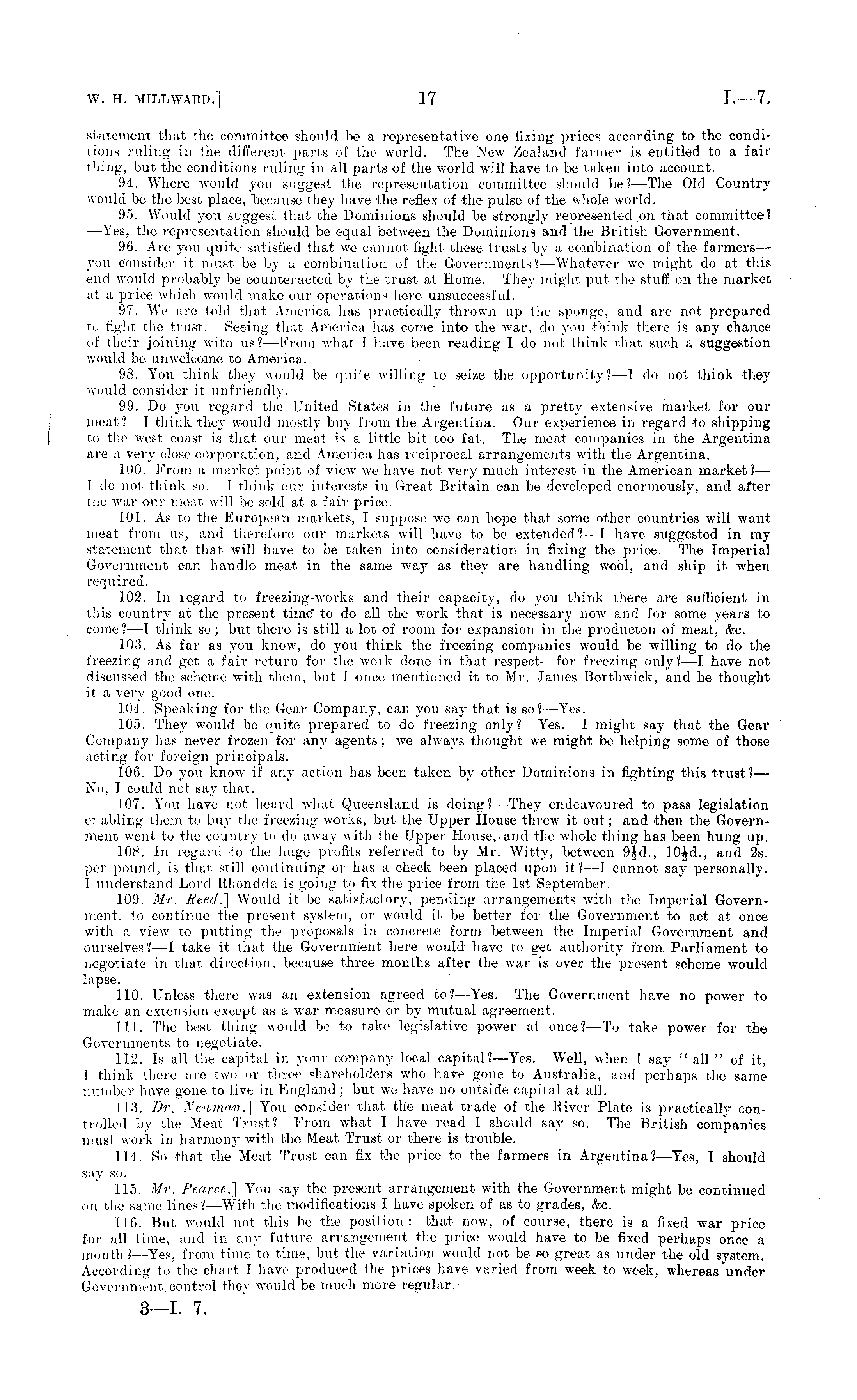 statement that the committee should be a representative one fixing prices according to the conditions ruling in the different parts of the world. The New Zealand farmer is entitled to a failthing, but the conditions ruling in all parts of the world will have to be taken into account. 94. Where would you suggest the representation committee should be?— The Old Country would be the best place, because they have the reflex of the pulse of the whole world. 95. Would you suggest that the Dominions should be strongly represented on that committee? —Yes, the representation should be equal between the Dominions and the British Government. 96. Are you quite satisfied that we cannot fight these trusts by a combination of the farmers — you Consider it must be by a combination of the Governments? —Whatever we might do at this end would probably be counteracted by the trust at Home. They might put the stuff on the market at a price which would make our operations here unsuccessful. 97. We are told that America has practically thrown up the sponge, and are not prepared to fight the trust. Seeing that America has come into the war, do you think there is any chance of their joining with us? —From what I have been reading I do not think that such v suggestion would be unwelcome to America. 98. You think they would be quite willing to seize the opportunity? —I do not think they would consider it unfriendly. 99. Do you regard the United States in the future as a pretty extensive market for our meat? —I think they would mostly buy from the Argentina. Our experience in regard to shipping to the west coast is that our meat is a little bit too fat. The meat companies in the Argentina are a very close corporation, and America has reciprocal arrangements with the Argentina. 100. From a market point of view we have not very much interest in the American market? — Ido not think so. 1 think our interests in Great Britain can be developed enormously, and after the war our meat will be sold at a fair price. 101. As to the European markets, I suppose we can hope that some other countries will want meat, from us, and therefore our markets will have to be extended? —T have suggested in my statement that that will have to be taken into consideration in fixing the price. The Imperial Government can handle meat in the same way as they are handling wool, and ship it when required. 102. In regard to freezing-works and their capacity, do you think there are sufficient in this country at the present time" to do all the work that is necessary now and for some years to come?—l think so; but there is still a lot of room for expansion in the producton of meat, &c. 103. As far as you know, do you think the freezing companies would be willing to do the freezing and get a fair return for the work done in that respect—for freezing only?—I have not discussed the scheme with them, but, J once mentioned it to Mr. James Borthwick, and he thought it a very good one. 104. Speaking for the Gear Company, can you say that is so?- —Yes. 105. They would be quite prepared to do freezing only?— Yes. I might say that the Gear Company has never frozen for any agents; we always thought we might be helping some of those acting for foreign principals. 106. Do you know if any action has been taken by other Dominions in fighting this trust?— No, I could not say that. 107. You have not heard what Queensland is doing?— They endeavoured to pass legislation enabling them to buy the freezing-works, but the Upper House threw it out; and then the Government went to the country to do away with the Upper House,-and the whole thing has been hung up. 108. In regard to the huge profits referred to by Mr. Witty, between 9|d., Iojd., and 2s. per pound, is that still continuing or has a check been placed upon it?—l cannot say personally. I understand Lord Rhondda is going to fix the price from the Ist September. 109. Mr. Reed.] Would it be satisfactory, pending arrangements with the Imperial Government, to continue the present system, or would it be better for the Government to act at once with a view to putting the proposals in concrete form between the Imperial Government and ourselves? —I take it that the Government here would have to get authority from Parliament to negotiate in that direction, because three months after the war is over the present scheme would lapse. 110. Unless there was an extension agreed to?— Yes. The Government have no power to make an extension except as a war measure or by mutual agreement. 111. The best thing would be to take legislative power at once? —To take power for the Governments to negotiate. 112. Is all the capital in your company local capital?— Yes. Well, when I say " all " of it, I think there are two or three shareholders who have gone to Australia, and perhaps the same number have gone to live in England; but we have no outside capital at all. 113. Dr. Newman.] You consider that the meat trade of the River Plate is practically controlled by the Meat Trust?— From what T have read I should say so. The British companies must, work in. harmony with the Meat Trust or there is trouble. 114. So that the Meat Trust can fix the price to the farmers in Argentina?— Yes, I should say so. 115. Mr. Pearce.] You say the present arrangement with the Government might be continued on the same lines? —With the modifications I have spoken of as to grades, &c. 116. But would not this be the position : that now, of course, there is a fixed war price for all time, and in any future arrangement the price would have to be fixed perhaps once a month? —Yes, from time to time, but the variation would not be so great as under the old system. According to the chart I have produced the prices have varied from week to week, whereas under Government control they would be much more regular, 3—l. 7.