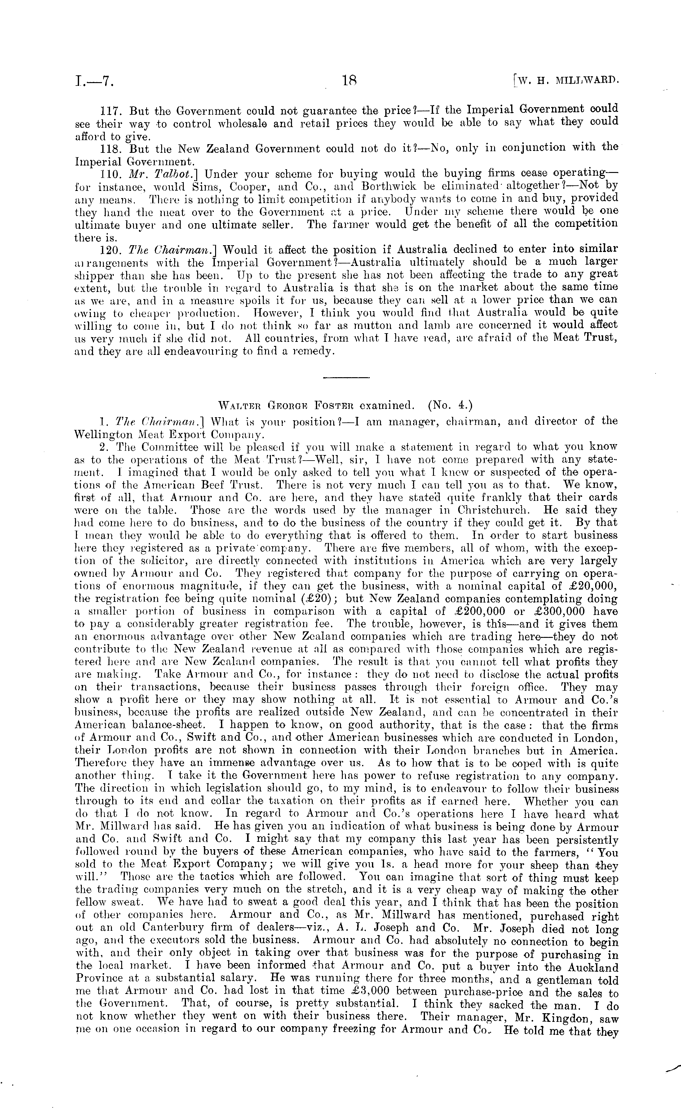 117. But the Government could not guarantee the price? —If the Imperial Government could see their way to control wholesale and retail prices they would be able to say what they could afford to give. 118. But the New Zealand Government could not do it?—No, only in conjunction with the Imperial Government. 110. Mr. Talbot.] Under your scheme for buying would the buying firms cease operating — for instance, would Sims, Cooper, and Co., and Borthwick be eliminated altogether? —Not by any means. There is nothing to limit competition if anybody wants to come in and buy, provided they hand the meat over to the Government at a price. Under my scheme there would be one ultimate buyer and one ultimate seller. The farmer would get the benefit of all the competition there is. 120. The Chairman.] Would it affect the position if Australia declined to enter into similar arrangements with the Imperial Government? —Australia ultimately should be a much larger shipper than she has been. Up to the present she has not been affecting the trade to any great extent, but, the trouble in regard to Australia is that she is on the market about the same time as we are, and in a measure spoils it, for us, because they can sell at a lower price than we can owing to cheaper production. However, I think you would find that Australia would be quite willing to come in, but I do not think so far as mutton and lamb are concerned it would affect us very much if she did not. All countries, from what I have read, are afraid of the Meat Trust, and they are all endeavouring to find a remedy. Walter George Foster examined. (No. 4.) 1. The Chairman.] What is your position? —I am manager, chairman, and director of the Wellington Meat Export Company. 2. The Committee will be pleased if you will make a statement, in regard to what you know as to the operations of the Meat Trust? —Well, sir, I have not come prepared with any statement. I imagined that I would be only asked to tell you what I knew or suspected of the operations of the American Beef Trust. There is not verj' much I can tell you as to that. We know, first of all, that Armour and Co. are here, and they have stated quite frankly that their cards were on the table. Those are the words used by the manager in Christchurch. He said they had come here to do business, and to do the business of the country if they could get it. By that I mean they would be able to do everything that is offered to them. In order to start business here they registered as a private'company. There are five members, all of whom, with the exception of the solicitor, are directly connected with institutions in America which are very largely owned by Armour and Co. They registered that company for the purpose of carrying on operations of enormous magnitude, if they can get the business, with a nominal capital of £20,000, the registration fee being quite nominal (£20); but New Zealand companies contemplating doing a smaller portion of business in comparison with a capital of £200,000 or £300,000 have to pay a considerably greater registration fee. The trouble, however, is this —and it gives them, an enormous advantage over other New Zealand companies which are trading here —they do not contribute to the New Zealand revenue at all as compared with those companies which are registered here and are New Zealand companies. The result is that you cannot tell what profits they are making. Take Armour and Co., for instance: they do not need to disclose the actual profits on their transactions, because their business passes through their foreign office. They may show a profit here or they may show nothing at all. It is not essential to Armour and Co.'s business, because the profits are realized outside New Zealand, and can lie concentrated in their American balance-sheet. I happen to know, on good authority, that is the case : that the firms of Armour and Co., Swift and Co., and other American businesses which are conducted in London, their London profits are not shown in connection with their London branches but in America. Therefore they have an immense advantage over us. As to how that is to be coped with is quite another thing. T take it the Government here has power to refuse registration to any company. The direction in which legislation should go, to my mind, is to endeavour to follow their business through to its end and collar the taxation, on their profits as if earned here. Whether you can do that I do not know. In regard to Armour and Co.'s operations here I have heard what Mr. Millward has said. He has given you an indication of what business is being done by Armour and Co. and Swift and Co. I might say that my company this last year has been persistently followed round by the buyers of these American companies, who have said to the farmers, "You sold to the Meat Export Company; we will give you Is. a head more for your sheep than they will." Those are the tactics which are followed. You can imagine that sort of thing must keep the trading companies very much on the stretch, and it is a very cheap way of making the other fellow sweat. We have had to sweat a good deal this year, and I think that has been the position of other companies here. Armour and Co., as Mr. Millward has mentioned, purchased right out an old Canterbury firm of dealers —viz., A. L. Joseph and Co. Mr. Joseph died not Ion"--ago, and the executors sold the business. Armour and Co. had absolutely no connection to begin with, and their only object in taking over that business was for the purpose of purchasing in the local market. I have been informed that Armour and Co. put a buyer into the Auckland Province at a, substantial salary. He was running there for three months, and a gentleman told me that Armour and Co. had lost in that time £3,000 between purchase-price and the sales to the Government. That, of course, is pretty substantial. I think they sacked the man. I do not know whether they went on with the
