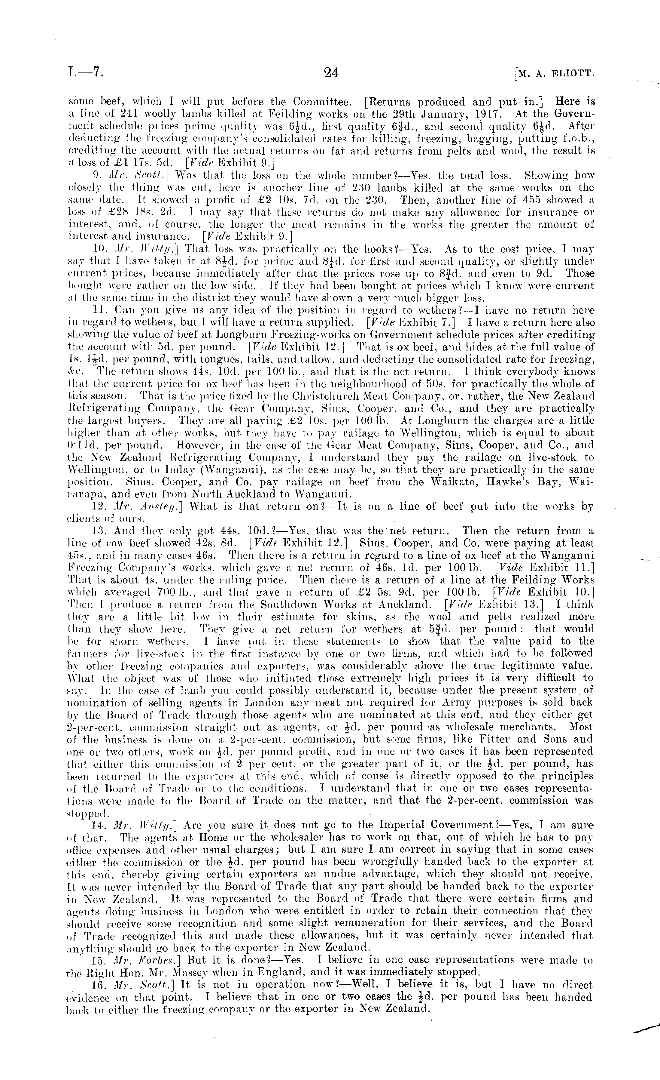 some beef, which I will put before the Committee. [Returns produced and put in.] Here is a line of 241 woolly lambs killed at Feilding works on the 29th January, 1917. At the Government schedule prices prime quality was 6Ad., first quality 6|d., and second quality 6-Jtl. After deducting the freezing company's consolidated rates for killing, freezing, bagging, putting f.0.b., crediting the account with the actual returns on fat and returns from pelts and wool, the result is a loss of £1 1.75. sd. [Vide Exhibit 9.] 9. Mr. Scott.] Was that the loss on the whole number? —Yes, the total loss. Showing how closely the thing was cut, here is another line of 230 lambs killed at the same works on the same date. It showed a profit of £2 10s. 7d. on the 230. Then, another line of 455 showed a loss of £28 18s. 2d. I may say that these returns do not make any allowance for insurance or interest, and, of course, the longer the meat remains in the works the greater the amount of interest and insurance. [Vide Exhibit !).J .10. Mr. 11'/////.J That, loss was practically on the hooks?— Yes. As to the cost price, I may say that I have taken it at BJd. for prime and Sjd. for first and second quality, or slightly under current prices, because immediately after that the prices rose up to and even to 9d. Those bought were rather on the low side. If they had been bought at prices which 1 know were current at the same time in the district, they would have shown a very much bigger loss. 11. Can you give us any idea of the position in regard lo wethers?--! have no return here in regard to wethers, but I will have a return supplied. [Vide Exhibit 7.] I have a return here also showing the value of beef at Longburn Freezing-works on Government schedule prices after crediting the account with sd. per pound. [Vide Exhibit 12.] That is ox beef, and hides at the full value of Is. IJd. per pound, with tongues, fails, and tallow, and deducting the consolidated rate for freezing, A-c. The return shows 445. l()d. per 100 lb., and that is the net return. I think everybody knows that the current price for ox beef has been in the neighbourhood of 50s. for practically the whole of this season. That is the price fixed by the Christchurch Meat Company, or, rather, the New Zealand Refrigerating Company, the Gear Company, Sims, Cooper, and Co., and they are practically the largest buyers. They are all paying £2 10s, per 100 lb. At Longburn the charges are a little higher than at other works, but, (hey have to pay railage to Wellington, which- is equal to about O'lld. per pound. However, in (lie case of the Gear Meat Company, Sims, Cooper, and Co., and the New Zealand Refrigerating Company, I understand they pay the railage on live-stock to Wellington, or to Imlay (Wanganui), as the case may be, so that they are practically in the same position. Sims, Cooper, and Co. pay railage on beef from the Waikato, Hawke's Bay, Wairarapa, and even from North Auckland to Wanganui. 12. Mr. Anstey.] What is that return on?—lt is on a line of beef put into the works by clients of ours. 13. And they only got 445. lod.?—Yes, thai was the net return. Then the return from a line of cow beef showed 425. Bd. [Vide Exhibit 12.] Sims. Cooper, and Co. were paying at least 455., and in many cases 465. Then there is a return in regard to a line of ox beef at the W T anganui Freezing Company's works, which gave a.net return of 465. fd. per 100 lb. [Vide Exhibit 11.] That is about 4s. under the ruling price. Then there is a return of a line at the Feilding Works which averaged 7001b., and that gave a return of £2 ss. 9d. per 100 lb. [Vide Exhibit 10.] Then I produce a return from the Southdown Works at Auckland. [Vide Exhibit 13.] I think they are a little bit low in their estimate for skins, as the wool and pelts realized more I ban they show here. They give a net return for wethers at s|d. per pound: that would be for shorn wethers. I have put in these statements to show that the value paid to the farmers for live-stock in the first instance by one or two firms, and which had to he followed by other freezing companies ami exporters, was considerably above the true legitimate value. What the object was of (hose who initiated those extremely high prices it is very difficult to say. In the case of lamb you could possibly understand it, because under the present system, of nomination of selling agents in London any meal not required for Army purposes is sold back by the Board of Trade through those agents who are nominated at this end, and they either get 2-per-cent, commission straight out as agents, or Jd. per pound -as wholesale merchants. Most of the business is done on a 2-per-cent, commission, but some firms, like Fitter and Sons and one or two others, work on id. per pound profit, and in one or two cases it has been represented that either this commission of 2 per cent, or the greater part of it, or the Jd. per pound, has been returned to the exporters at this end, which of couse is directly opposed to the principles of the Board of Trade or to the conditions, f understand that in one or two cases representations were made to the Board of Trade on the matter, and that the 2-per-ccnt. commission was stopped. 14. Mr. Witty,] Are you sure it does not go to the Imperial Government? —Yes, I am sure of that. The agents at Home or the wholesaler has to work on that, out of which he has to payoffice expenses and other usual, charges; but I am sure I am correct in saying that in some cases either the commission or the Jd. per pound has been wrongfully handed back to the exporter at, this end, thereby giving certain exporters an undue advantage, which they should not receive. It, was never intended by the Board of Trade that any part should be banded back to the exporter in New Zealand. It was represented to the Board of Trade that there were certain firms and agents doing business in London who were entitled in order to retain their connection that the
