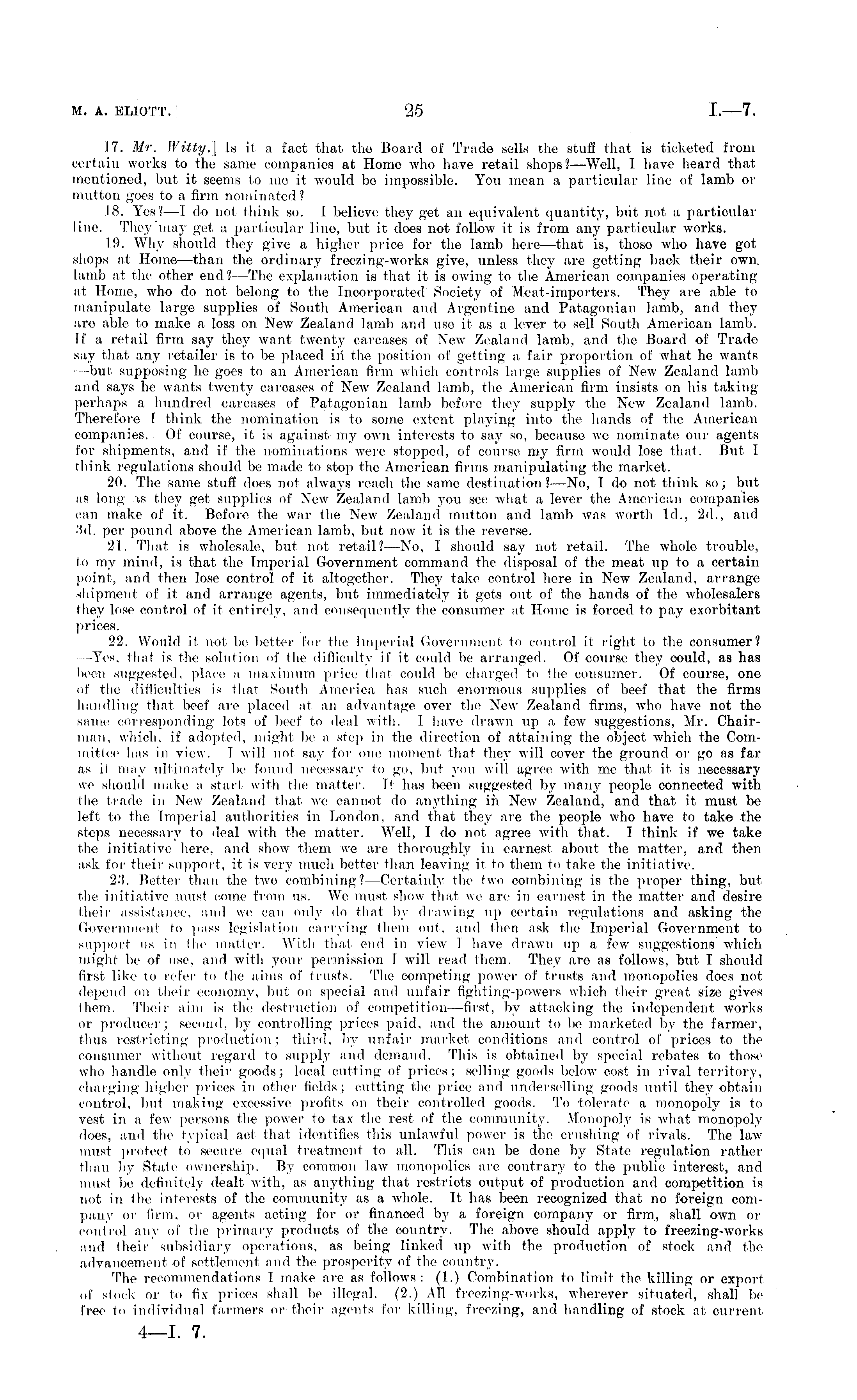 17. Mr. Witty.] Is it a fact that the Board of Trade sells the stuff that is ticketed from certain works to the same companies at Home who have retail shops?— Well, I have heard that mentioned, but it seems to mo it would be impossible. You mean a particular line of lamb or mutton goes to a firm nominated? 18. Yes? —I do not think so. I believe they get an equivalent quantity, but, not a particular line. They'may get a particular line, but it does not follow it is from any particular works. 19. Why should they give a higher price for the lamb here —that is, those who have got shops at Horne —than the ordinary freezing-works give, unless they are getting back their own lamb at the other end? —The explanation is that it is owing to the American companies operating at Home, who do not belong to the Incorporated Society of Meat-importers. They are able to manipulate large supplies of South American and Argentine and Patagonian lamb, and they are able to make a loss on New Zealand lamb and use it as a lever to sell South American lamb. If a retail firm say they want twenty carcases of New Zealand lamb, and the Board of Trade say that any retailer is to be placed iii the position of getting a fair proportion of what he wants —but supposing he goes to an American firm which controls largo supplies of New Zealand lamb and says he wants twenty carcases of New Zealand lamb, the American firm insists on his taking perhaps a hundred carcases of Patagonian lamb before they supply the New Zealand lamb. Therefore I think the nomination is to some extent playing into the hands of the American companies. Of course, it is against my own interests to say so, because we nominate our agents for shipments, and if the nominations were stopped, of course my firm would lose that. But I think regulations should be made to stop the American firms manipulating the market. 20. The same stuff does not always reach the same destination? —No, I do not think so; but as long is they get supplies of New Zealand lamb you see what a lever the American companies can make of it. Before the war the New Zealand mutton and lamb was worth Id., 2d., and 3d. per pound above the American lamb, but now it is the reverse. 21. That is wholesale, but not retail?—No, I should say not retail. The whole trouble, to my mind, is that the Imperial Government command the disposal of the meat up to a certain point, and then lose control of it altogether. They take control here in New Zealand, arrange shipment of it and arrange agents, but immediately it gets out of the hands of the wholesalers they lose control of it entirely, and consequently the consumer at Home is forced to pay exorbitant prices. 22. Would it not bo better for the Imperial Government, to control it right to the consumer? —Yes. that is the solution of the difficulty if it could be arranged. Of course they could, as has been suggested, place a maximum price that could be charged to the consumer. Of course, one of the difficulties is that South America has such enormous supplies of beef that the firms handling that beef are placed at an advantage over the New Zealand firms, who have not the same corresponding lots of beef to deal with. I have drawn up a, few suggestions, Mr. Chairman, which, if adopted, might be a step in the direction of attaining the object, which the Committee has in view. 1 will not say for one moment that they will cover the ground or go as far as it may ultimately be found necessary to go, but you will agree with me that it is necessary we should make a start with the matter. It has been suggested by many people connected with the trade in New Zealand that we cannot do anything in New Zealand, and that it must be left to the Imperial authorities in London, and that they are the people who have to take the steps necessary to deal with the matter. Well, T do not agree with that. I think if we take the initiative here, and show them we are thoroughly in earnest about the matter, and. then ask for their support, it is very much better than leaving it to them to take the initiative. 23. Better than the two combining? —Certainly, the two combining is the proper thing, but the initiative must come from us. We must show that we are in earnest in the matter and desire their assistance, and we can only do that by drawing up certain regulations and asking the Government to pass legislation carrying them out, and then ask the Imperial Government to support us in the matter. With that end in view J have drawn up a few suggestions which might be of use, and with your permission I will read them. They are as follows, but I should first like to refer to the aims of trusts. The competing power of trusts and monopolies does not depend on their economy, but: on special and unfair fighting-powers which their great size gives them. Their aim is the destruction of competition—first, by attacking the independent works or producer; second, by controlling prices paid, and the amount to be marketed by the farmer, thus restricting production ; third, by unfair market conditions and control of prices to the consumer without regard to supply and demand. This is obtained by special rebates to those who handle only their goods; local cutting of prices; selling goods below cost in rival territory, charging higher prices in other fields; cutting the price and underselling goods until they obtain control, but making excessive profits on their controlled goods. To tolerate a monopoly is to vest in a few persons the power to tax the rest of the community. Monopoly is what monopoly does, and the typical act that identifies this unlawful power is the crushing of rivals. The law must protect to secure equal treatment to all. This can be done by State regulation rather than by State ownership. By common law monopolies are contrary to the public interest, and must be definitely dealt with, as anything that restricts output of production and competition is not in the interes