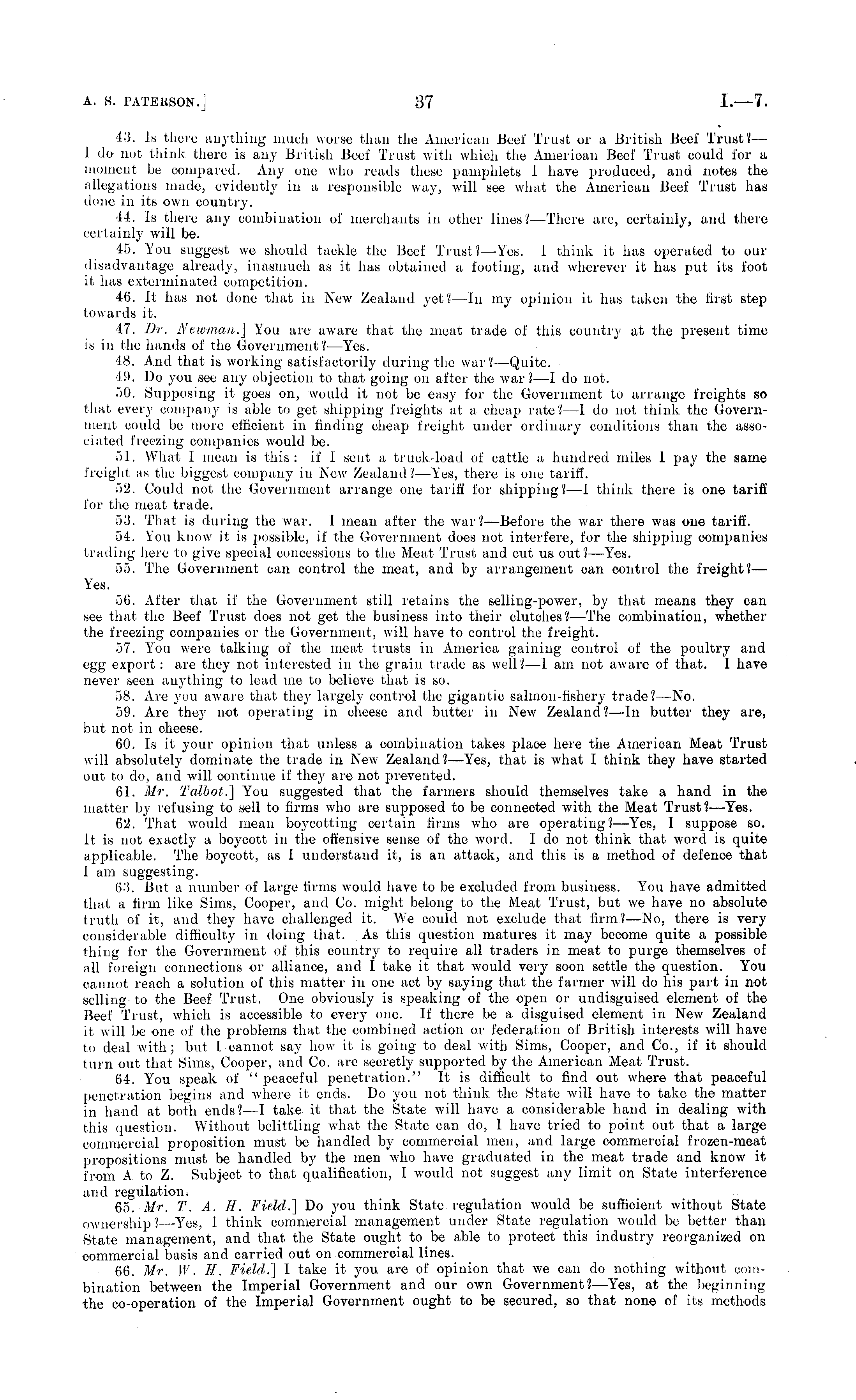 43. Is there anything much worse than the American Beef Trust or a British Beef Trust? — 1 do not think there is any British Beef Trust with which the American Beef Trust could for a moment be compared. Any one who reads these pamphlets 1 have produced, and notes the allegations made, evidently in a responsible way, will see what the American Beef Trust has done in its own country. 44. Is there any combination of merchants in other lines?— There are, certainly, and there certainly will be. 45. You suggest we should tackle the Beef Trust? —Yes. 1 think it has operated to our disadvantage already, inasmuch as it has obtained a footing, and wherever it has put its foot it has exterminated competition. 46. It has not done that in New Zealand yet?—ln my opinion it has taken the first step towards it. 47. Dr. Newman.] You are aware that the moat trade of this country at the present time is in the hands of the Government? —Yes. 48. And that is working satisfactorily during the war? —Quite. 49. Do you see any objection to that going on after the war? —I do not. 50. Supposing it goes on, would it not be easy for the Government to arrange freights so that every company is able to get shipping freights at a cheap rate?—l do not think the Government could be more efficient in finding cheap freight under ordinary conditions than the associated freezing companies would be. 51. What I mean is this: if 1 sent a truck-load of cattle a hundred miles 1 pay the same freight as the biggest company in New Zealand?— Yes, there is one tariff. 52. Could not the Government arrange one tariff for shipping?—l think there is one tariff for the meat trade. 53. That is during the war. 1 mean after the war?— Before the war there was one tariff. 54. You know it is possible, if the Government does not interfere, for the shipping companies trading here to give special concessions to the Meat Trust and cut us out? —Yes. 55. The Government can control the meat, and by arrangement can control the freight? — Yes. 56. After that if the Government still retains the selling-power, by that means they can see that the Beef Trust does not get the business into their clutches? —The combination, whether the freezing companies or the Government, will have to control the freight. 57. You were talking of the meat trusts in America gaining control of the poultry and egg export: are they not interested in the grain trade as well?—I am not aware of that. I have never seen anything to lead me to believe that is so. 58. Are you aware that they largely control the gigantic salmon-fishery trade?— No. 59. Are they not operating in cheese and butter in New Zealand?—hi butter they are, but not in cheese. 60. Is it your opinion that unless a combination takes place here the American Meat Trust will absolutely dominate the trade in New Zealand? —Yes, that is what I think they have started out to do, and will continue if they are not prevented. 61. Mr, Talbot.] You suggested that the farmers should themselves take a hand in the matter by refusing to sell to firms who are supposed to be connected with the Meat Trust? —Yes. 62. That would mean boycotting certain firms who are operating? —Yes, 1 suppose so. It is not exactlj' a boycott in the offensive sense of the word. Ido not think that word is quite applicable. The boycott, as I understand it, is an attack, and this is a method of defence that I am suggesting. 63. But a number of large firms would have to be excluded from business. You have admitted that a firm like Sims, Cooper, and Co. might belong to the Meat Trust, but we have no absolute truth of it, and they have challenged it. We could not exclude that firm?—No, there is very considerable difficulty in doing that. As this question matures it may become quite a possible thing for the Government of this country to require all traders in meat to purge themselves of all foreign connections or alliance, and 1 take it that would very soon settle the question. You cannot reach a solution of this matter in one act by saying that the farmer will do his part in not selling to the Beef Trust. One obviously is speaking of the open or undisguised element of the Beef Trust, which is accessible to every one. If there be a disguised element in New Zealand it will be one of the problems that the combined action or federation of British interests will have to deal with; but 1 cannot say how it is going to deal with Sims, Cooper, and Co., if it should turn out that Sims, Cooper, and Co. are secretly supported by the American Meat Trust. 64. You speak of " peaceful penetration." It is difficult to find out where that peaceful penetration begins and where it ends. Do you not think the State will have to take the matter in hand at both ends? —I take it that the State will have a considerable baud in dealing with this question. Without belittling what the State can do, 1 have tried to point out that a large commercial proposition must be handled by commercial men, and large commercial frozen-meat propositions must be handled by the men who have graduated in the meat trade and know it from Ato Z. Subject to that qualification, 1 would not suggest any limit on State interference and regulation. •65.- -Mr. T. A. 11. Field.] Do you think State regulation would be sufficient without State ownership?—Y r es, I think commercial management under State regulation would be better than State management, and that the State ought to be able to protect this industry reorganized on commercial basis and carried out on commercial lines._ 66. Mr. W. 11. Field.] I take it you are of opinion that we can do nothing without combination between the Imperial Government and our own Government?— Yes, at the beginning the co-operation of the Imperial Government ought to be secured, so that none of its methods