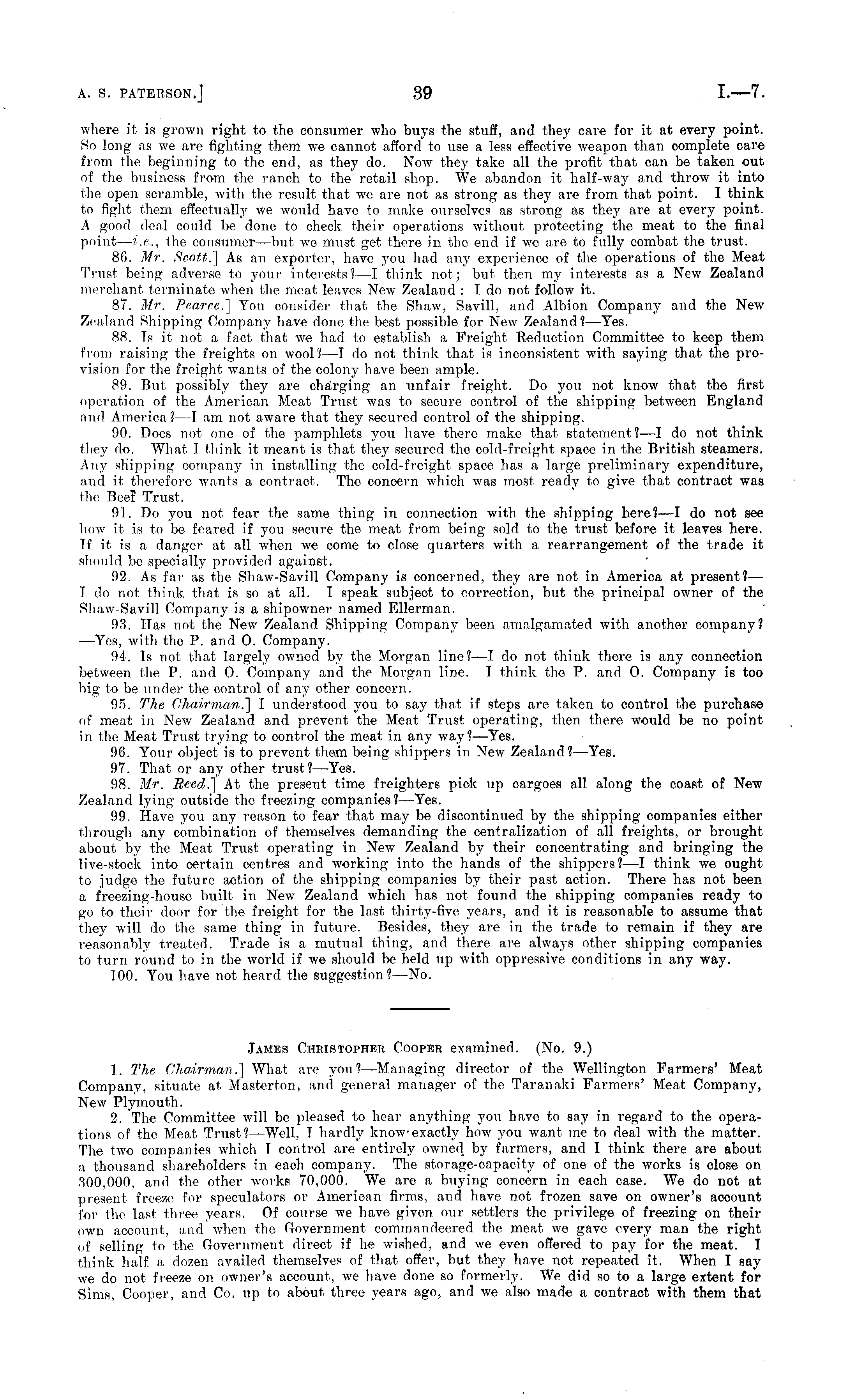 where it is grown right to the consumer who buys the stuff, and they care for it at every point. So long as we are fighting them we cannot afford to use a less effective weapon than complete care from the beginning to the end, as they do. Now they take all the profit that can be taken out of the business from the ranch to the retail shop. We abandon it half-way and throw it into the open scramble, with the result that we are not as strong as they are from that point. I think to fight them effectually we would have to make ourselves as strong as they are at every point. A good deal could be done to check their operations without protecting the meat to the final point— i.e., the consumer—but we must get there in the end if we are to fully combat the trust. 86. Mr. Scott.] As an exporter, have you had any experience of the operations of the Meat Trust being adverse to your interests? —I think not; but then my interests as a New Zealand merchant terminate when the meat leaves New Zealand : I do not follow it. 87. Mr. Pearce.] You consider that the Shaw, Savill, and Albion Company and the New Zealand Shipping Company have done the best possible for New Zealand? —Yes. 88. Ts it not a fact that we had to establish a Freight Reduction Committee to keep them from raising the freights on wool? —I do not think that is inconsistent with saying that the provision for the freight wants of the colony have been ample. 89. But possibly they are charging an unfair freight. Do you not know that the first operation of the American Meat Trust was to secure control of the shipping between England and America?—l am not aware that they secured control of the shipping, 90. Does not one of the pamphlets you have there make that statement? —I do not think they do. What I think it meant is that they secured the cold-freight space in the British steamers. Any shipping company in installing the cold-freight space has a large preliminary expenditure, and it therefore wants a contract. The concern which was most ready to give that contract was the Beer' Trust. 91. Do you not fear the same thing in connection with the shipping here? —I do not see how it is to be feared if you secure the meat from being sold to the trust before it leaves here. Tf it is a danger at all when we come to close quarters with a rearrangement of the trade it should be specially provided against. 92. As far as the Shaw-Savill Company is concerned, they are not in America at present?— I do not think that is so at all, I speak subject to correction, but the principal, owner of the Shaw-Savill Company is a shipowner named Ellerman. 93. Has not the New Zealand Shipping Company been amalgamated with another company? —Yes, with the P. and 0. Company. 94. Is not that largely owned by the Morgan line?—l do not think there is any connection between the P. and 0. Company and the Morgan line. I think the P. and 0. Company is too big to be under the control of any other concern. 95. The Chairman.] I understood you to say that if steps are taken to control the purchase of meat in New Zealand and prevent the Meat Trust operating, then there would be no point in the Meat Trust trying to control the meat in any way?— Yes. 96. Your object is to prevent them being shippers in New Zealand?— Yes. 97. That or any other trust? —Yes. 98. Mr. Reed!] At the present time freighters pick up cargoes all along the coast of New Zealand lying outside the freezing companies?— Yes. 99. Have you any reason to fear that may be discontinued by the shipping companies either through any combination of themselves demanding the centralization of all freights, or brought about by the Meat Trust operating in New Zealand by their concentrating and bringing the live-stock into certain centres and working into the hands of the shippers?—l think we ought to judge the future action of the shipping companies by their past action. There has not been a freezing-house built in New Zealand which has not found the shipping companies ready to go to their door for the freight for the last thirty-five years, and it is reasonable to assume that they will do the same thing in future. Besides, they are in the trade to remain if they are reasonably treated. Trade is a mutual thing, and there are always other shipping companies to turn round to in the world if we should be held up with oppressive conditions in any way. 100. You have not heard the suggestion?— No. James Christopher Cooper examined. (No. 9.) 1. The Chairman.] What are you?— Managing director of the Wellington Farmers' Meat Company, situate at Masterton, and general manager of the Taranaki Farmers' Meat Company, New Plymouth. 2. The Committee will be pleased to hear anything you have to say in regard to the operations of the Meat Trust?— Well, I hardly know-exactly how you want me to deal with the matter. The two companies which T control are entirely owned by farmers, and I think there are about a thousand shareholders in each company. The storage-capacity of one of the works is close on 300,000, and the other works 70,000. We are a buying concern in each case. We do not at present freeze for speculators or American firms, and have not frozen save on owner's account for the last three years. Of course we have given our settlers the privilege of freezing on their own account, and when the Government commandeered the meat we gave every man the right of selling to the Government direct if he wished, and we even offered to pay for the meat. I think half a dozen availed themselves of that offer, but they have not repeated it. When I say we do not freeze on owner's account, we have done so formerly. We did so to a large extent for Sims, Cooper, and Co. up to about three years ago, and we also made a contract with them that