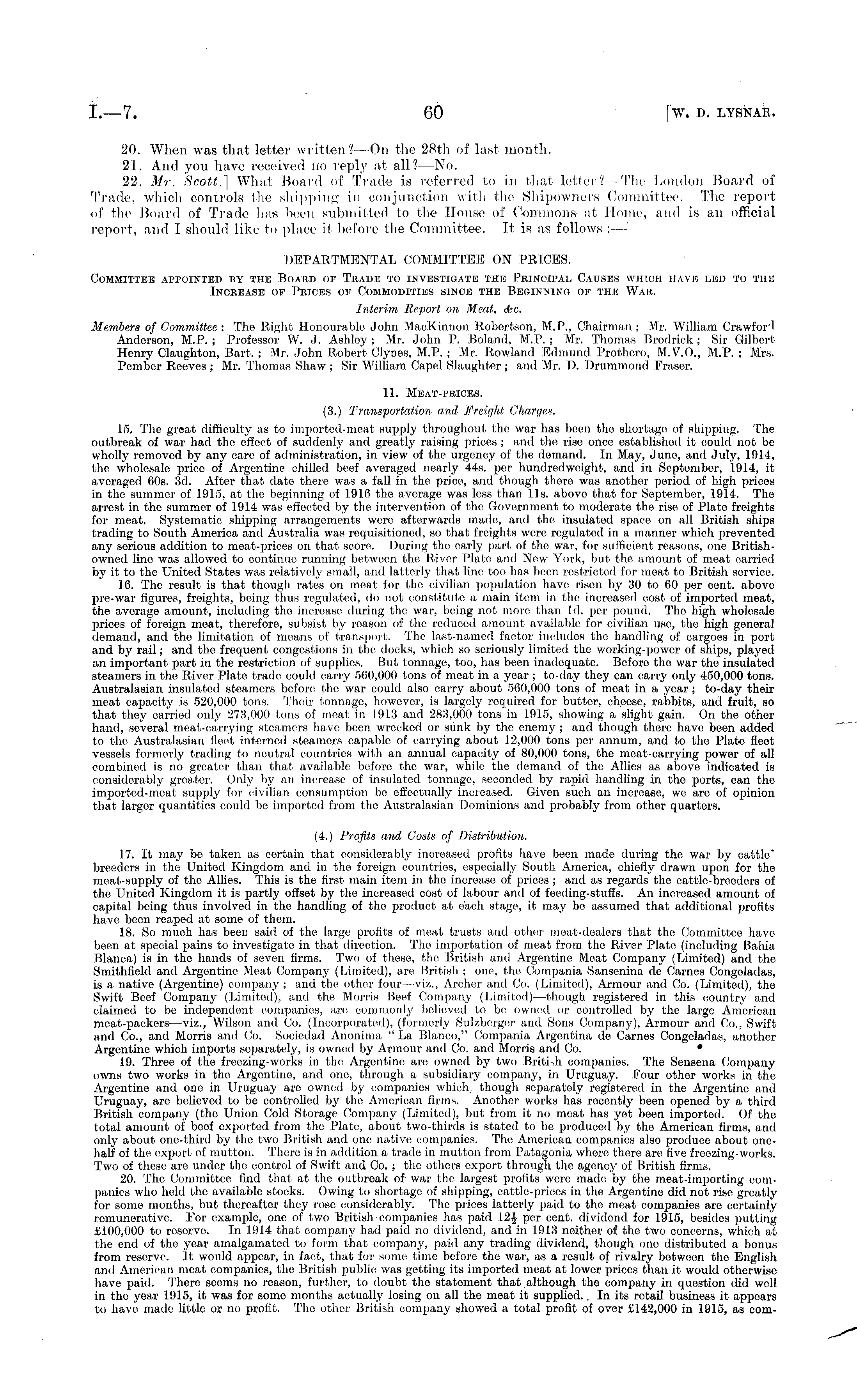 20. When was that letter written?—On the 28th of last, month. 21. And you have received no reply at all? —No. 22. Mr. Scott.] What Board of Trade is referred to in that letter?— The London Hoard of Trade, which controls the shipping in conjunction with the Shipowners Committee. The report of the Board of Trade has been submitted to the House of Commons at Home, ami is an official report, and I should like to place it before the Committee. It, is as follows : — DEPARTMENTAL COMMITTEE ON PRICES. Committee appointed by the Board of Trade to investigate the Principal Causes which have led to (the Increase or Prices or Commodities since the Beginning op the War. Interim Report on Meat, &c. Members of Committee : The Right Honourable John MacKinnon Robertson, M.P., Chairman ; Mr. William Crawford Anderson, M.P. ; Professor W. J. Ashley ; Mr. John P. Poland, M.P. ; Mr. Thomas Brodrick ; Sir Gilbert Henry Claughton, Bart. ; Mr. John Robert Clynes, M.P. ; Mr. Rowland Edmund Prothcro, M.V.0., M.P. ; Mrs. Pembcr Reeves ; Mr. Thomas Shaw ; Sir William Capcl Slaughter ; and Mr. D. Drummoud Fraser. 11. Meat-prices. (3.) Transportation and Freight Charges. 15. The great difficulty as to importcd-mcal supply throughout the war has been the shortage of shipping. The outbreak of war had the effect of suddenly and greatly raising prices ; anil the rise once established it could not be wholly removed by any care of administration, in view of the urgency of the demand. In May, June, and July, 1914, the wholesale price of Argentine chilled beef averaged nearly 445. per hundredweight, and in September, 1914, it averaged 60s. 3d. After that date there was a fall in the price, and though thcro was another period of high prices in tho summer of 1915, at the beginning of 1916 the average was less than lis. above that for September, 1914. The arrest in the summer of 1914 was effected by the intervention of the Government to moderate the rise of Plate freights for meat. Systematic shipping arrangements were afterwards made, and the insulated space on all British ships trading to South America and Australia was requisitioned, so that freights were regulated in a manner which prevented any serious addition to meat-prices on that score. During the early part of the war, for sufficient, reasons, one Britishowned line was allowed to continue running between the River Plate and Now York, but the amount of meat carried by it to tho United States was relatively small, and latterly that line too has been restricted for meat to British service. 16. Tho result is that though rates on meat for tho civilian population have risen by 30 to 60 per cent, above pre-war figures, freights, being thus regulated, do not constitute a main item in the increased cost of imported meat, the average amount, including tho increase during the war, being not more than Id. per pound. The high wholesale prices of foreign meat, therefore, subsist by reason of the reduced amount available for civilian use, tho high gcnoral demand, and tho limitation of moans of transport. The last-named factor includes the handling of cargoes in port and by rail; and the frequent congestions in the docks, which so seriously limited the working-power of ships, played an important part in the restriction of supplies. But tonnage, too, has been inadequate. Before the war the insulated steamers in the River Plate trade could carry 560,000 tons of meat in a year ; to-day they can carry only 450,000 tons. Australasian insulated steamers before the war could also carry about 500,000 tons of meat in a year ; to-day their meat capacity is 520,000 tons. Their tonnage, however, is largely required for butter, choose, rabbits, and fruit, so that they carried only 273,000 tons of meat in 1913 and 283,000 tons in 1915, showing a slight gain. On the other hand, several meat-carrying steamers have been wrecked or sunk by tho enemy ; and though there have been added to tho Australasian fleet interned steamers capable of carrying about 12,000 tons per annum, and to the Plate fleet vessels formerly trading to neutral countries with an annual capacity of 80,000 tons, the meat-carrying power of all combined is no greater than that available before tho war, while the demand of the Allies as above indicated is considerably greater. Only by an increase of insulated tonnage, seconded by rapid handling in tho ports, can the imported-mcat supply for civilian consumption be effectually increased. Given such an increase, we are of opinion that larger quantities could be imported from the Australasian Dominions and probably from other quarters. (4.) Profits and Costs of Distribution, 17. It may be taken as certain that considerably increased profits have boon made during the war by cattle" breeders in the United Kingdom and in the foreign countries, especially South America, chiefly drawn upon for the meat-supply of tho Allies. This is the first main item in tho increase of prices ; and as regards the cattle-breeders of the United Kingdom it is partly offset by the increased cost of labour and of feeding-stuffs. An increased amount of capital being thus involved in tho handling of tho product at each stage, it may bo assumed that additional profits have been reaped at some of them. 18. So much has been said of the largo profits of meat trusts and. other meat-dealers that tho Committee have been at special pains to investigate in that direction. The importation of moat from the River Plate (including Bahia Blanca) is in tho hands of seven firms. Two of these, the British and Argentine Meat Company (Limited) and the Smithfield and Argentine Meat Company (Limited), are British ; one, the Compania Sanscnina de Carnes Congcladas, is a native (Argentine) company ; and the other four—viz., Archer and Co. (Limited), Armour and Co. (Limited), the Swift Beef Company (Limited), and the Morris Beef Company (Limited) —though registered in this country and claimed to be independent companies, arc c