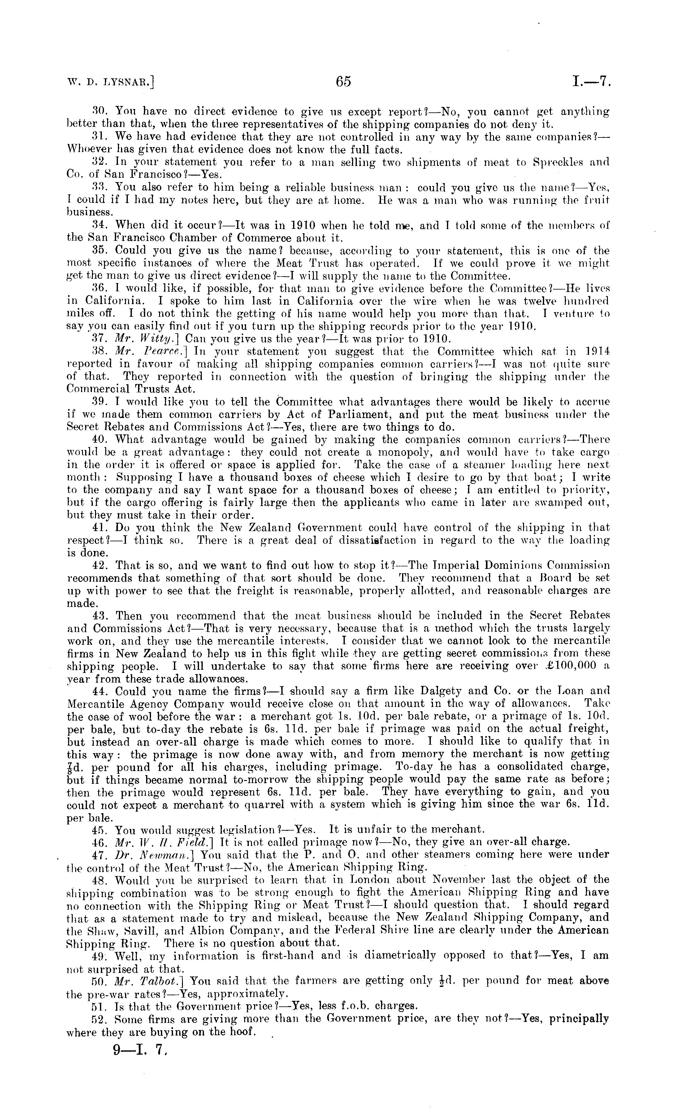 30. You have no direct evidence to give us except report?—No, you cannot get anything better than that, when the three representatives of the shipping companies do not deny it. 31. We have had evidence that they are not controlled in any way by the same companies? — Whoever has given that evidence does not know the full facts. 32. In your statement you refer to a man selling two shipments of meat to Spreokles and Co. of San Francisco?— Yes. 33. You also refer to him being a reliable business man : could you give us the name? —Yes, I could if I had my notes here, but they are at home. He was a man who was running the fruit business. 34. When did it occur?—lt was in 1910 when he told me, and I told some of the members of the San Francisco Chamber of Commerce about it. 35. Could you give us the name? because, according to your statement, this is one of the most specific instances of whore the Meat Trust has operated. If we could prove it we might get the man to give us direct, evidence?—l will supply the name to the Committee. 36. I would like, if possible, for that man to give evidence before the Committee? —He lives in California. I spoke to him last in California over the wire when he was twelve hundred miles off. Ido not think the getting of his name would help you more than that, I venture to say you can easily find out if you turn up the shipping records prior to the year 1910. 37. Mr. Witty.] Can you give us the year?—lt was prior to 1910. 38. Mr. Pearce.] In your statement you suggest that the Committee which sat in 1914 reported in favour of making all shipping companies common carriers? —I was not quite sure of that, They reported in connection with the question of bringing the shipping under the Commercial Trusts Act. 39. I would like you to tell the Committee what advantages there would be likely to accrue if we made them common carriers by Act of Parliament, and put the meat, business under the Secret Rebates and Commissions Act?— Yes, there are two things to do. 40. What advantage would be gained by making the companies common carriers?— There would be a great advantage: they could not create a monopoly, and would have to take cargo in the order it is offered or space is applied for. Take the case of a steamer loading here next month : Supposing I have a thousand boxes of cheese which I desire to go by that boat; I write to the company and say I want space for a thousand boxes of cheese; I am entitled to priority, but if the cargo offering is fairly large then the applicants who came in later are swamped out, but they must take in their order. 41. Do you think the New Zealand Government could have control of the shipping in that respect?—l think so. There is a great deal of dissatisfaction in regard to the way the loading is done. 42. That is so, and we want to find out how to stop it? —The Imperial Dominions Commission recommends that something of that sort should be done. They recommend that a Board be set up with power to see that the freight, is reasonable, properly allotted, and reasonable charges are made. 43. Then you recommend that the meat business should be included in the Secret Rebates and Commissions Act? —That is very necessary, because that is a method which the trusts largely work on, and they use the mercantile interests. I consider that we cannot look to the mercantile firms in New Zealand to help us in this fight while they are getting secret commissions from these shipping people. I will undertake to say that some firms here are receiving over £100,000 a. year from these trade allowances. 44. Could you name the firms? —I should say a firm like Dalgety and Co. or the Loan and Mercantile Agency Company would receive close on that amount in the way of allowances. Take the case of wool before the war : a merchant got Is. lOd. per bale rebate, or a primage of Is. lOd. per bale, but to-day the rebate is 6s. lid. per bale if primage was paid on the actual freight, but instead an over-all charge is made which comes to more. I should like to qualify that in this way : the primage is now done away with, and from memory the merchant is now getting fd. per pound for all his charges, including primage. To-day he has a consolidated charge, but if things became normal to-morrow the shipping people would pay the same rate as before; then the primage would represent 6s. lid. per bale. They have everything to gain, and you could not expect a merchant to quarrel with a system which is giving him since the war 6s. lid. per bale. 45. You would suggest legislation?— Yes. It is unfair to the merchant. 46. Mr. W. 11. Field.] It is not called primage now?—No, they give an over-all charge. 47. Dr. Newman.] You said that the P. and O. and other steamers coming here were under the control of the Meat Trust?—No, the American Shipping Ring. 48. Would you be surprised to learn that in London about November last the object of the shipping combination was to be strong enough to fight the American Shipping Ring and have no connection with the Shipping Ring or Meat Trust?—l should question that. I should regard that as a statement made to try and mislead, because the New Zealand Shipping Company, and the Shaw, Savill, and Albion Company, and the Federal Shire line are clearly under the American Shipping Ring. There is no question about that. 49. Well, my information is first-hand and is diametrically opposed to that?— Yes, I am not surprised at that. 50. Mr. Talbot.] You said that the farmers are getting only £d. per pound for meat above the pre-war rates? —Yes, approximately. 51. Is that the Government price?— Yes, less f.o.b. charges. 52. Some firms are giving more than the Government price, are they not?— Yes, principally where they are buying on the hoof.