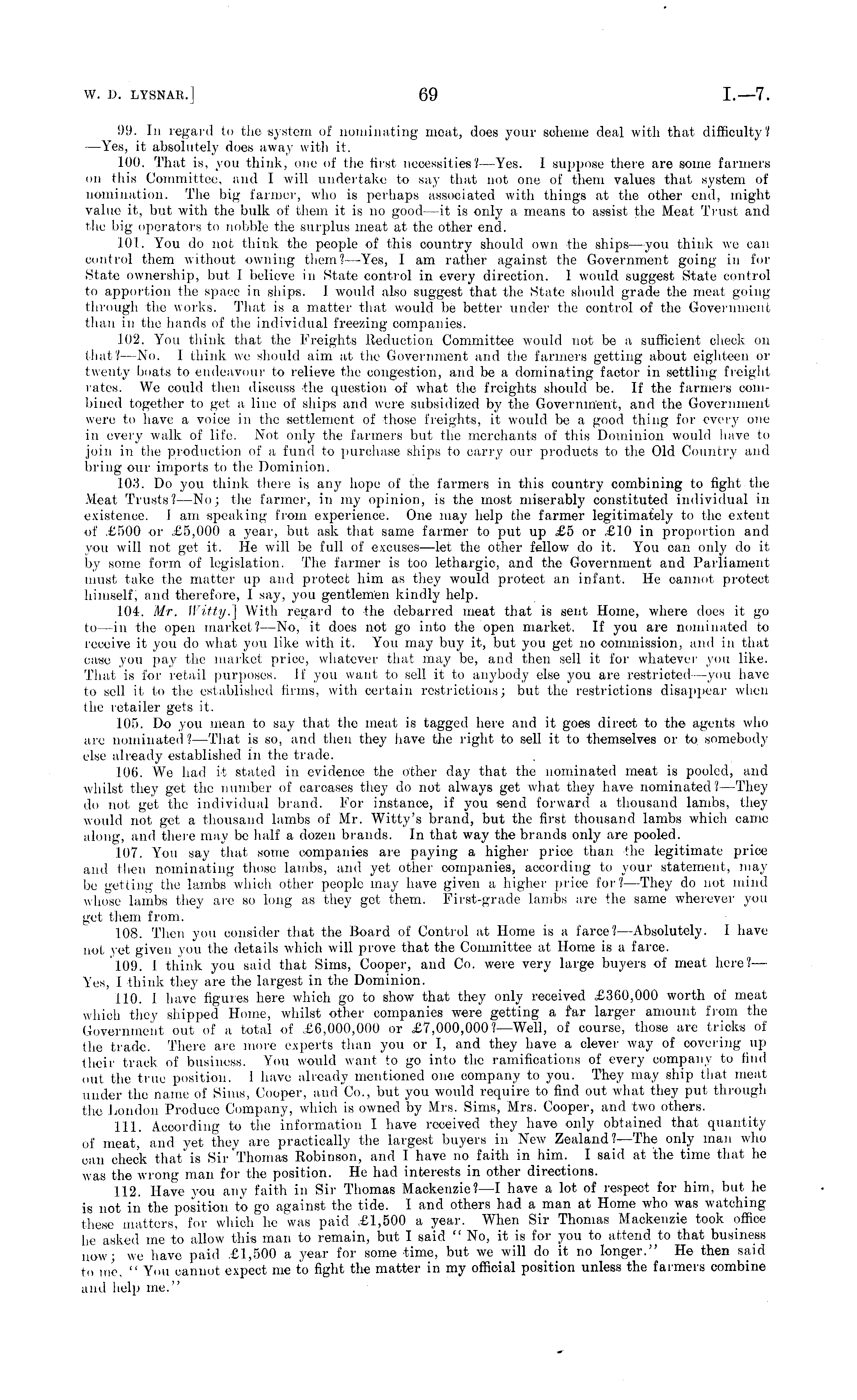 99. In regard to the system of nominating meat, does your scheme deal wdth that difficulty? —Yes, it absolutely does away with it. 100. That is, you think, one of the first necessities?— Yes. I suppose there are some farmers on this Committee, and I will undertake to say that not one of them values that system of nomination. The big farmer, who is perhaps associated with things at the other end, might value it, but with the bulk of them it is no good—it is only a means to assist the Meat Trust and the big operators to nobble the surplus meat at the other end. 101. You do not think the people of this country should own the ships—you think we can control them without owning them? —Yes, I am rather against the Government going in for State ownership, but, I believe in State control in every direction. 1 would suggest State control to apportion the space in ships. I would also suggest that the State should grade the meat going through the works. That is a matter that would be better under the control of the Government than in the hands of the individual freezing companies. 102. You think that the Freights Reduction Committee would not be a sufficient check on that? —No. I think we should aim at the Government and the farmers getting about eighteen or twenty boats to endeavour to relieve the congestion, and be a dominating factor in settling freight rates. We could then discuss the question of what the freights should be. If the farmers combined together to get. a line of ships and were subsidized by the Government, and the Government were to have a voice in the settlement of those freights, it would be a good thing for every one in every walk of life. Not only the farmers but the merchants of this Dominion would have to join in the production of a fund to purchase ships to carry our products to the Old Country and bring our imports to the Dominion. 103. Do you think there is any hope of the farmers in this country combining to fight the Meat Trusts? —No; the farmer, in my opinion, is the most miserably constituted individual in existence. I am speaking from experience. One may help the farmer legitimately to the extent of .£5OO or £5,000 a year, but ask that same farmer to put up £5 or £10 in proportion and you will not get it. He will be full of excuses —let the other fellow do it. You can only do it by some form of legislation. The farmer is too lethargic, and the Government and Parliament must take the matter up and protect him as they would protect, an infant. He cannot protect himself, and therefore, 1 say, you gentlemen kindly help. 104. Mr. Witty.] With regard to the debarred meat that is sent Home, where does it go to—in the open market? —No, it does not go into the open market. If you are nominated to receive it you do what you like with it. You may buy it, but you get no commission, and in that case you pay the market price, whatever that may be, and then sell it for whatever you like. That is for retail purposes. If you want to sell it to anybody else you are restricted —you have to sell it to the established firms, with certain restrictions; but the restrictions disappear when the retailer gets it. 105. Do you mean to say that the meat is tagged here and it goes direct to the agents who are nominated ? —That is so, and then they have the right to sell it to themselves or to. somebody else already established in the trade. 106. We had it stated in evidence the other day that the nominated meat is pooled, and whilst they get the number of carcases they do not always get what they have nominated?-—They do not get the individual brand. For instance, if you send forward a thousand lambs, they would not get a thousand lambs of Mr. Witty's brand, but the first thousand lambs which came along, and there may be half a dozen brands. In that way the brands only are pooled. 107. You say that some companies are paying a higher price than the legitimate price and then nominating those lambs, and yet other companies, according to your statement, may be getting the lambs which other people may have given a higher price for?— They do not mind whose lambs they are so long as they get them. First-grade lambs are the same wherever you get them from. 108. Then you consider that the Board of Control at Home is a farce? —Absolutely. I have not yet given you the details which will prove that the Committee at Home is a farce. 109. I think you said that Sims, Cooper, and Co. were very large buyers of meat here? — Yes, I think they are the largest in the Dominion. 110. I have figures here which go to show that they only received ,£360,000 worth of meat which they shipped Home, whilst other companies were getting a far larger amount from the Government out of a total of £6,000,000 or £7,000,000? —Well, of course, those are tricks of the trade. There are more experts than you or I, and they have a clever way of covering up their track of business. You would want to go into the ramifications of every company to find out the true position. 1 have already mentioned one company to you. They may ship that meat under the name of Sims, Cooper, and Co., but you would require to find out wdiat they put through the London Produce Company, which is owned by Mrs. Sims, Mrs. Cooper, and two others. 111. According to the information I have received they have only obtained that quantity of meat, and yet they are practically the largest buyers in New Zealand? —The only man who can check that is Sir' Thomas Robinson, and I have no faith in him. I said at the time that he was the wrong man for the position. He had interests in other directions. 112. Have you any faith in Sir Thomas Mackenzie? —I have a lot of respect for him, but he is not in the position to go against the tide. I and others had a man at Home who was watching these matters, for which he was paid £1,500 a year. When Sir Thomas Mackenzie took office he asked me to allow this man to remain, but I said " No, it is for