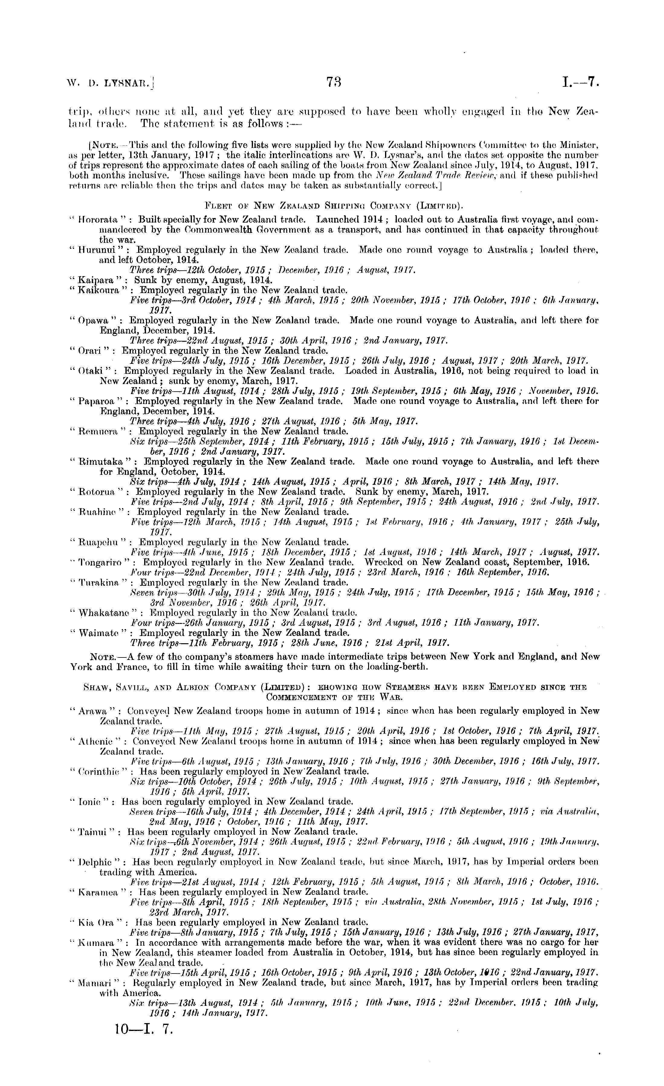 trip, others none at all, and yet they arc supposed to have been wholly engaged in the New Zealand trade. The statement is as follows: — (Note.- This and the following five lists were supplied by the New Zealand Shipowners Committee to the Minister, as per letter, 13th January, 1917 ; the italic interlineations arc W. I). Lysnar's, and the dates set opposite the number of trips represent the, approximate dates of each sailing of the boats from New Zealand since July, 1914, to August, 191 7. both months inclusive. Those sailings have been made up from the New Zealand Trade Review, and if these published returns arc reliable then tho trips and dates may be taken as substantially correct.] Fleet oe New Zealand Shiitino Company (LrMmiD). " Hororata " : Built specially for New Zealand trade. Launched 1914 ; loaded out to Australia first voyage, and commandeered by the Commonwealth Government as a transport, and has continued in that capacity throughout tho war. " Hurunui" : Employed regularly in the New Zealand trade. Made one round voyage to Australia ; loaded there, and left October, 1914. Three trips — l2th October, 1915 ; December, 1916 ; August, 1917. " Kaipara " : Sunk by enemy, August, 1914. " Kaikoura " : Employed regularly in the New Zealand trade. Five trips—3rd October, 1914 ; 4th March, 1915 ; 20th November, 1915 ; 17th October, 1910 : 6th January, 1917. " Opawa " : Employed regularly in the New Zealand trade. Made one round voyage to Australia, and left there for England, December, 1914. Three trips — 22nd August, 1915 ; 30th April, 1916 ; 2nd January, 1917. " Orari " : Employed regularly in the Now Zealand trade. Five trips—24th July, 1915 ; 16th December, 1915 ; 26th July, 1916 ; August, 1917 ; 20th March, 1917. " Otaki " : Employed regularly in the New Zealand trade. Loaded in Australia, 1910, not being required to load in New Zealand ; sunk by enomy, March, 1.917. Five trips—llth August, 1914 ; 28th July, 1915 ; 19th September, 1915 ; oth May, 1910 ; November, 1910. " Paparoa " : Employed regularly in the New Zealand trade. Made one round voyage to Australia, and left there for England, December, 1914. Three trips—4th July, 1916 ; 27th August, 1910 ; sth May, 1917. " Remuera " : Employed regularly in the New Zealand trade. Six trips—2sth September, 1914 ; 11th February, 1915 ; 15th, July, 1915 ; 7th January, 1.910 ; Ist December, 1910 ; 2nd, January, 1917. " Rimutaka " : Employed regularly in the New Zealand trade. Made one round voyage to Australia, and left there for England, October, 1914. Six trips—4th July, 1914 ; 14th August, 1915 ; April, 1910 ; Bth March, 1917 ; 14th May, 1917. " Rotorua " : Employed regularly in the Now Zealand trade. Sunk by enemy, March, 1917. Five trips—2nd July, 1914 ; Bth April, 1915 ; 9th September, 1915 ; 24th August, 1910 ; 2nd July, 1917. " Buahinc " : Employed regularly in the New Zealand trade. Five trips—l2th March,, 1915 ; 14th August, 1915 ; Ist February, 1916 ; 4th January, 1917 ; 25th July, 1917. " Ruapehu " : Employed regularly in the New Zealand trade. Five trips—4th June, 1915 ; 18th December, 1915 ; Ist August, 1910 ; 14th March, 1917 ; August, 1917. " Tongariro " : Employed regularly in the New Zealand trade. Wrecked on Now Zealand coast, September, 1910. Four trips—22nd December, 1911 ; 24th July, 1915 ; 23rd March, 1916 : 16th September, 1910. " Turakina " : Employed regularly in the New Zealand trade. Seven trips—3oth July, 1914 ; 29th Mag, 1915 ; 24th July, 1915 ; 17th December, 1915 ; 15th May, 1910 ; 3rd November, 1916 ; 261h April, 1917. " Whakatane " : Employed regularly in tho Now Zealand trade. Four trips — 26th, January, 1915 ; 3rd August, 1915 ; 3rd August, 1910 ; 11th January, 1917. " Waimate " : Employed regularly in the New Zealand trade. Three trips—llth February, 1915 ; 28th June, 1916 ; 21st April, 1917. Note. —A few of the company's steamers have made intermediate trips between New York and England, and New York and France, to fill in time while awaiting their turn on the loading-berth. Shaw, Savill, and Albion Company (Limited) : ehowino how Steamers havk been Employed since the Commencement oh- the War. " Arawa " : Conveyed New Zealand troops home in autumn of 1914 ; since when has been regularly employed in New Zealand trade. Five trips—llth May, 1915 ; 27th August, 1915 ; 20th April, 1910 ; Ist October, 1910 ; 7th April, 1917. " Athenic " : Conveyed New Zealand troops home in autumn of 1914 ; since when has been regularly employed in New Zealand trade. Five trips—Oih August, 1915 ; 13th January, 1910 ; 7th July, 1916 ; 30th December, 1916 ; 16th July. 1917. " Corinthie " : Has been regularly employed in New Zealand trade. Six trips—loth October, 1914 ; 20th July, 1915 ; 10th August. 11)15 ; 271h January, 1910 ; 9th September, 1910 ; sth April, 1917, " lonic " : Has been regularly employed in New Zealand trade. Seven trips — loth July, 1914 ; 4lh December, 1914 ; 24th April, 1915 ; 17th September, 1915 ; via Australia, 2nd May, 1916 ; October, 1916 ; 11th May, 1917. " Tainui " : Has been regularly employed in New Zealand trade. Six trips--Sth November, 1914'■ ; 26th August, 1915 ; 22nd February, 1916 ; sth August. 1910 ; 19th January, 1917 ; 2nd August, 1917. " Delphic " : Has been regularly employed in New Zealand trade, but since March, 1917, has by Imperial orders been trading with America. Five trips—-21st August, 1914 ; 12th, February, 1915 ; slh August, 1915; Bth March, 1916 ; October, 1910. " Karumea " : Has been regularly employed in New Zealand trade. Five trips — Bth April, 1915 ; 18th September, 1915 ; via Australia, 28th November, 1915 ; Ist July, 1910 ; 23rd March, 1917. " Kia Ora " : Has been regularly employed in New Zealand trade. Five trips—Bth January, 1915 ; 7th July, 1915 ; 15th January, 1910 ; 13th July, 1910 ; 27th January, 1917, " Kumara " : In accordance with arrangements made before the war, when it was evident there was no cargo for 