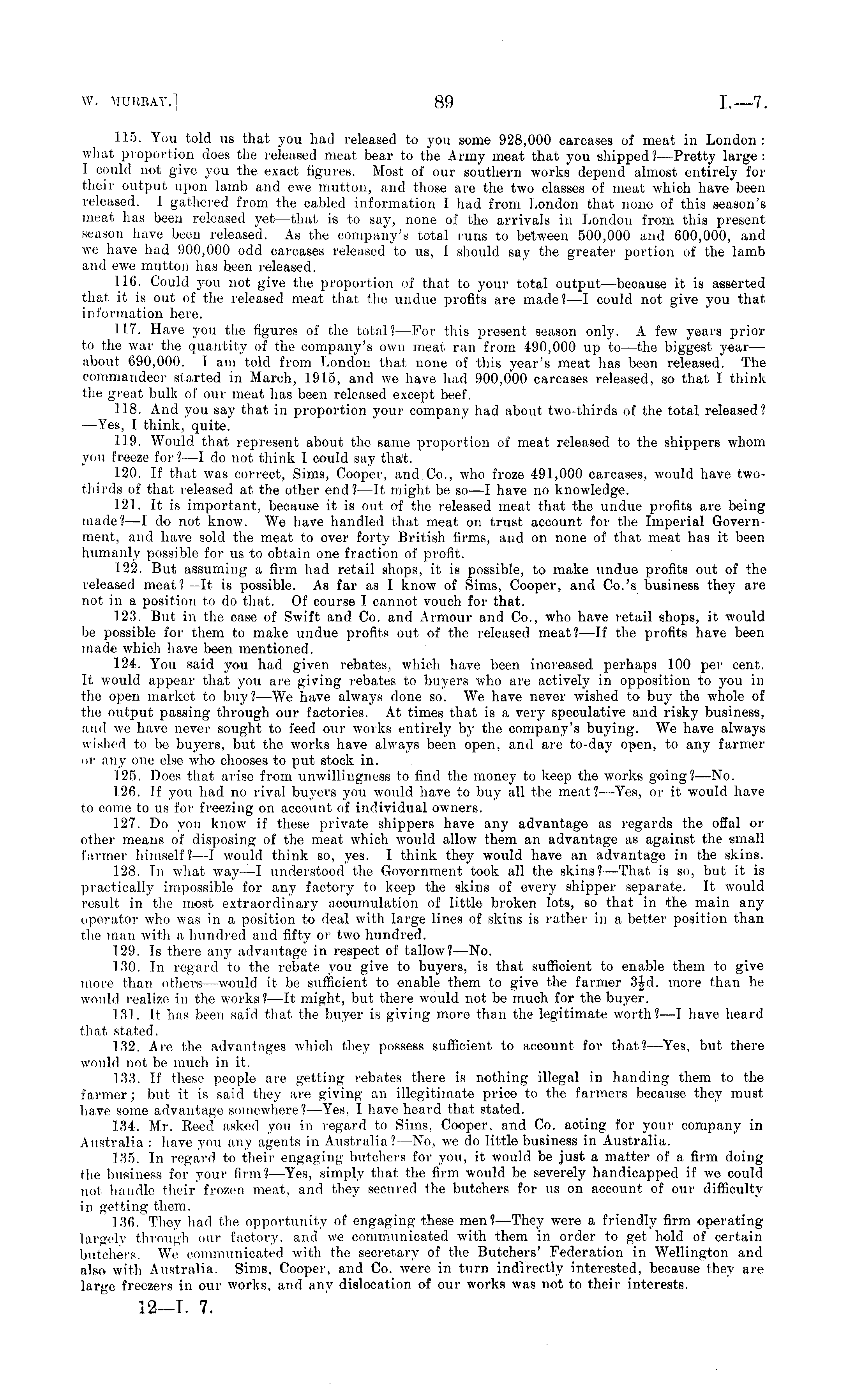 115. You told us that you had released to you some 928,000 carcases of meat in London: what proportion does the released meat bear to the Army meat that you shipped? —Pretty large : I could not give you the exact figures. Most of our southern works depend almost entirely for their output upon lamb and ewe mutton, and those are the two classes of meat which have been released. I gathered from the cabled information I had from London that none of this season's meat has been released yet—that is to say, none of the arrivals in London from this present season have been released. As the company's total runs to between 500,000 and 600,000, and we have had 900,000 odd carcases released to us, I should say the greater portion of the lamb and ewe mutton has been released. 116. Could you not give the proportion of that to your total output —because it is asserted that it is out of the released meat that the undue profits are made?—l could not give you that information here. 117. Have you the figures of the total?— For this present season only. A few years prior to the war the quantity of the company's own meat ran from 490,000 up to —the biggest year — about 690,000. I am told from London that none of this year's meat has been released. The commandeer started in March, 1915, and we have had 900,000 carcases released, so that I think the great bulk of our meat has been released except beef. 118. And you say that in proportion your company had about two-thirds of the total released? —Yes, I think, quite. 119. Would that represent about the same proportion of meat released to the shippers whom you freeze for ?—I do not think I could say that. 120. If that was correct, Sims, Cooper, and.Co., who froze 491,000 carcases, would have twothirds of that released at the other end? —It might be so —I have no knowledge. 121. It is important, because it is out of the released meat that the undue profits are being made? —I do not know. We have handled that meat on trust account for the Imperial Government, and have sold the meat to over forty British firms, and on none of that meat has it been humanly possible for us to obtain one fraction of profit. 122. But assuming a firm had retail shops, it is possible, to make undue profits out of the released meat? —It is possible. As far as I know of Sims, Cooper, and Co.'s business they are not in a position to do that. Of course I cannot vouch for that. 123. But in the case of Swift and Co. and Armour and Co., who have retail shops, it would be possible for them to make undue profits out, of the released meat?—lf the profits have been made which have been mentioned. 1.24. You said you had given rebates, which have been increased perhaps 100 per cent. It would appear that you are giving rebates to buyers who are actively in opposition to you in the open market to buy?—We have always done so. We have never wished to buy the whole of the output passing through our factories. At times that is a very speculative and risky business, and we have never sought to feed our works entirely by the company's buying. We have always wished to be buyers, but the works have always been open, and are to-day open, to any farmer or any one else who chooses to put stock in. 125. Does that arise from unwillingness to find the money to keep the works going?— No. 126. If you had no rival buyers you would have to buy all the meat?— Yes, or it would have to come to us for freezing on account of individual owners. 127. Do you know if these private shippers have any advantage as regards the offal or other means of disposing of the meat which would allow them an advantage as against the small farmer himself?—l would think so, yes. I think they would have an advantage in the skins. 128. Tn what way —I understood the Government took all the skins? —That is so, but it is practically impossible for any factory to keep the skins of every shipper separate. It would result in the most extraordinary accumulation of little broken lots, so that in the main any operator who was in a position to deal with large lines of skins is rather in a better position than the man with a hundred and fifty or two hundred. 129. Is there any advantage in respect of tallow?— No. 130. In regard to the rebate you give to buyers, is that sufficient to enable them to give more than others —would it be sufficient to enable them to give the farmer 3jd. more than he would realize in the works? —It might, but there would not be much for the buyer. 131. It has been said that the buyer is giving more than the legitimate worth? —I have heard that stated. 132. Are the advantages which they possess sufficient to account for that?— Yes, but there would not be much in it. 133. If these people are getting rebates there is nothing illegal in handing them to the farmer; but it is said they are giving an illegitimate price to the farmers because they must have some advantage somewhere?— Yes, I have heard that stated. 134. Mr. Reed asked you in regard to Sims, Cooper, and Co. acting for your company in Australia : have you any agents in Australia? —No, we do little business in Australia, 135. In regard to their engaging butchers for you, it would be just a matter of a firm doing the business for your firm?— Yes, simply that the firm would be severely handicapped if we could not handle their frozen meat, and they secured the butchers for us on account of our difficulty in getting them. 136. They had the opportunity of engaging these men?— They were a friendly firm operating largely through our factory, and we communicated with them in order to get hold of certain butchers. We communicated with the secretary of the Butchers' Federation in Wellington and also with Australia. Sims, Cooper, and Co. were in turn indirectly interested, because they are large freezers in our works, and any dislocation of our works was not to their interests.