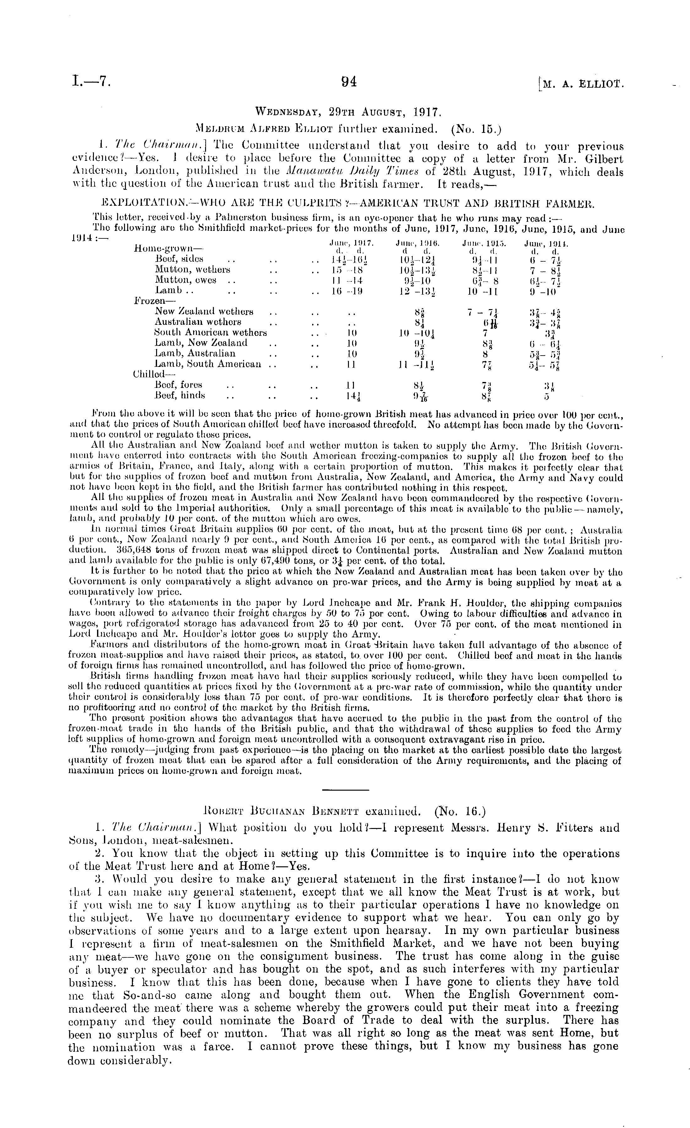 Wednesday, 29th August, 1917. Meldrum Alfred Elliot further examined. (No. 15.) 1. The Chairman.] The Committee understand that you desire to add to your previous evidence? —Yes. J desire to place before the Committee a copy of a letter from Mr. Gilbert Anderson, London, published in the Manawatti Daily Times of 28th August, 1917, which deals with the question of the American trust and the British farmer. It reads, —■ EXPLOITATION—WHO ARE THE CULPRITS ?—AMERICAN TRUST AND BRITISH FARMER. This letter, reoeivedby a Palmerston business firm, is an eye-opener that he who runs may read: — Tho following are tho Smithfield market-prices for the months of June, 1917, June, 191 (i, June, 1915, and June lit 14 . ~ June, 1917. June, 1016. June, 1015. June, mil. Home-grown— (1 . ~. (l ~ ~. ~ ~ ~ Beef, sides .. ~ .. 1-U Hi.', 1(1.'. I2j 9J I I (>-?.', Mutton, wethers .. .. 15 18 LO*— Si II 7- 8i Mutton, owos .. .. II II 9J-10 li? 8 (U-- 7.1 Lamb.. .. .. .. 16-19 12-134 111 -II 9-10 Frozen— New Zealand wethers .. .. .. Sjj 7 - 7.] :ij 4'j> Australian wethers .. .. .. 8j (ifj 34- 3j South American wethers .. 11l 10 -101 7 3| Lamb, Now Zealand .. .. 11l 9i )SJ Ii (ij Lamb, Australian .. ..10 I)] S 54- 5J Lamb, South American .. .. II 11 -Hi 7; 64- 5; Chilled— " 8 Beef, fores .. .. .. II Si 7-J 34 Beef, hinds .. .. .. 14.J il> sj .5 t'roiii the above it will be scon that the price of home-grown British meat has advanced in price over 100 por cent., and that the prices of South American chilled beef have increased threefold. No attempt has been made by the Government to control or regulate those prices. All the Australian anil New Zoaland beef and wether mutton is taken to supply tho Army. The British Government have entcrrcd into contracts with the South. American freezing-companies to supply all tho frozen beef to tho armies of Britain, Prance, and Italy, along with a certain proportion of mutton. This makes it pcifccl.ly clear that but for tho supplies of frozen beef and mutton from Australia, Now Zealand, and America, the Army and Navy could not have been kept in the Held, and the British farmer has contributed nothing in this respect. All tho supplies of frozen meat in Australia and Now Zealand have boon commandeered by the respective Governments and sold to the Imperial authorities. Only a small percentage, of this meat is available'to the public — namely, lamb, and probably 10 per cent, of the mutton winch aro owes. In normal times Great Britain supplies 00 per cent, of the meat,, but at the present time 08 per cent. ; Australia 0 per cent., New Zealand nearly 9 per cent., and South America Hi per cent,., as compared with the total British production. 865,648 tons of frozen meat was shipped direct to Continental ports. Australian and New Zoaland mutton and lamb available for the public is only 07,490 tons, or .'ij per cont. of the total. It is furthor to bo noted that tho prico at which tho .Now Zoaland and Australian meat has been taken over by the Government is only comparatively a slight advance on pro-war prices, and the Army is being supplied by meat at a comparatively low prico. Contrary to the statements in the paper by Lord Inchcape and Mr. Prank H. Houlder, the shipping companies havo boon allowed to advance their freight charges by 50 to 75 por cent. Owing to labour difficulties and advance, in wages, port refrigerated storage has adavanccd from 25 to 40 por cent. Over 75 per cont. of tho meat mentioned in Lord Inchcape and Mr. Houlder's letter goes to supply the Army. Farmers and distributors of the home-grown moat in Great "Britain have taken full advantage of the. absence of frozen meat-supplies and have raised their prices, as stated, to over 100 per cent. Chilled beef and meat in the hands of foreign firms has remained uncontrolled, and has followed the price of homo-grown. British firms handling frozen meat havo had their supplies seriously reduced, while they have been compelled to sell the roduccd quantities at prices fixed by the Government at a pre-war rate of commission, while the quantity under their control is considerably less than 75 por cont. of pre-war conditions. It is therefore pcifectiy clear that there is no profiteering and no control of the market by the British firms. The present position shows the advantages that have accrued to the public in the past from the control of tho frozen-meat trade in tho hands of tho British public, and that the withdrawal of these supplies to feed the Army loft supplies of home-grown and foreign moat uncontrolled with a consequent extravagant riso in prico. Tho remedy —judging from past experience - ia the placing on tho market at tho earliest possible date the largost quantity of frozen moat that can be spared after a full consideration of the Army requirements, and tho placing of maximum prices on home-grown and foreign moat. Robert Buchanan Bennett examined. (No. l(i.) 1. The Chairman,,] What position do you hold?— 1 represent Messrs. Henry S. hitters and Sons, London, meat-salesmen. 2. You know that the object in setting up this Committee is to inquire into the operations of the Meat Trust here and at Home?— Yes. 3. Would you desire to make any general statement in the first instance? —I do not know that I can make any general statement, except that we all know the Meat Trust is at work, but if you wish me to say 1 know anything as to their particular operations I have no knowdedge on the subject. We have no documentary evidence to support what we hear. You can only go by observations of some years and to a large extent upon hearsay. In my own particular business 1 represent a firm of meat-salesmen on the Smithfield Market, and we have not been buying any meat —we havo gone on the consignment business. The trust has come along in the guise of a buyer or speculator and has bought on the spot, and as such interferes with my particular business. I know that this has been done, because when I have gone 