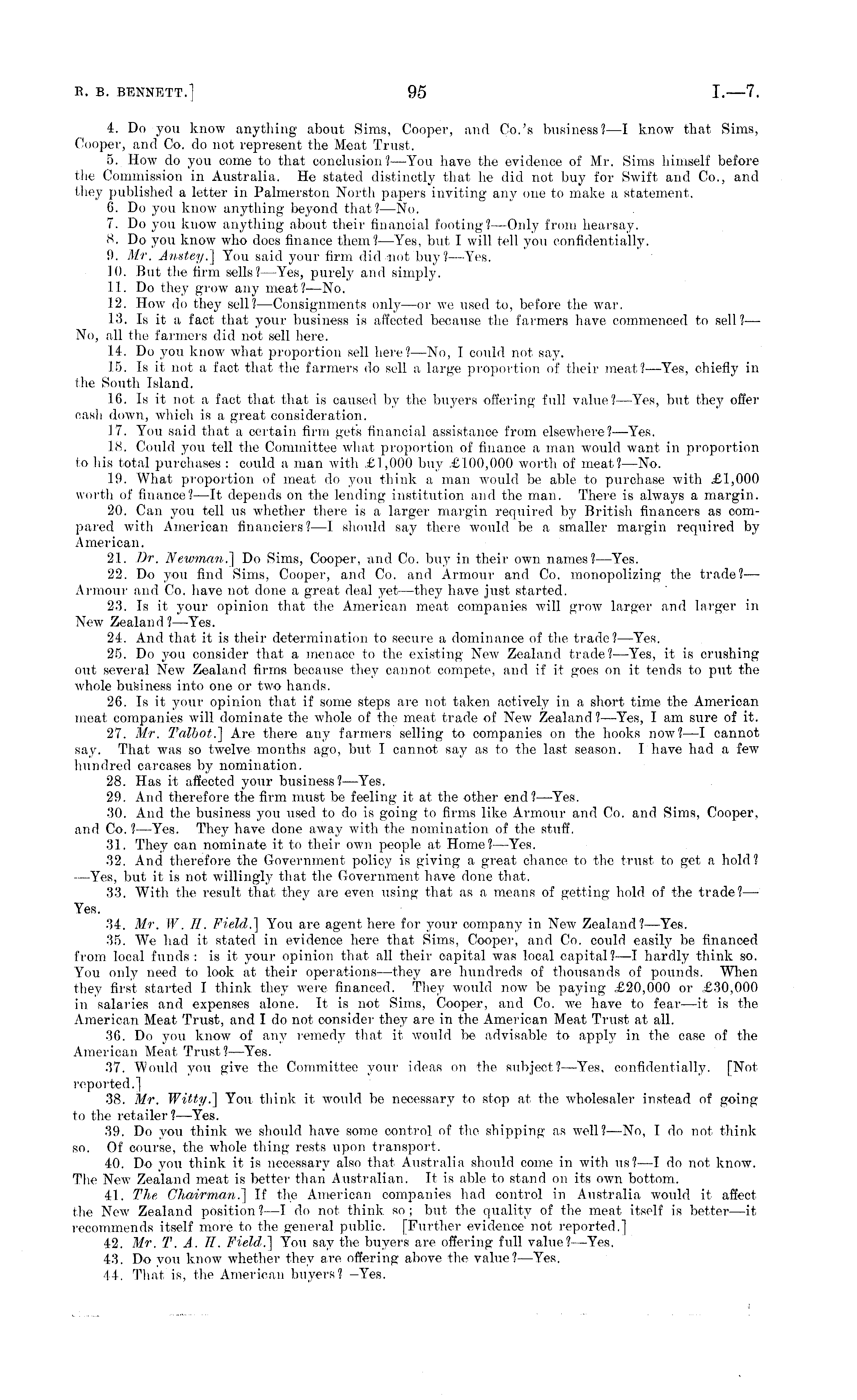 4. Do you know anything about Sims, Cooper, and Co.'s business? —I know that Sims, Cooper, and Co. do not represent the Meat Trust. 5. How do you come to that conclusion? —You have the evidence of Mr. Sims himself before the Commission in Australia. He stated distinctly that he did not buy for Swift and Co., and they published a letter in Palmerston North papers inviting any one to make a statement. 6. Do you know anything beyond that?— No. 7. Do you know anything about their financial footing?— Only from hearsay. 8. Do you know who docs finance them?— Yes, but I will tell you confidentially. 9. Mr, Anstey.] You said your firm did not buy?— Yes. 10. But the firm sells ? —Yes, purely and simply. 11. Do they grow any meat?— No. 12. How do they sell?— Consignments only —or we used to, before the war. 13. Is it a fact that your business is affected because the farmers have commenced to sell?— No, all the farmers did not sell here. 14. Do you know what proportion sell here?—No, I could not, say. 15. Is it not a fact that the farmers do sell a large proportion of their meat?— Yes, chiefly in the South Island. 16. Is it not a fact that that is caused by the buyers offering full value? —Yes, but they offer cash down, which is a great consideration. 17. You said that a certain firm gets financial assistance from elsewhere? —Yes. 18. Could you tell the Committee what proportion of finance a man would want in proportion to his total purchases : could a man with .£l,OOO buy .£lOO,OOO worth of meat? —No. 19. What proportion of meat do you think a man would be able to purchase with .£l,OOO worth of finance?—lt depends on the lending institution and the man. There is always a margin. 20. Can you tell us whether there is a larger margin required by British financers as compared with American financiers? —I should say there would be a, smaller margin required by American. 21. Dr. Newman.] Do Sims, Cooper, and Co. buy in their own names? —Yes. 22. Do you find Sims, Cooper, and Co. and Armour and Co. monopolizing the trade? — Armour and Co. have not done a great deal yet —they have just started. 23. Is it your opinion that the American meat companies will grow larger and larger in New Zealand? —Yes. 24. And that it is their determination to secure a dominance of the trade? —Yes. 25. Do you consider that a menace to the existing New Zealand trade?— Yes, it is crushing out several New Zealand firms beoause they cannot compete, and if it goes on it tends to put the whole business into one or two hands. 26. Is it your opinion that if some steps are not taken actively in a short time the American meat companies will dominate the whole of the meat trade of New Zealand? —Yes, I am sure of it. 27. Mr. Talbot.] Are there any farmers selling to companies on the hooks now?—l cannot say. That was so twelve months ago, but I cannot say as to the last season. I have had a few hundred carcases by nomination. 28. Has it affected your business? —Yes. 29. And therefore the firm must be feeling it at the other end?— Yes. 30. And the business you used to do is going to firms like Armour and Co. and Sims, Cooper, and Co. ? —Yes. They have done away with the nomination of the stuff. 31. They can nominate it to their own people at Home?— Yes. 32. And therefore the Government policy is giving a great chance to the trust to get a hold? —Yes, but it is not willingly that the Government have done that. 33. With the result that they are even using that as a means of getting hold of the trade? —■ Yes. 34. Mr. W. 11. Field.] You are agent here for your company in New Zealand?— Yes. 35. We had it stated in evidence here that, Sims, Cooper, and Co. could easily be financed from local funds: is it your opinion that all their capital was local capital?—l hardly think so. You only need to look at their operations—they are hundreds of thousands of pounds. When they first started I think they were financed. They would now be paying £20,000 or £30,000 in salaries and expenses alone. It is not Sims, Cooper, and Co. we have to fear —it is the American Meat Trust, and I do not consider they are in -the American Meat Trust at all. 36. Do you know of any remedy that it, would be advisable to apply in the case of the American Meat, Trust?— Yes. 37. Would you give the Committee your ideas on the subject?— Yes, confidentially. [Not reported.] 38. Mr. Witty.] You think, it, would be necessary to stop at the wholesaler instead of going to the retailer ?—Yes. 39. Do you think we should have some control of the shipping as well?—No, I do not think so. Of course, the whole thing rests upon transport. 40. Do you think it is necessary also that Australia should come in with us? —I do not know. The New Zealand meat is better than Australian. It is able to stand on its own bottom. 41. The Chairman.] If the American companies had control in Australia would it affect the New Zealand position?—l do not think so; but the quality of the meat, itself is better —it recommends itself more to the general public. [Further evidence not reported.] 42. Mr. T. A. 11. Field.} You say the buyers are offering full value?— Yes. 43. Do you know whether they are offering above the value?— Yes. 44. That is, the American buyers? -Yes.