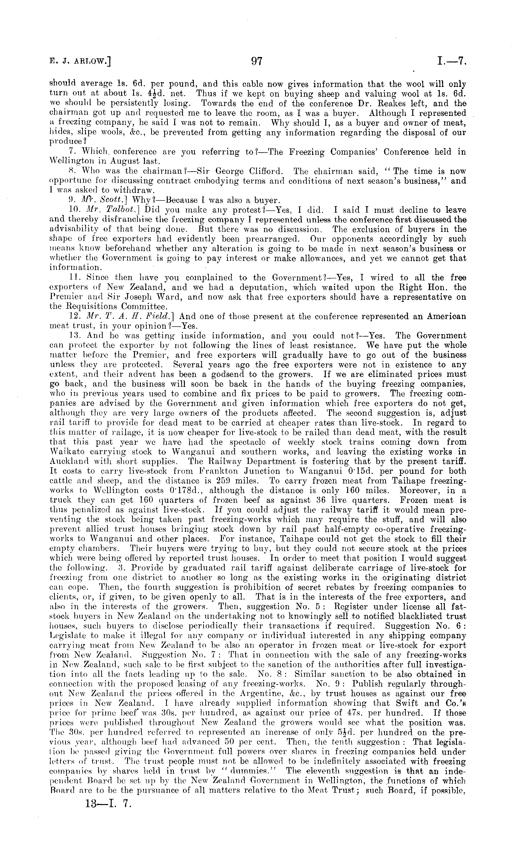 should average Is. 6d. per pound, and this cable now gives information that the wool will only turn out at about Is. 4Jd. net. Thus if we kept on buying sheep and valuing wool at Is. 6d. we should be persistently losing. Towards the end of the conference Dr. Reakes left, and the chairman got up and requested me to leave the room, as I was a buyer. Although I represented a freezing company, he said I was not to remain. Why should I, as a buyer and owner of meat, hides, slipe wools, &c, be prevented from getting any information regarding the disposal of our produce? 7. Which, conference are you referring to?— The Freezing Companies' Conference held in Wellington in August last. 8. Who was the chairman?— Sir George Clifford. The chairman said, "The time is now opportune for discussing contract embodying terms and conditions of next season's business," and I was asked to withdraw. 9. Mr. Scott.] Why?— Because I was also a buyer. 10. Mr. Talbot.] Did you make any protest?— Yes, I did. I said I must decline to leave and thereby disfranchise the freezing company I represented unless the conference first discussed the advisability of that being done. But there was no discussion. The exclusion of buyers in the shape of free exporters had evidently been prearranged. Our opponents accordingly by such means know beforehand whether any alteration is going to be made in next season's business or whether the Government is going to pay interest or make allowances, and yet we cannot get that information. 11. Since then have you complained to the Government?— Yes, I wired to all the free exporters of New Zealand, and we had a deputation, which waited upon the Right Hon. the Premier and Sir Joseph Ward, and now ask that free exporters should have a representative on the Requisitions Committee. 12. Mr. T. A. H. Field.] And one of those present at the conference represented an Amerioan meat trust, in your opinion?— Yes. 13. And he was getting inside information, and you could not?— Yes. The Government can protect the exporter by not following the lines of least resistance. We have put the whole matter before the Premier, and free exporters will gradually have to go out of the business unless they are proteoted. Several years ago the free exporters were not in existence to any extent, and their advent has been a godsend to the growers. If we are eliminated prices must go back, and the business will soon be back in the hands of the buying freezing companies, who in previous years used to combine and fix prices to be paid to growers. The freezing companies are advised by the Government and given information which free exporters do not get, although they are very large owners of the products affected. The second suggestion is, adjust rail tariff to provide for dead meat to be carried at cheaper rates than live-stock. In regard to this matter of railage, it is now cheaper for live-stock to be railed than dead meat, with the result that this past year we have had the spectacle of weekly stock trains coming down from Waikato carrying stock to Wanganui and southern works, and leaving the existing works in Auckland with short supplies. The Railway Department is fostering that by the present tariff. It costs to carry live-stock from Frankton Junction to Wanganui o'lsd. per pound for both cattle and sheep, and the distance is 259 miles. To carry frozen meat from Taihape freezingworks to Wellington costs 0'178d., although the distance is only 160 miles. Moreover, in a truck they can get 160 quarters of frozen beef as against 36 live quarters. Frozen meat is thus penalized as against live-stock. If you could adjust the railway tariff it would mean preventing the stock being taken past freezing-works which may require the stuff, and will also prevent allied trust houses bringing stock down by rail past half-empty co-operative freezingworks to Wanganui and other places. For instance, Taihape could not get the stock to fill their empty chambers. Their buyers were trying to buy, but they could not secure stock at the prices which were being offered by reported trust houses. In order to meet that position I would suggest the following. 3. Provide by graduated rail tariff against deliberate carriage of live-stock for freezing from one district to another so long as the existing works in tho originating district can cope. Then, the fourth suggestion is prohibition of secret rebates by freezing companies to clients, or, if given, to be given openly to all. That is in the interests of the free exporters, and also in the interests of the growers. Then, suggestion No. 5 : Register under license all fatstock buyers in New Zealand on the undertaking not to knowingly sell to notified blacklisted trust houses, such buyers to disclose periodically their transactions if required. Suggestion No. 6 : Legislate to make it illegal for any company or individual interested in any shipping company carrying meat from New Zealand to be also an operator in frozen meat or live-stock for export from New Zealand. Suggestion No. 7 : That in connection with the sale of any freezing-works in New Zealand, such sale to be first subject to the sanction of the authorities after full investigation into all the facts leading up to the sale. No. 8 : Similar sanction to be also obtained in connection with the proposed leasing of any freezing-works. No. 9 : Publish regularly throughout New Zealand the prices offered in the Argentine, <V,c, by trust houses as against our free prices in New Zealand. I have already supplied information showing that Swift and Co.'s price for prime beef was 30s. per hundred, as against our price of 475. per hundred. If those prices were published throughout New Zealand the growers would see what the position was. The 30s. per hundred referred to represented an increase of only s|d. per hundred on the previous year, although beef had advanced 50 per cent. Then, the tenth suggestion : That legislation be passed giving the